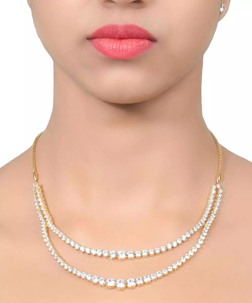 Elegant And Extravagant, This 2 Row Necklace From Our Eternal Collection Glistening With Graded Cubic Zirconia Is Perfect For That Special Evening Out. Polished In 18k Gold, It Comes With A Pair Of .75 Cent Round Stud Earrings. .