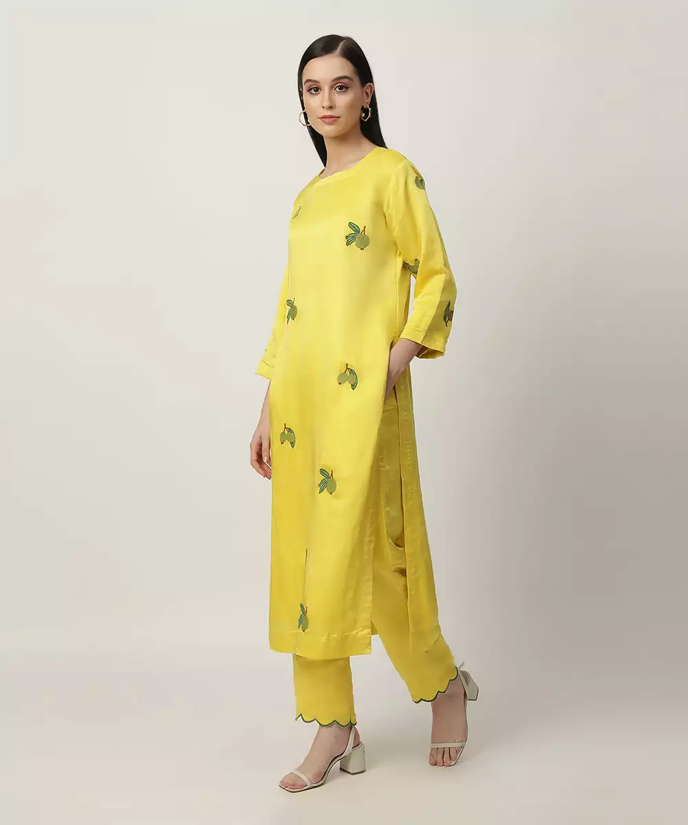Bright Yellow Colour Round Neck Kurta With Embroidery Detailing Is Paired With Straight Pants With Deep Green Scallop Detailing On The Hem. Deep Green Colour Dupatta With Scallop Detailing To Complete The Look.