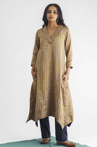 Plum Hand Embroidered Zari Stripe Kurta (With Slip) With Pant And Dupatta Colour: Plum Fabric: Tissue Components: 1 Kurta / 1 Pant / 1 Dupatta / 1 Slip