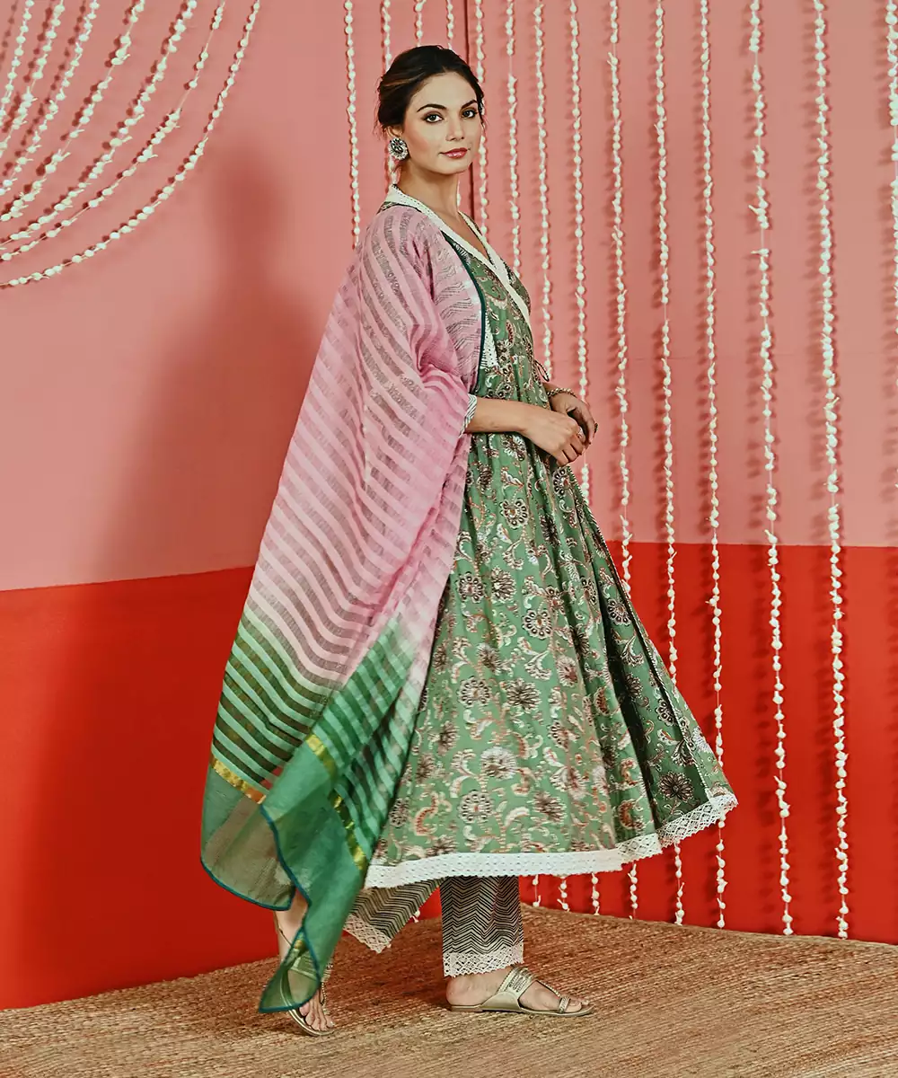 A Classic And Elegant Printed Anarkali Set In Color Green, Beautifully Crafted In Cotton Blend. It Features An Overlap Style With Tassels & Is Paired With An Cotton Ombre Dupatta & Pants.