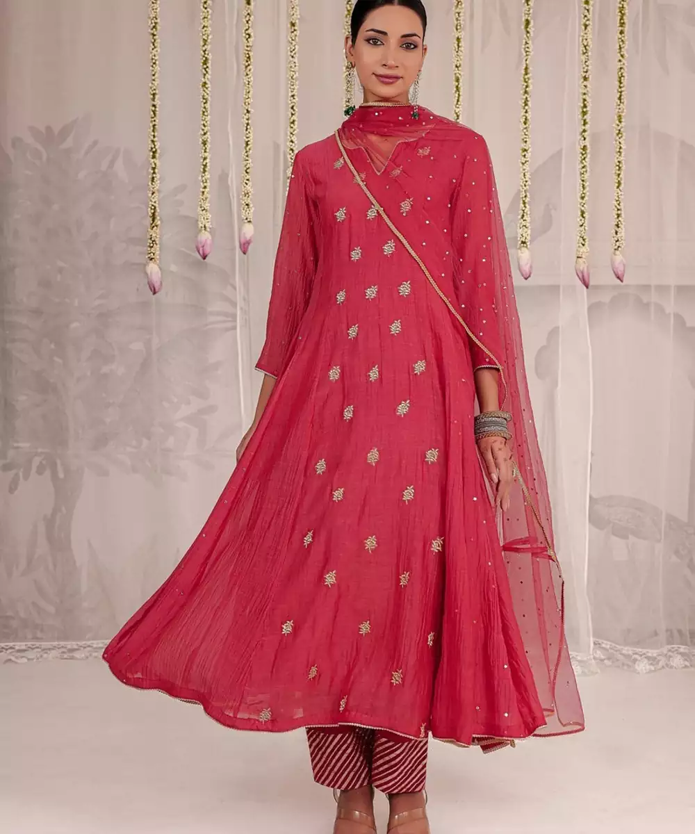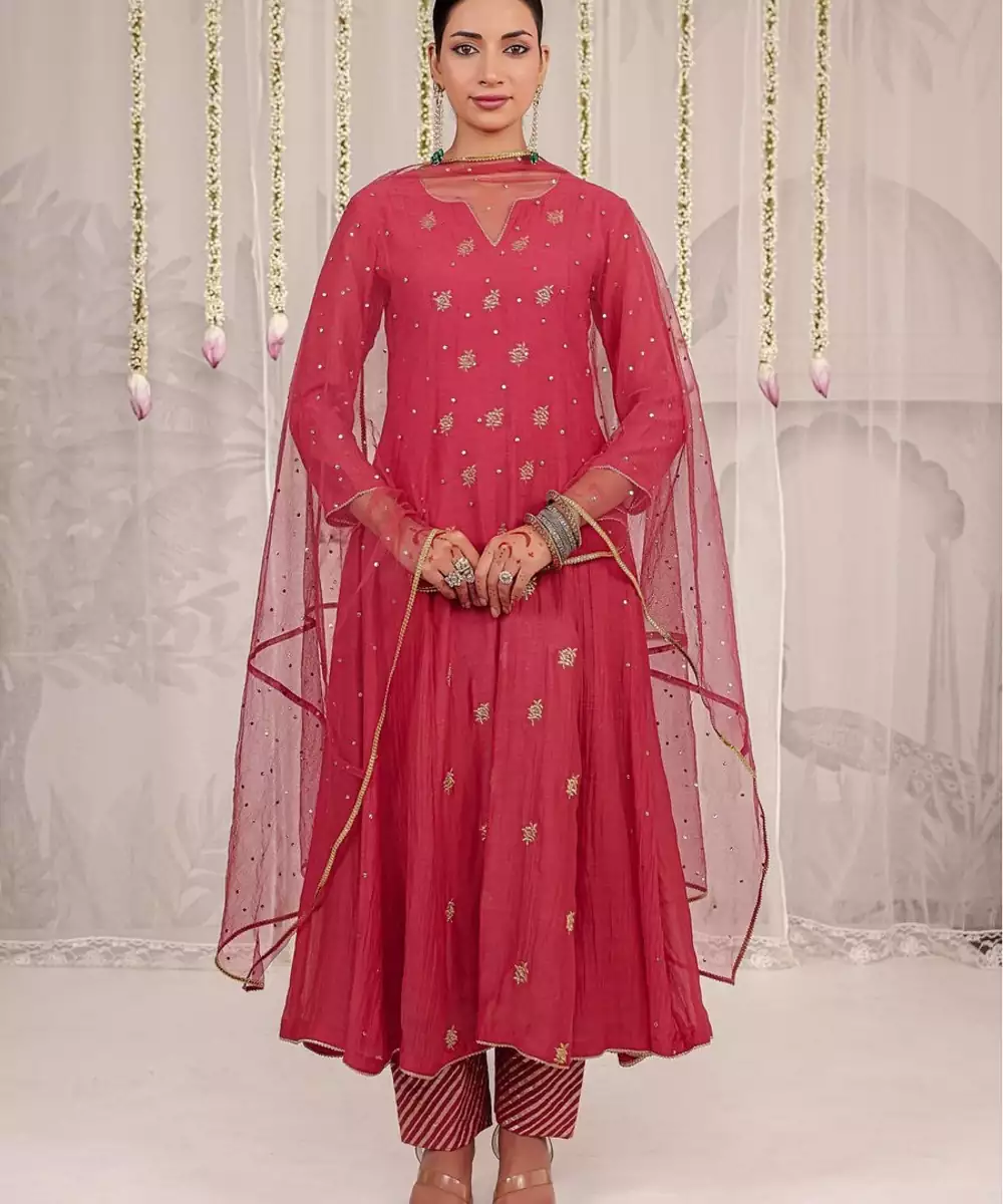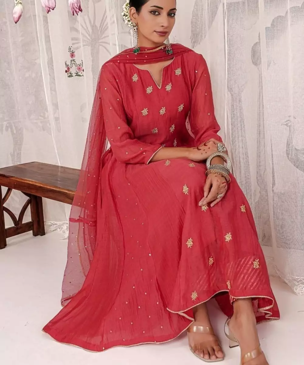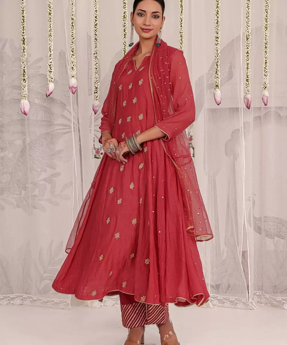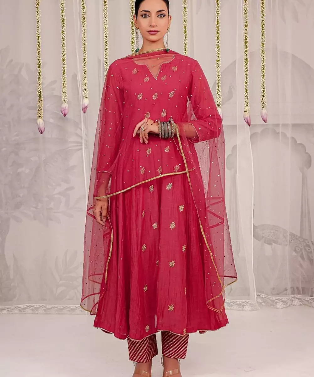 Exude Timeless Elegance In This Red Anarkali, Crafted From Pure Chanderi Fabric And Detailed With Delicate Gold Motifs. The Ensemble Is Paired With Matching Pants And A Soft Net Dupatta Adorned With All Over Mukaish Work. Graceful, Lightweight, And Festive, This Outfit Is Perfect For Weddings, Soirées, Or Traditional Celebrations.
