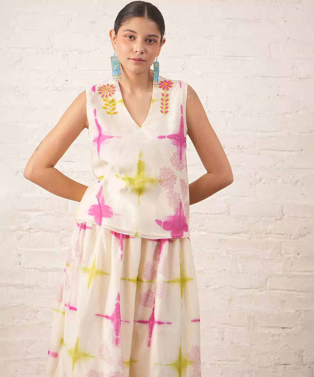 This Ivory Chanderi Co Ord Set Features Subtle Prints That Enhance Its Elegant And Understated Charm. The Lightweight Fabric Offers A Soft Sheen And Comfortable Fit. Ideal For Casual Or Festive Occasions, It Pairs Effortlessly With Minimal Accessories For A Clean And Sophisticated Look.