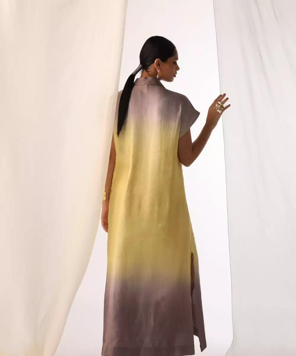 Wrapped In Airy Pastels Our Linen Satin Dip Dyed Dress In Dove Grey And Lemon , Adorned With Delicate French Knot Embroidery.