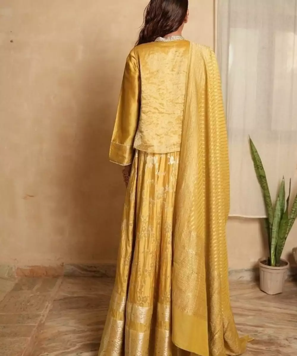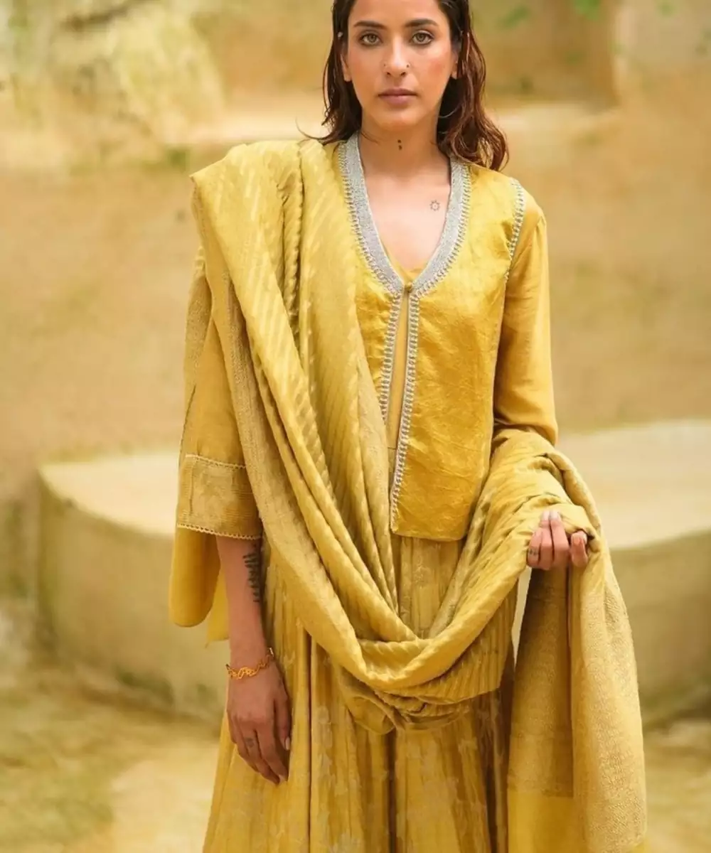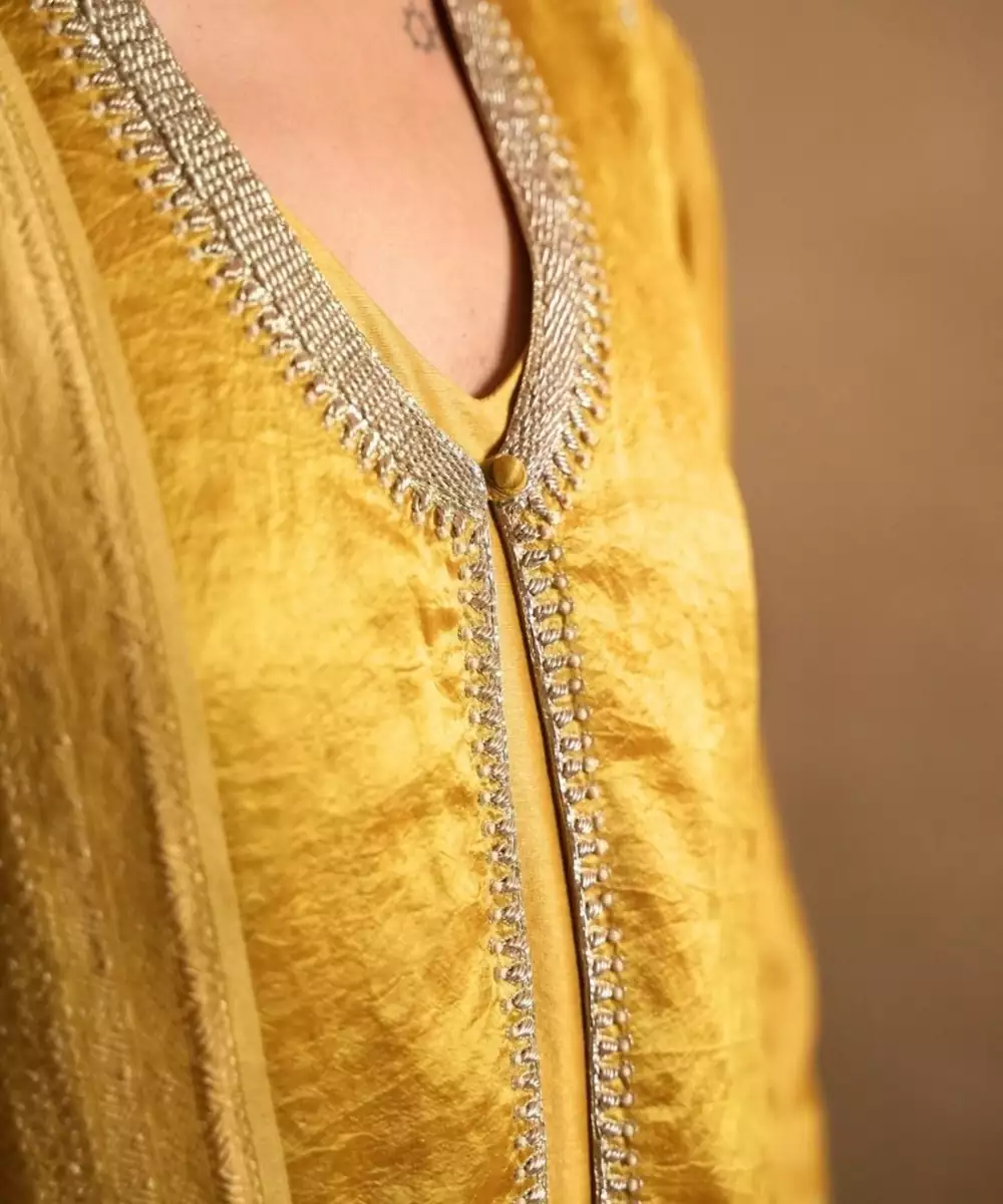 A Timeless Three Piece Ensemble In A Serene Mehndi Green. The Set Features A Classic Kurta Layered With A Beautifully Hand Embroidered Koti, Showcasing Exquisite Craftsmanship. Paired With Matching Pants For A Sleek Silhouette, The Look Is Elevated With A Striking Dupatta That Adds A Festive Contrast.