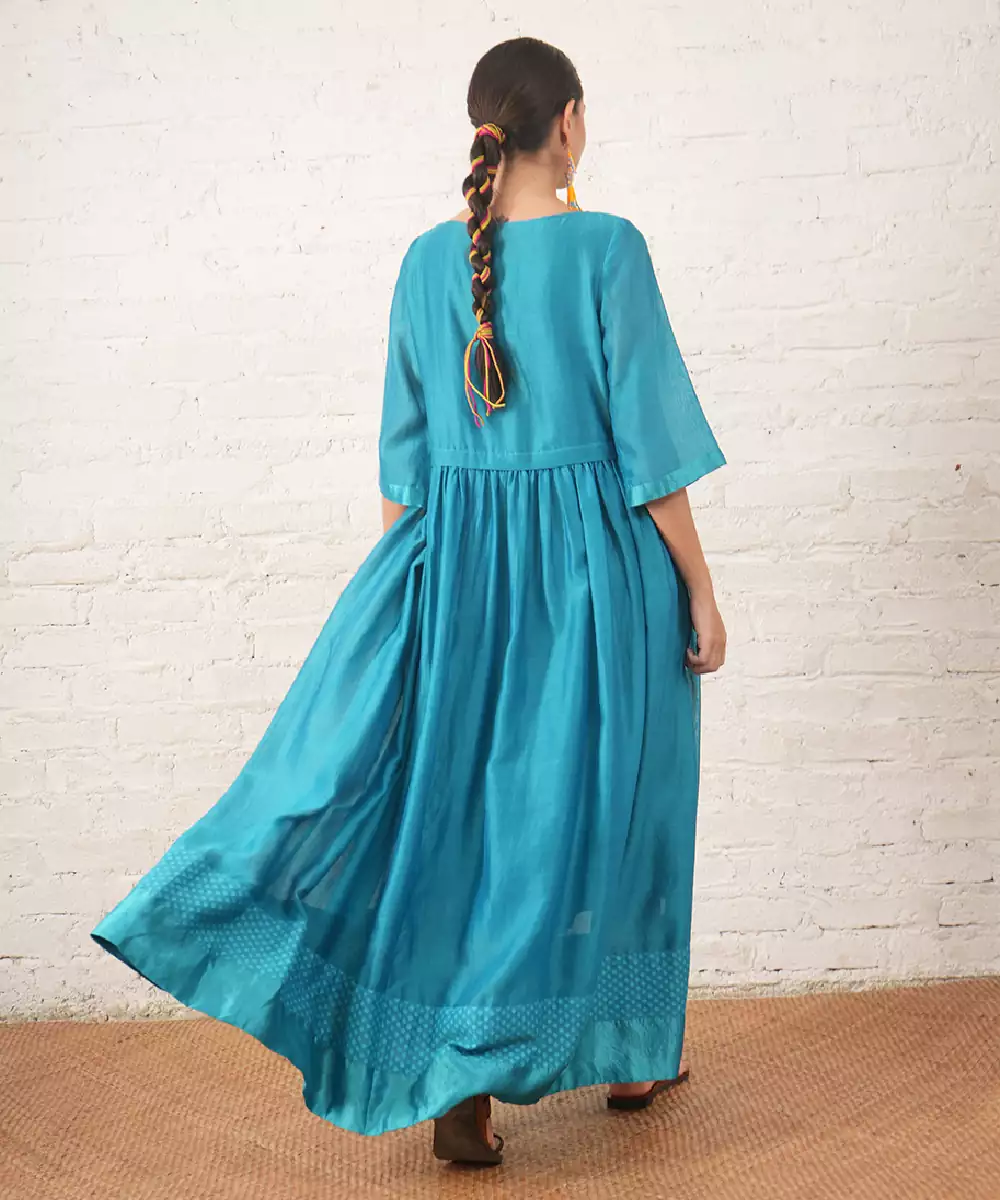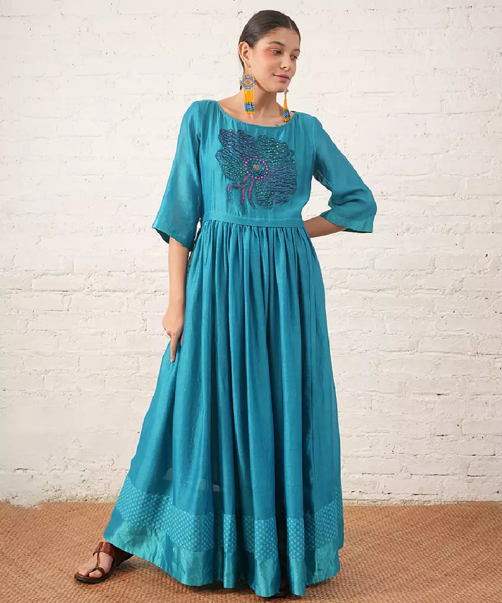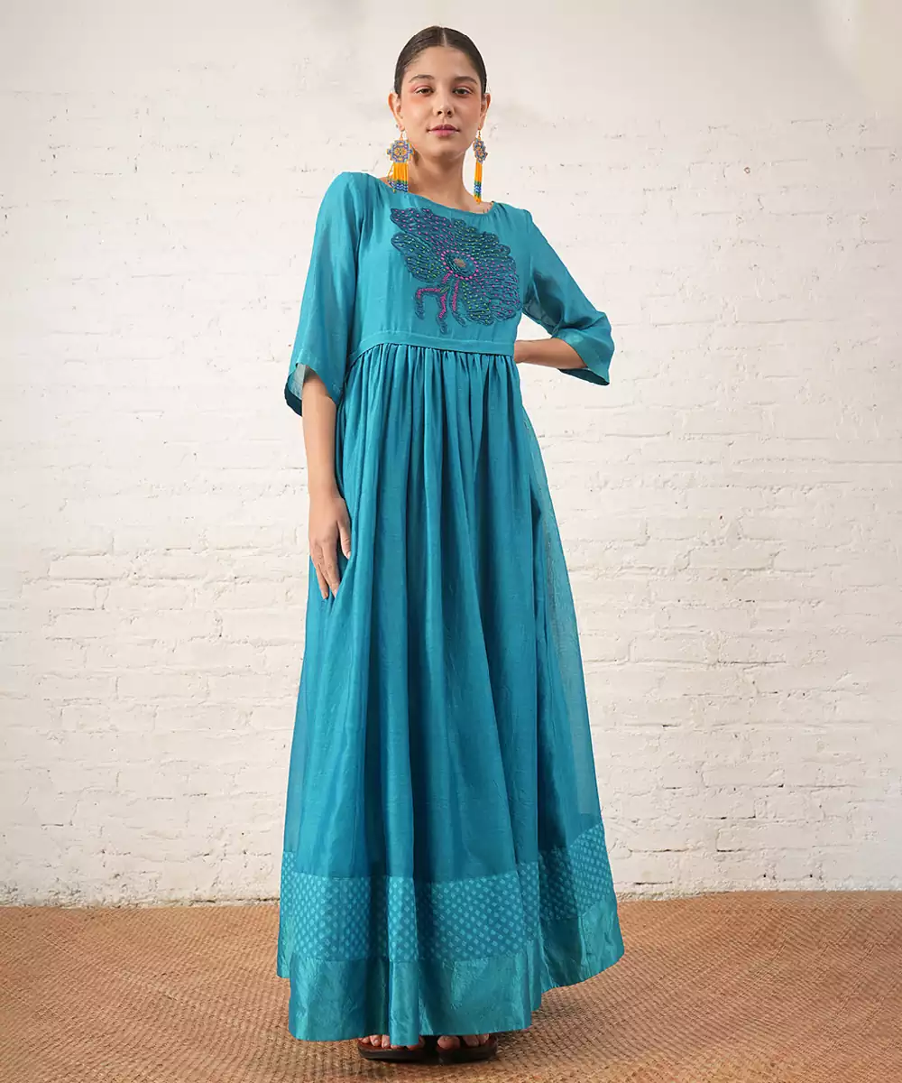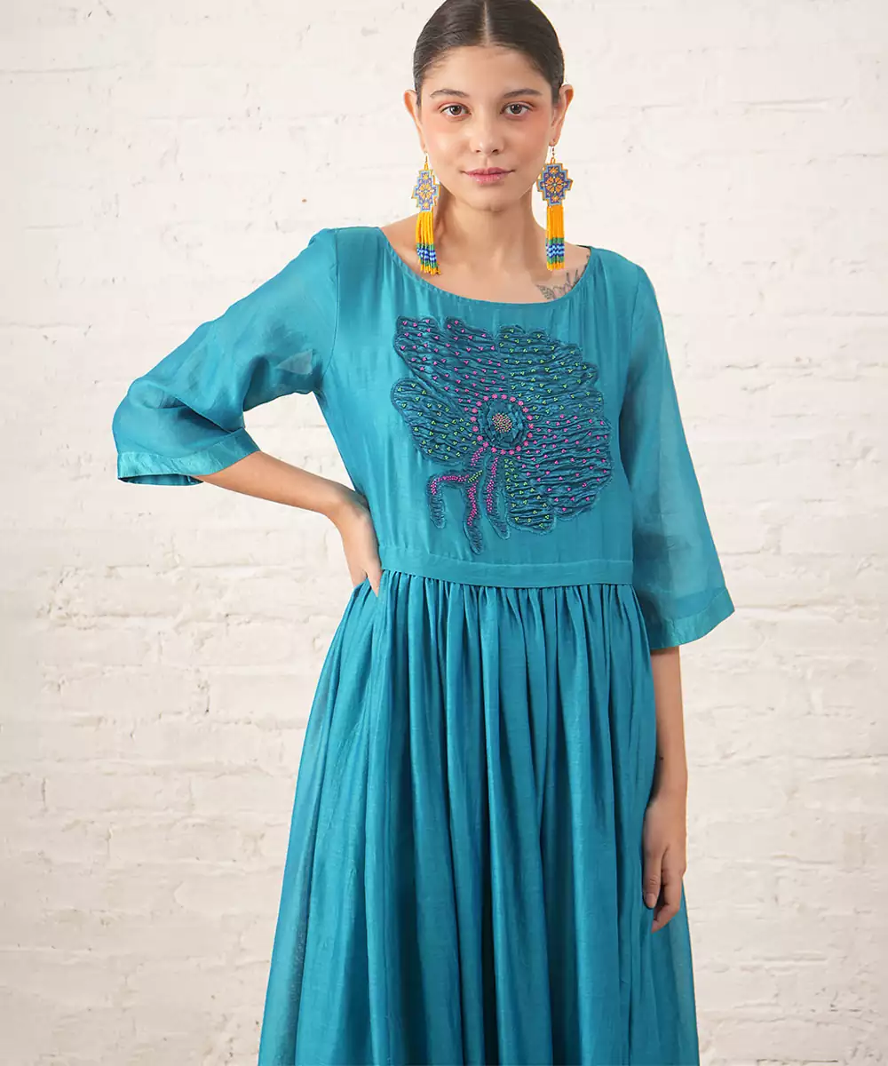 Teal Blue Embroidered Chanderi Dress