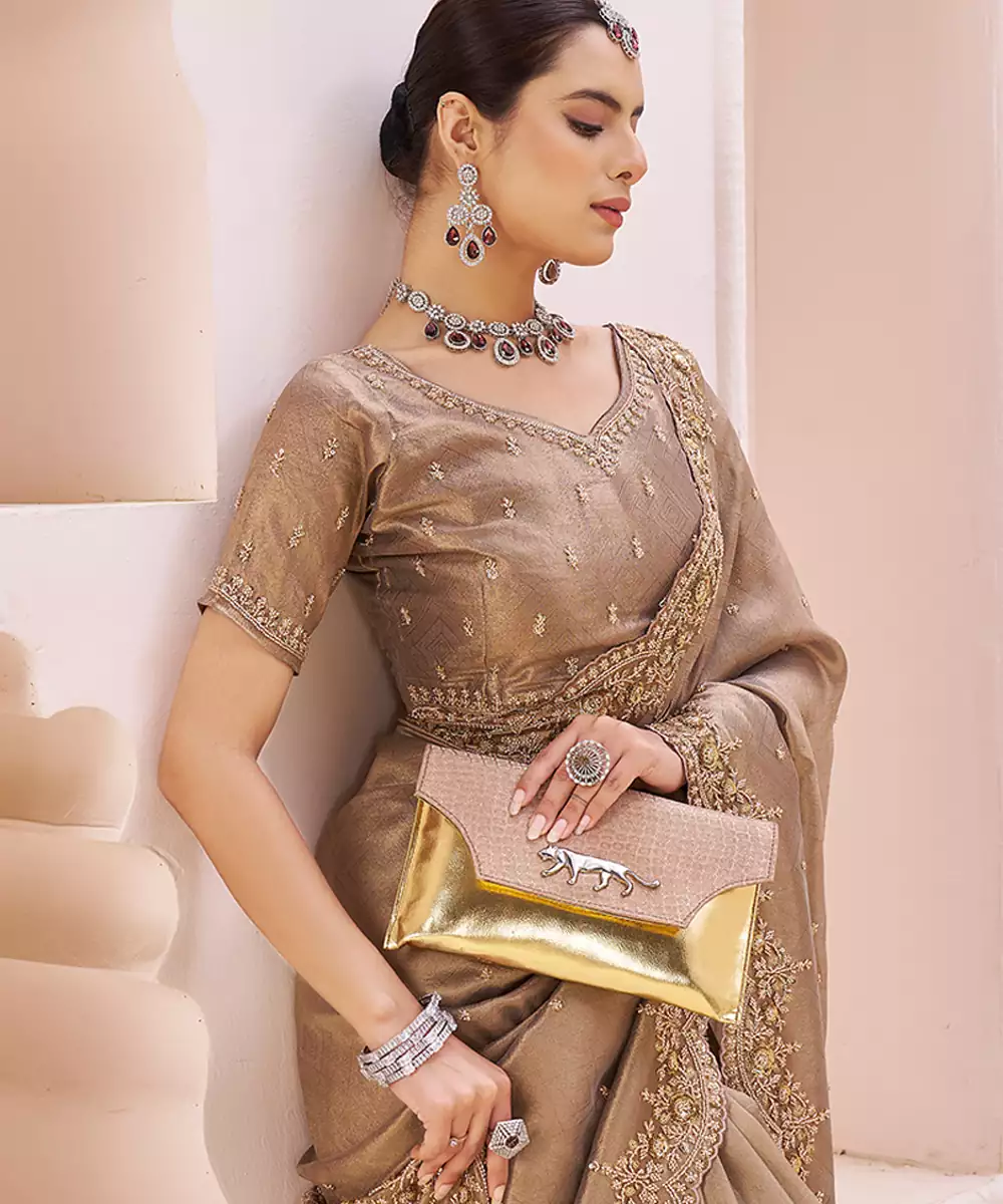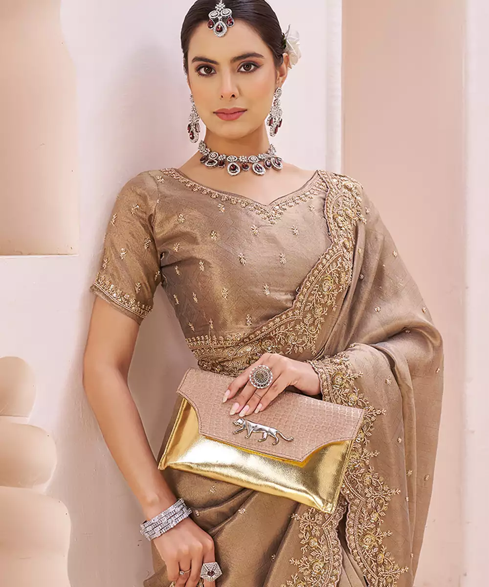 An Elegant Beige Banarasi Jacquard Saree Highlighted With Intricate Embroidery For Added Texture And Depth. The Rich Weave And Subtle Sheen Offer A Refined Appearance, Making It Suitable For Festive Functions, Cultural Gatherings, And Sophisticated Traditional Wear.
