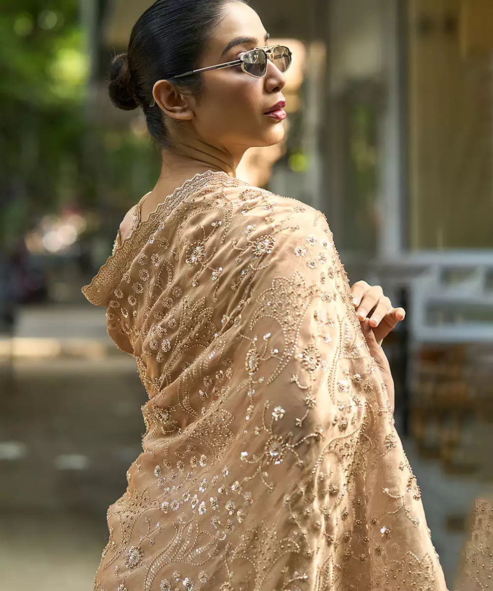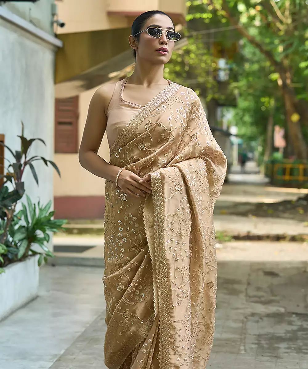 A Timeless Beige Banarasi Saree Enriched With Elegant Embroidery That Highlights Its Luxurious Weave. The Soft Sheen And Intricate Detailing Create A Graceful Silhouette, Making It Perfect For Weddings, Festive Gatherings, And Traditional Occasions Where Subtle Sophistication And Classic Craftsmanship Are Admired.