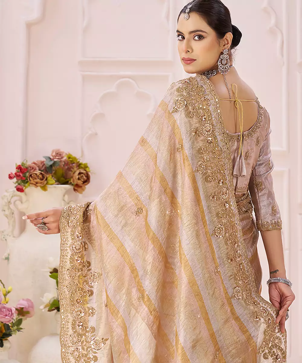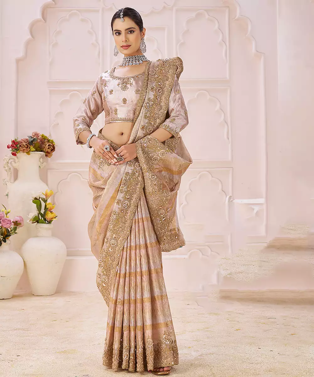 A Classic Beige Banarasi Saree Enhanced With Delicate Embroidery For A Graceful, Polished Look. The Rich Weave And Neutral Shade Make It Versatile And Elegant, Suitable For Weddings, Festive Gatherings, And Cultural Events With Understated Sophistication.