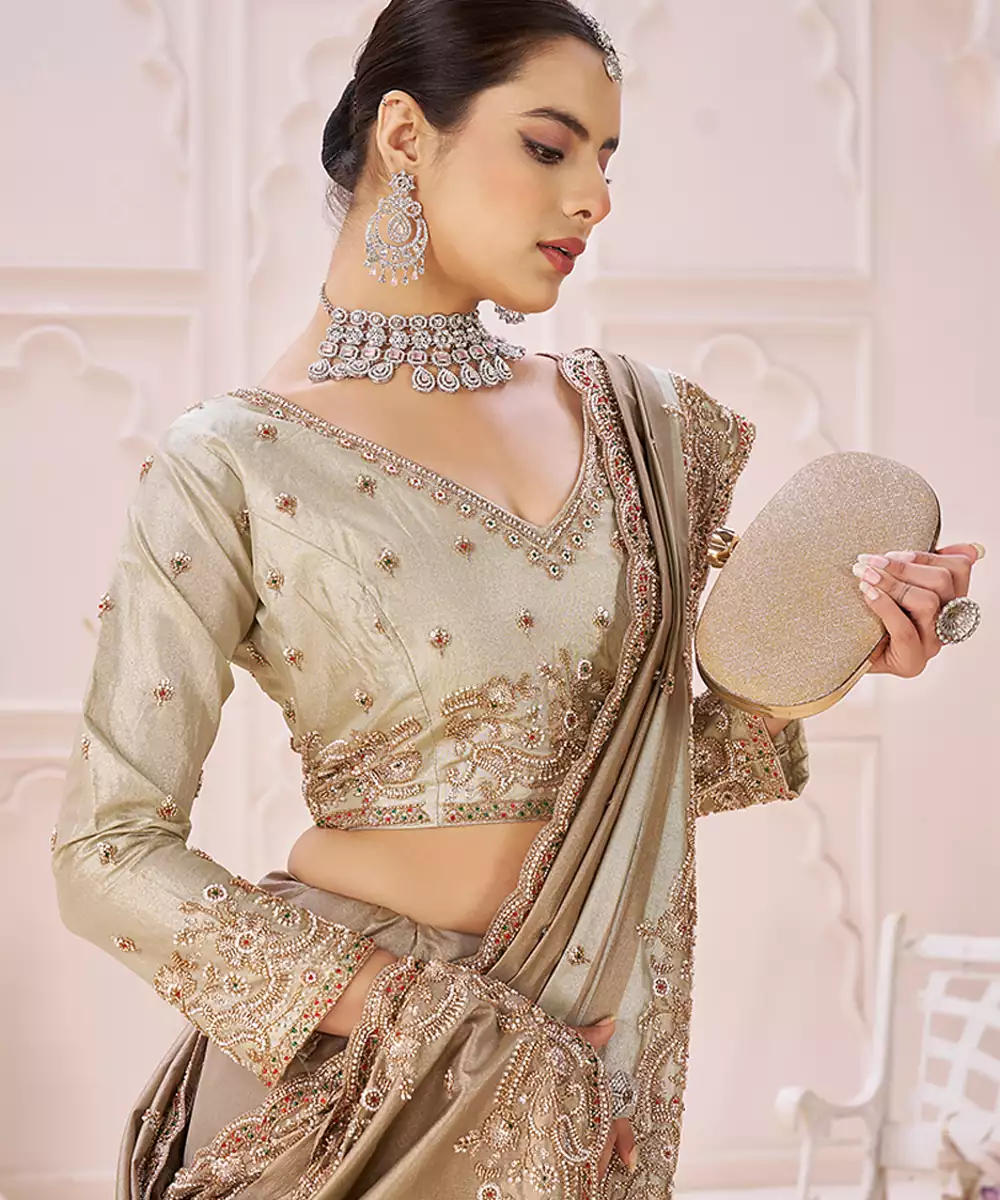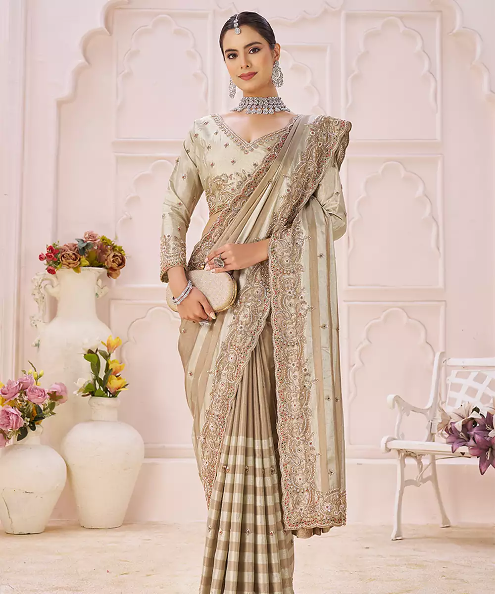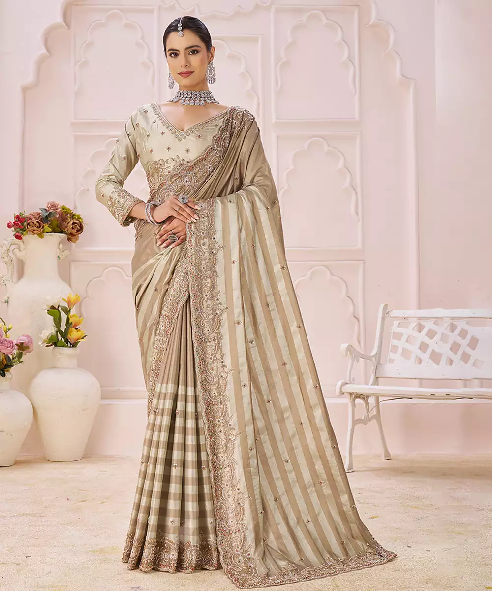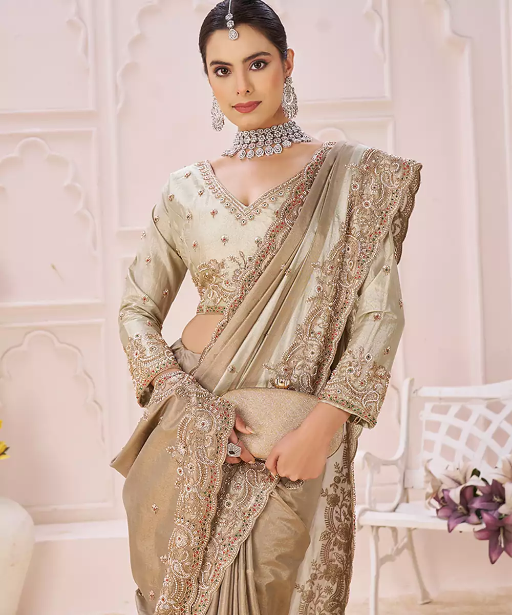 This Beige Banarasi Saree Showcases Elegant Embroidery That Complements Its Subtle Sheen. The Timeless Weave And Refined Detailing Offer A Sophisticated Look, Making It Perfect For Traditional Ceremonies, Festive Occasions, And Gatherings Where Classic Style Is Desired.