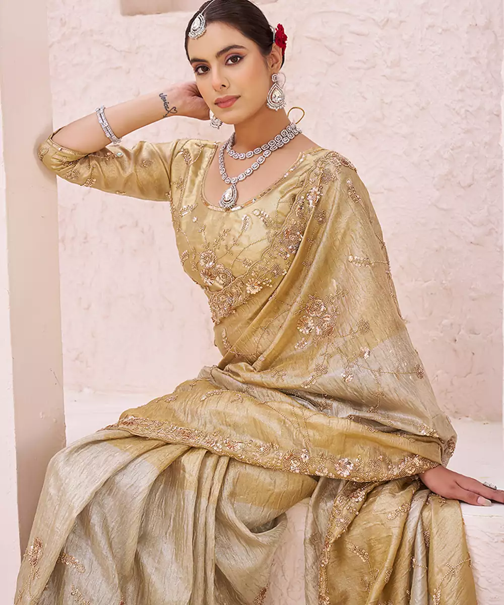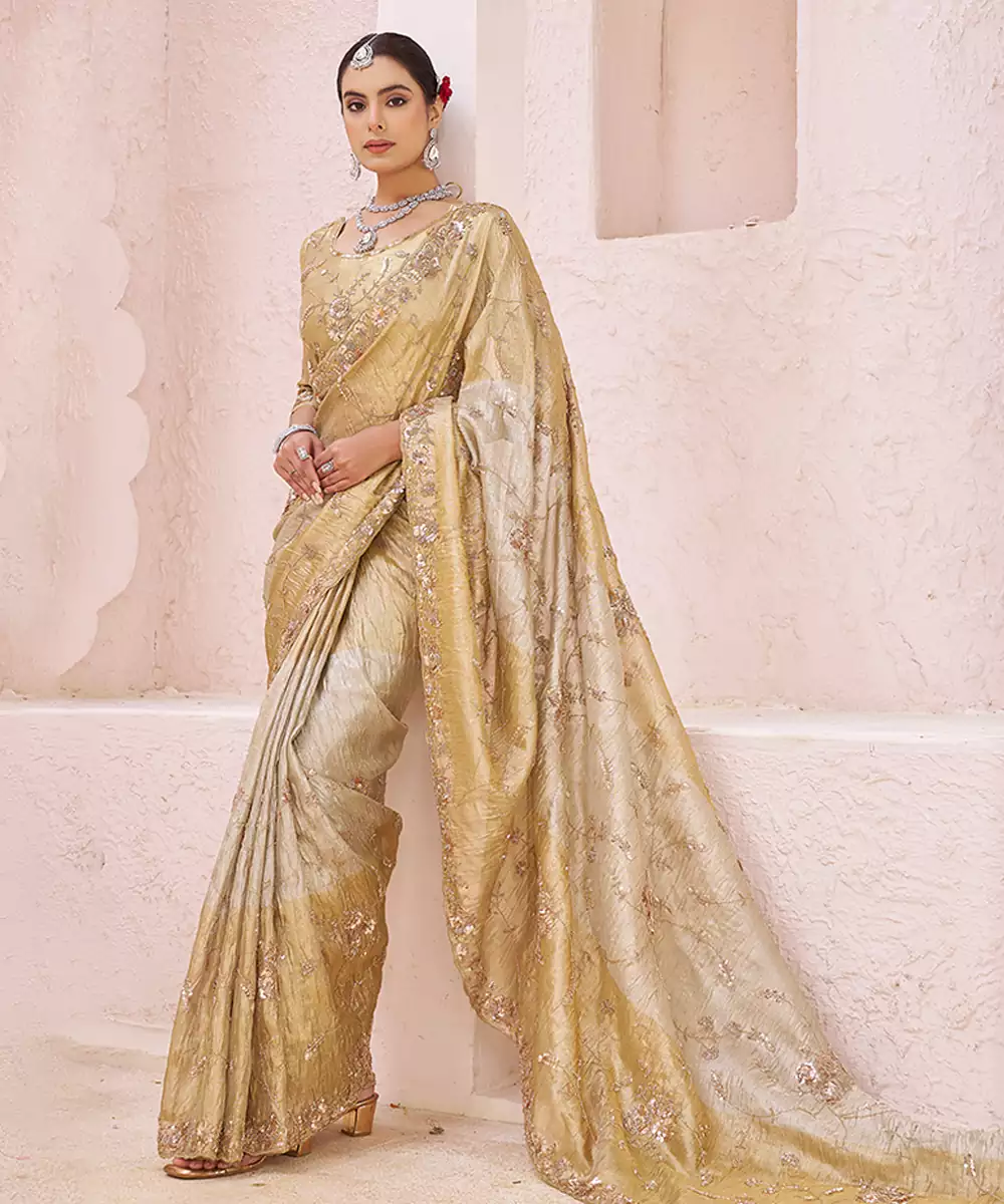 This Radiant Gold Banarasi Saree Features Ornate Embroidery That Enhances Its Regal Appeal. Woven In Rich Fabric With A Lustrous Finish, It Drapes Beautifully And Adds Grandeur To Your Look. Ideal For Wedding Celebrations, Receptions, And Festive Evenings With Traditional Elegance.
