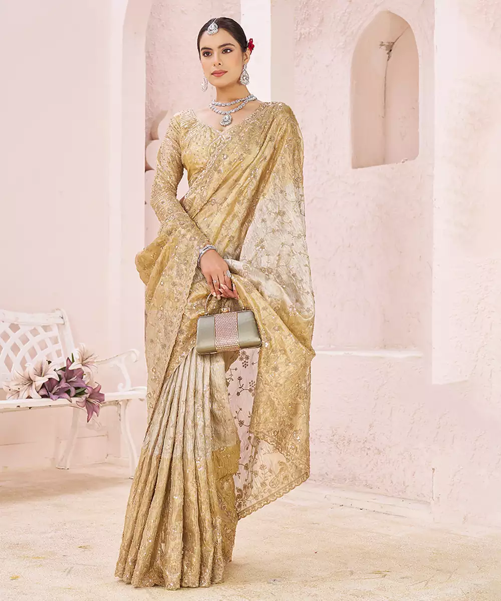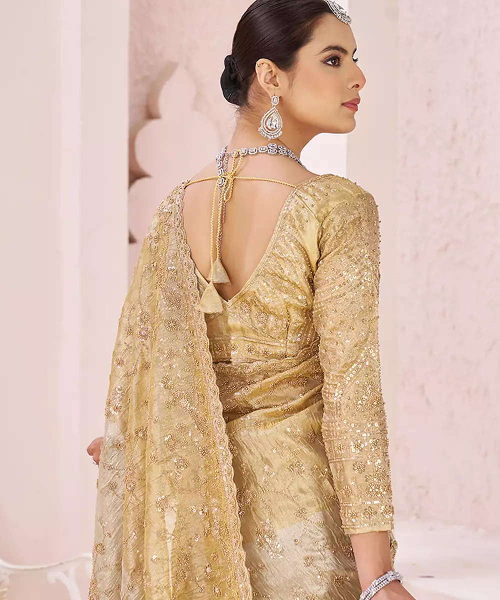A Luxurious Gold Banarasi Saree Adorned With Fine Embroidery For A Majestic Finish. The Rich Texture And Shimmering Tone Lend A Royal Charm, Making It An Excellent Choice For Bridal Functions, Festive Occasions, And Cultural Celebrations With Timeless Ethnic Allure.