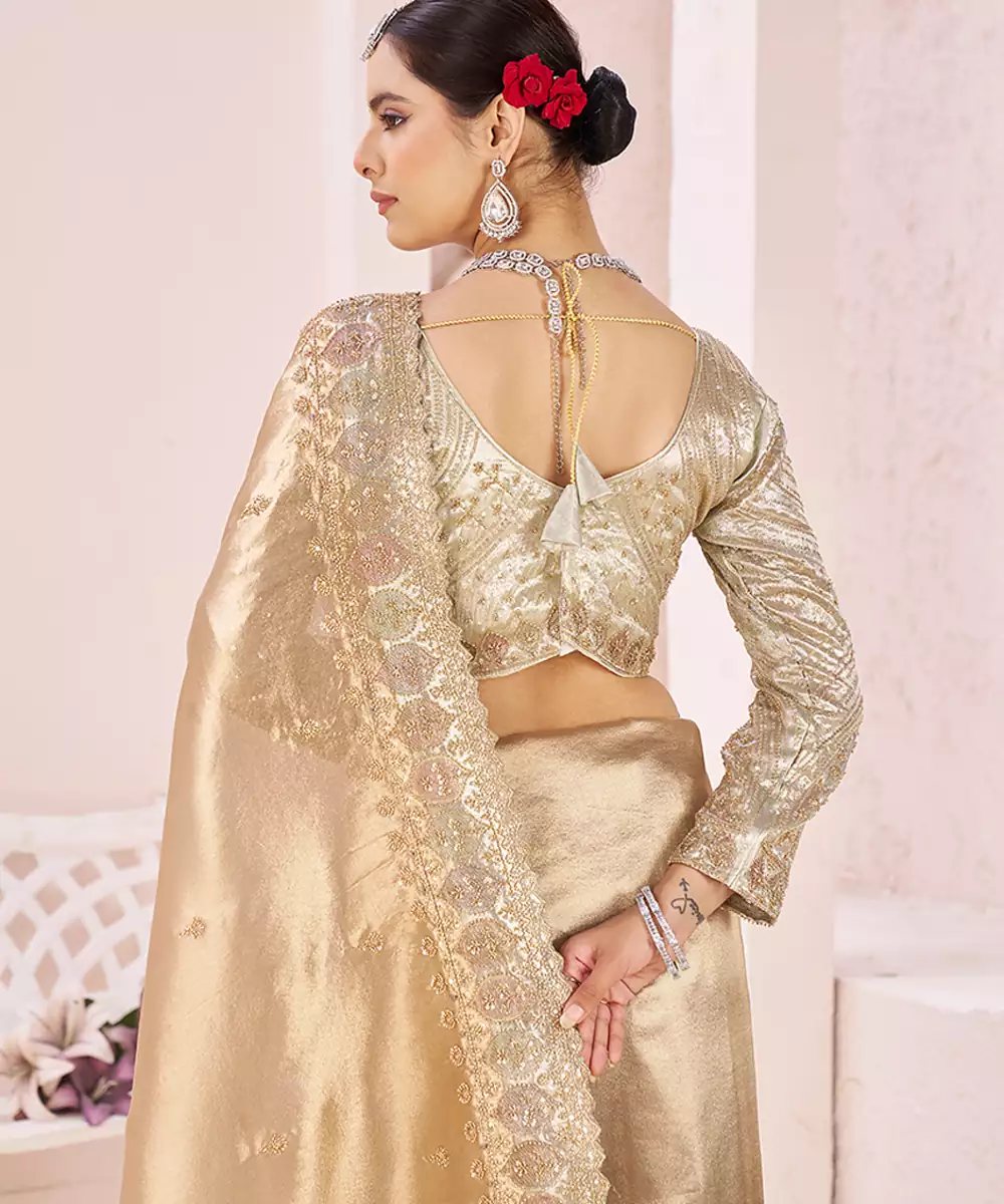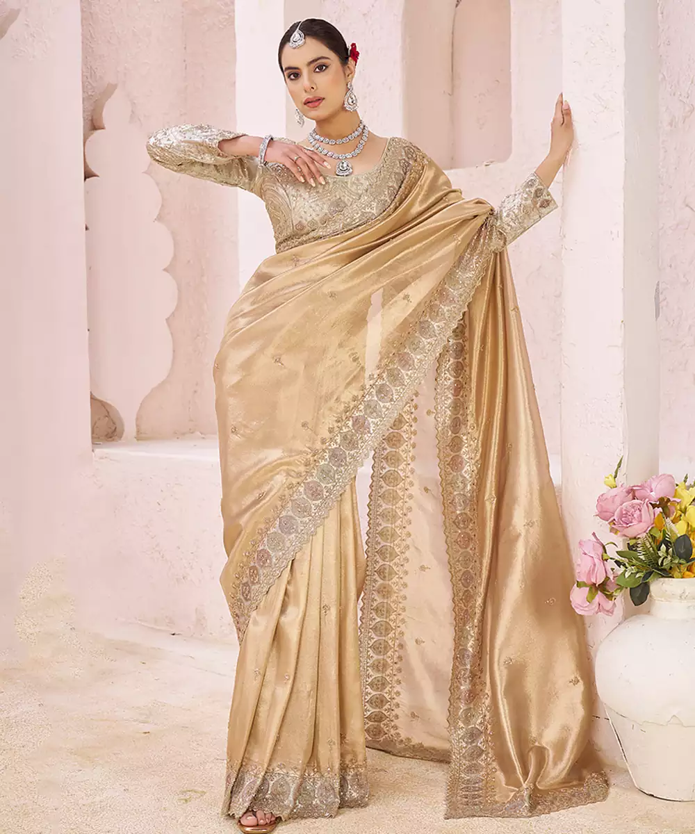 An Opulent Gold Banarasi Saree Highlighted With Intricate Embroidery That Adds Depth And Brilliance. The Classic Weave Paired With Ornate Detailing Creates A Statement Ensemble, Perfect For Grand Festivities, Wedding Rituals, And Special Occasions That Call For Refined Tradition.