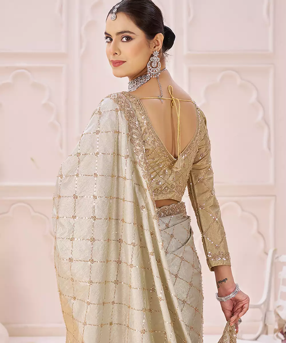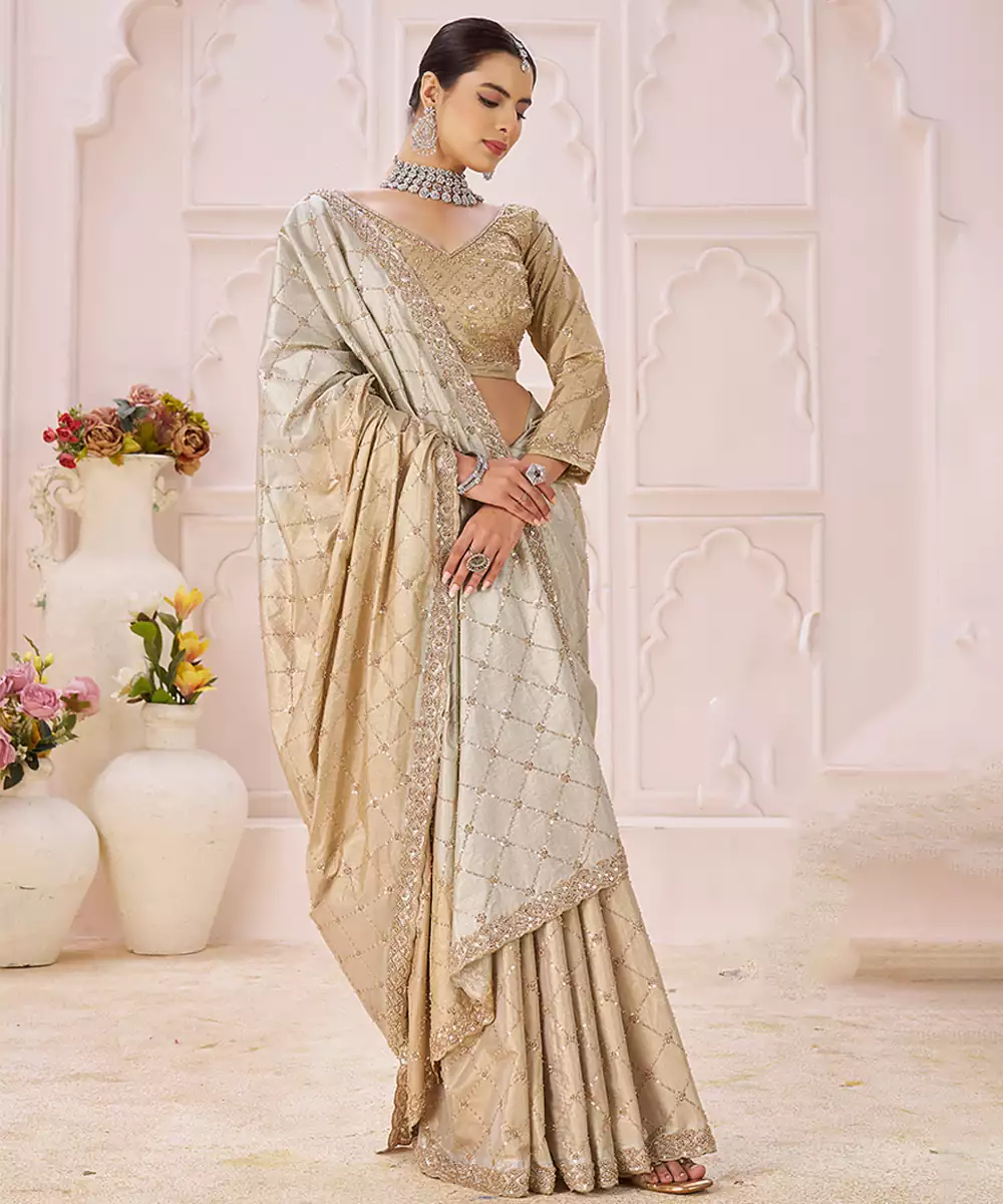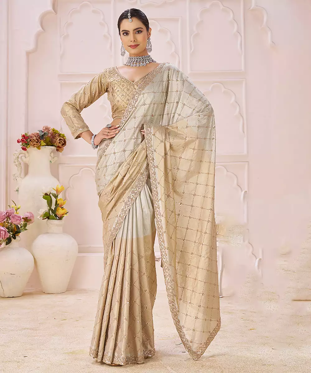 A Stunning Gold Banarasi Saree Adorned With Fine Embroidery For A Rich, Festive Finish. The Lustrous Fabric And Traditional Craftsmanship Create A Royal Appeal, Ideal For Bridal Functions, Receptions, And Special Celebrations With Ethnic Grandeur.