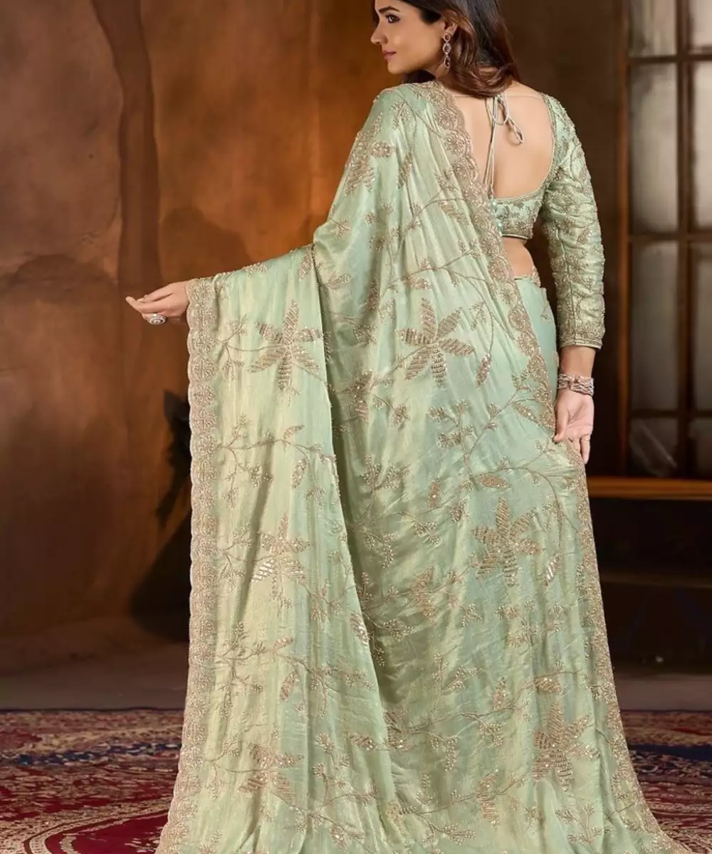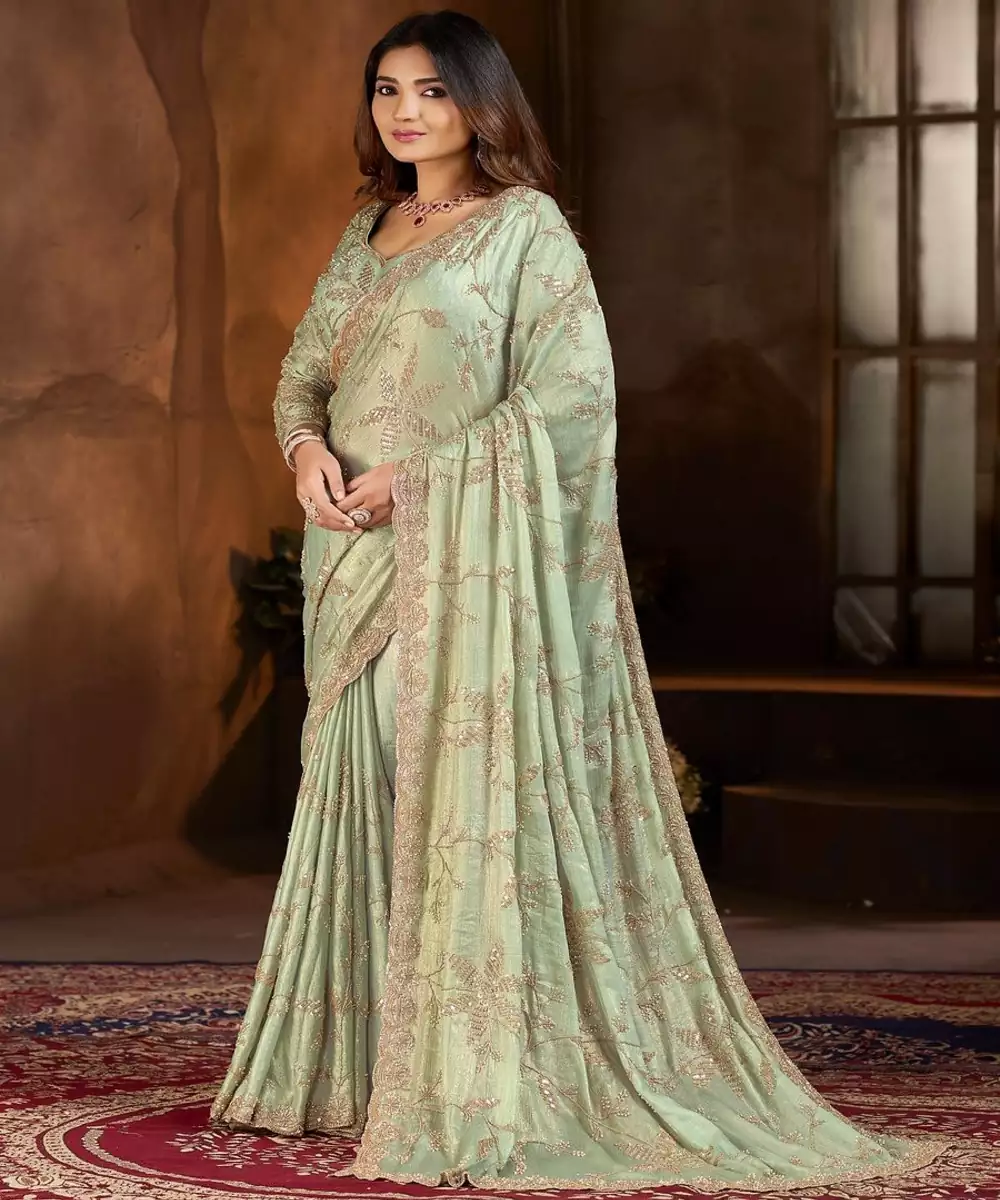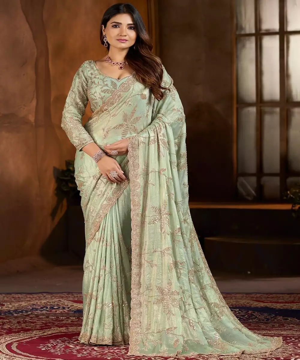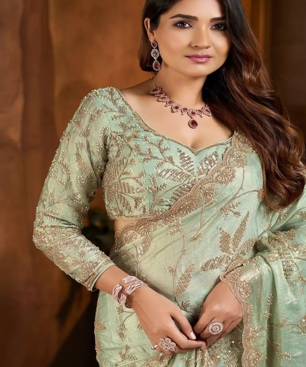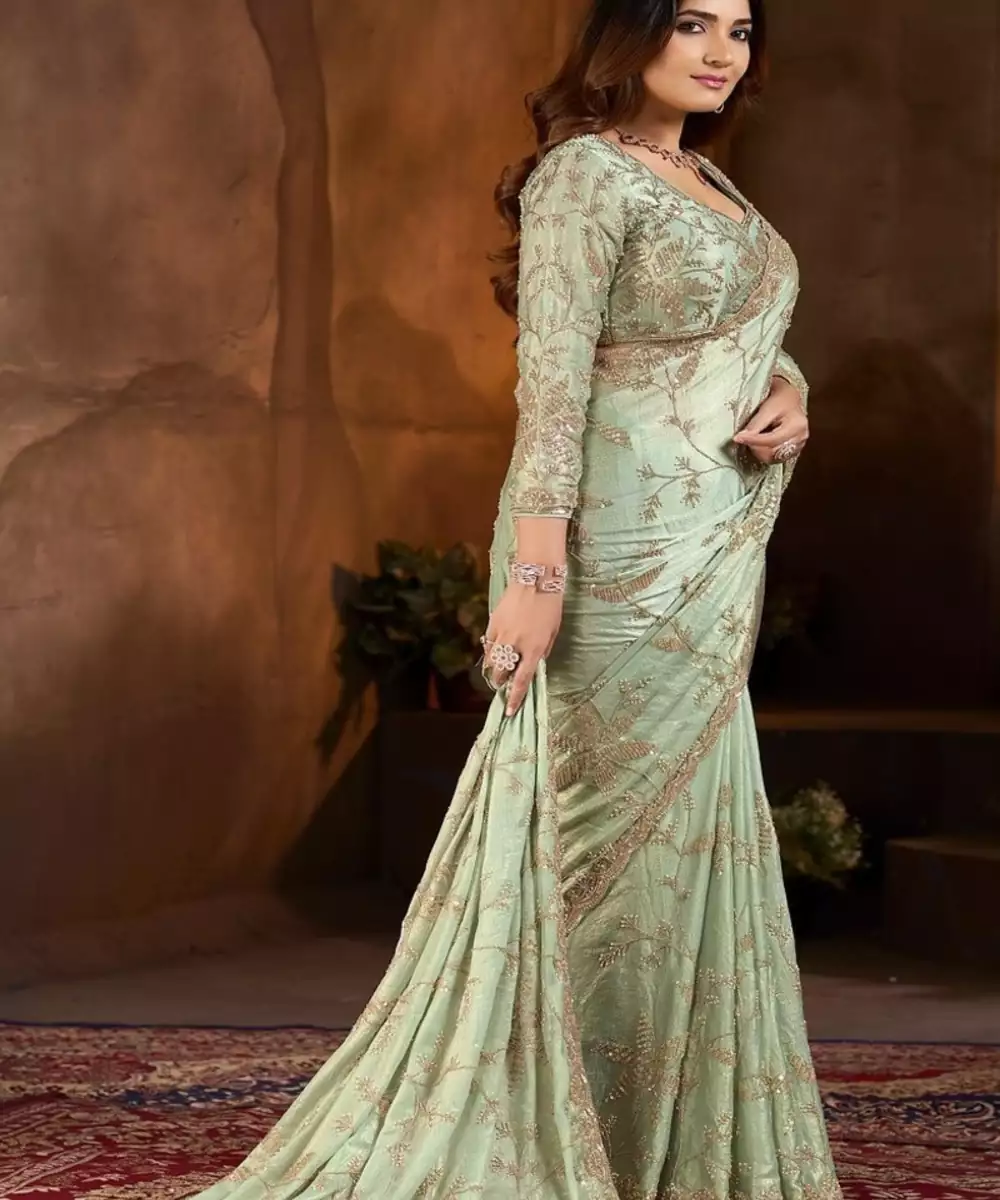 This Green Embroidered Georgette Saree Offers A Stunning Balance Of Vibrant Color And Delicate Detail. The Lightweight Georgette Fabric Ensures A Beautiful, Flowing Drape, While The Intricate Embroidery, Often Featuring Resham, Zari, Or Sequins, Adds An Elegant Touch. Perfect For Festivals, Parties, Or Special Occasions, This Saree Embodies Effortless Grace And Rich, Appealing Style