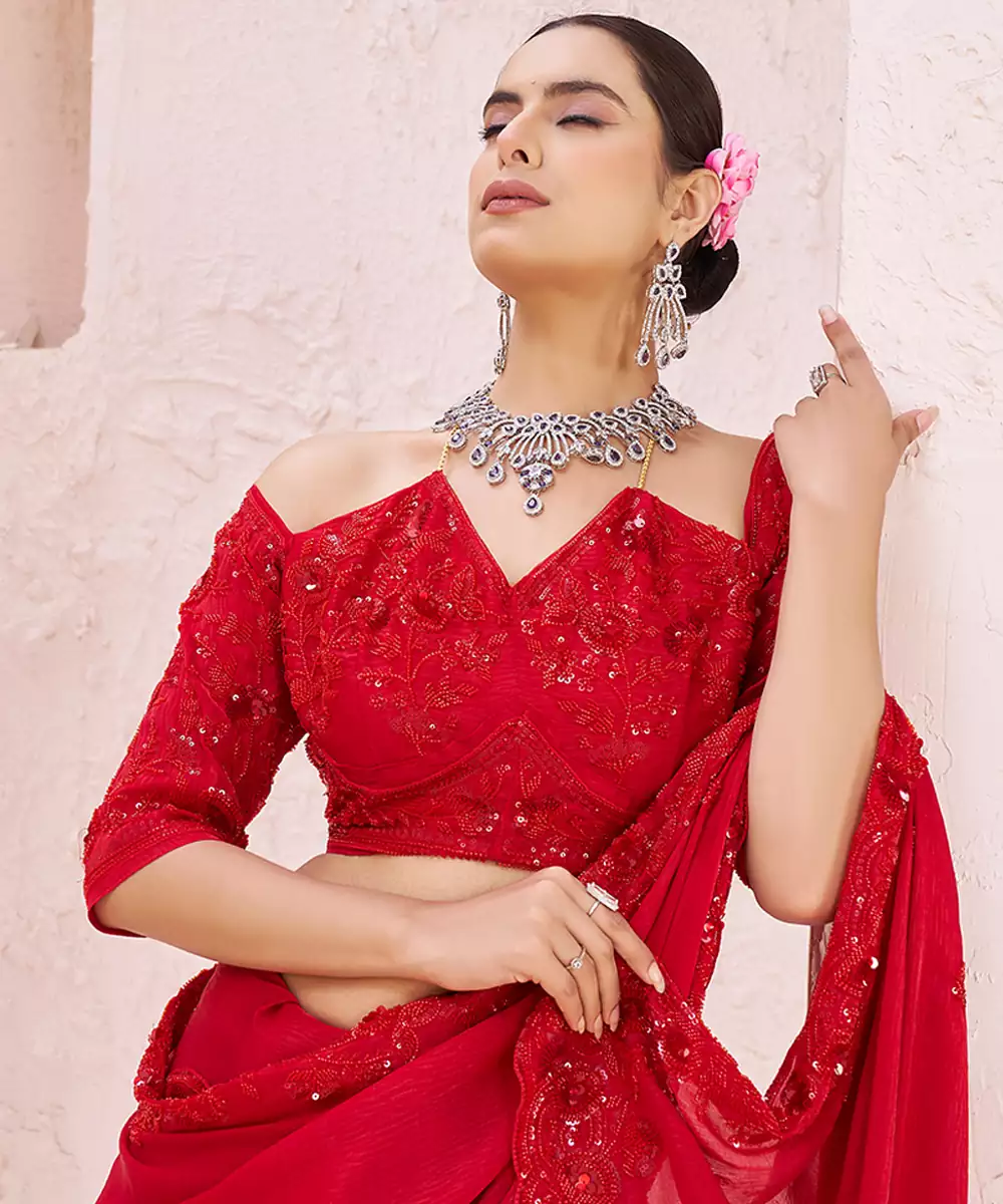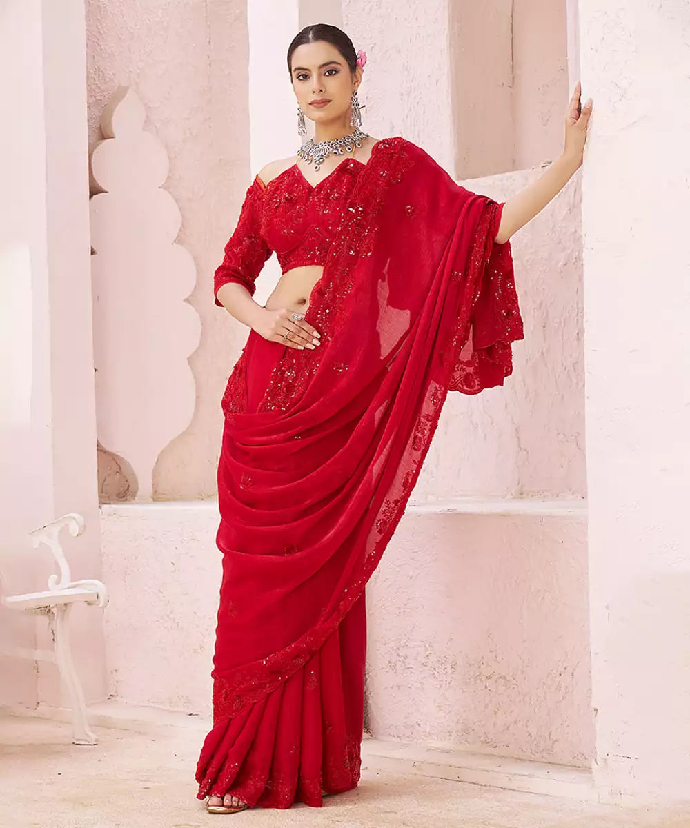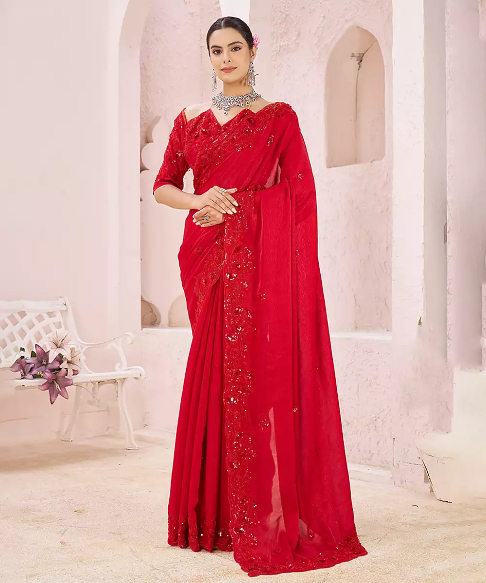 This Red Crepe Saree Features Refined Embroidery That Balances Richness With Modern Appeal. The Smooth Texture And Graceful Fall Make It Flattering And Versatile, Perfect For Festive Lunches, Family Celebrations, And Semi Formal Ethnic Events With Confident Style.