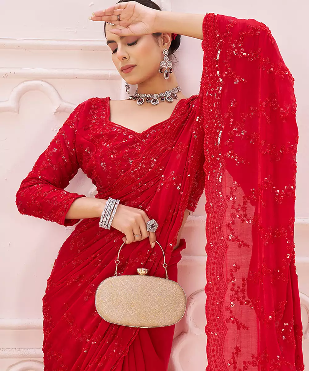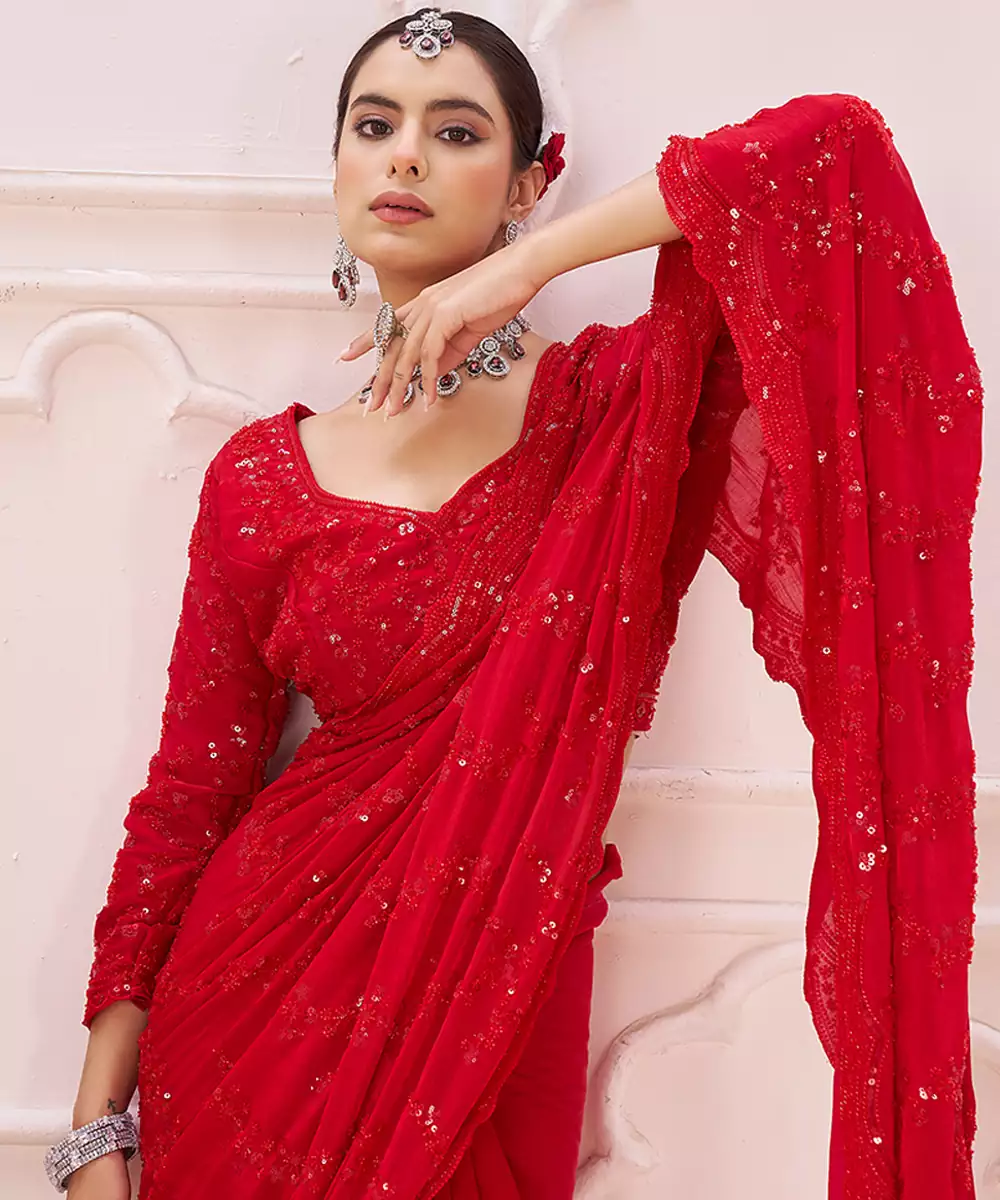 An Elegant Red Crepe Saree Adorned With Subtle Embroidery For A Polished Finish. The Airy Fabric Ensures Ease Of Movement, While The Vibrant Shade Adds Drama. Suitable For Festive Occasions, Cocktail Events, And Contemporary Ethnic Styling With Effortless Grace.