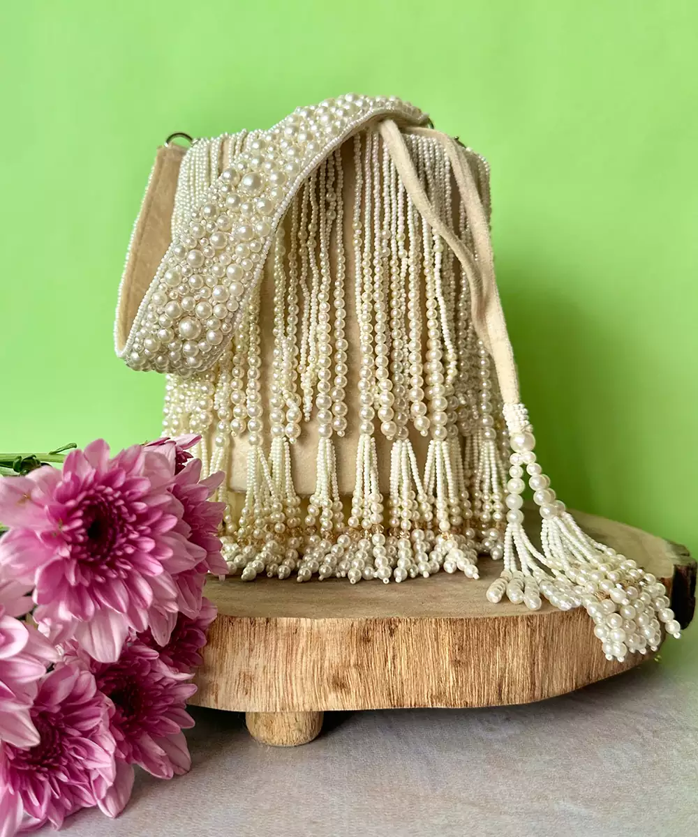 An Ivory Suede Base Potli With Pearl Tassels To Add That Extra Wow Factor To Your Look. Colour : Ivory Material : Suede Components : 1 Potli Bag