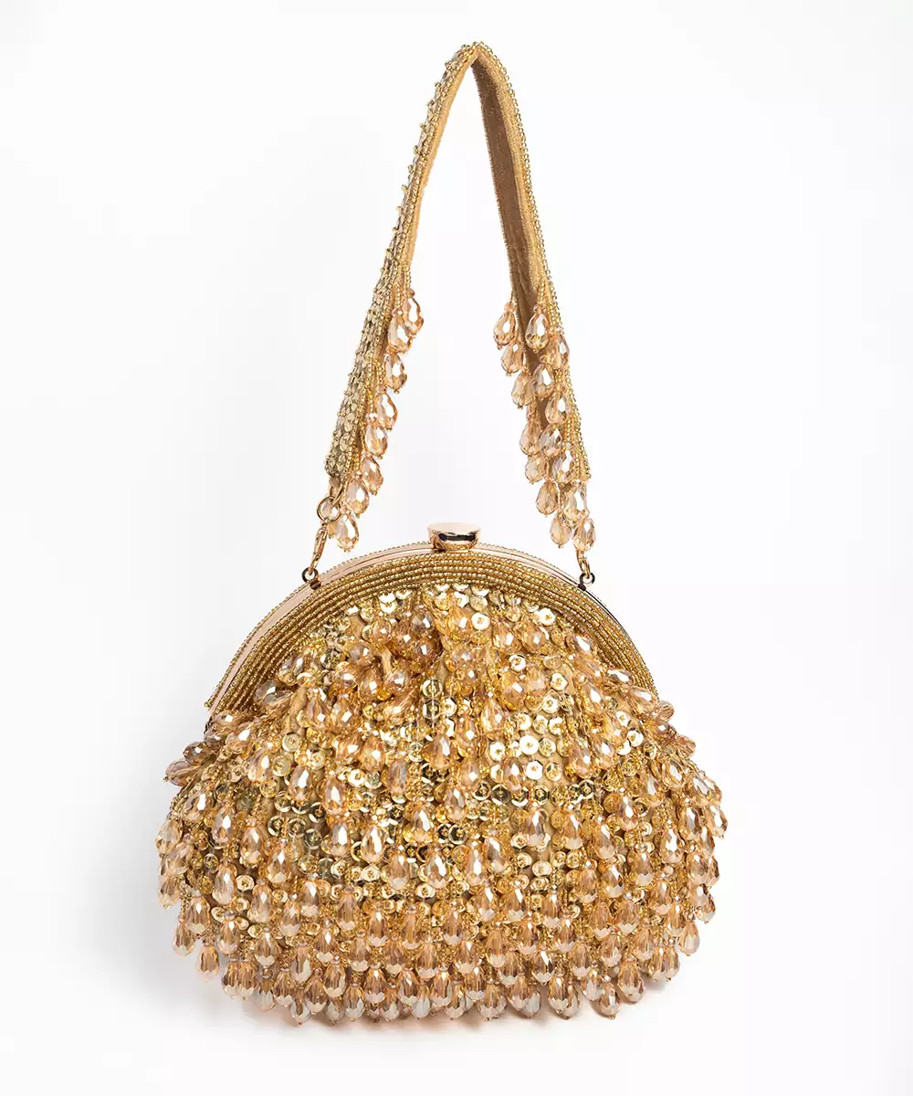 A Variation Of Gold Jewels Dangling On This Voguish Clutch, With A Subtle Sequinned Frame Finish