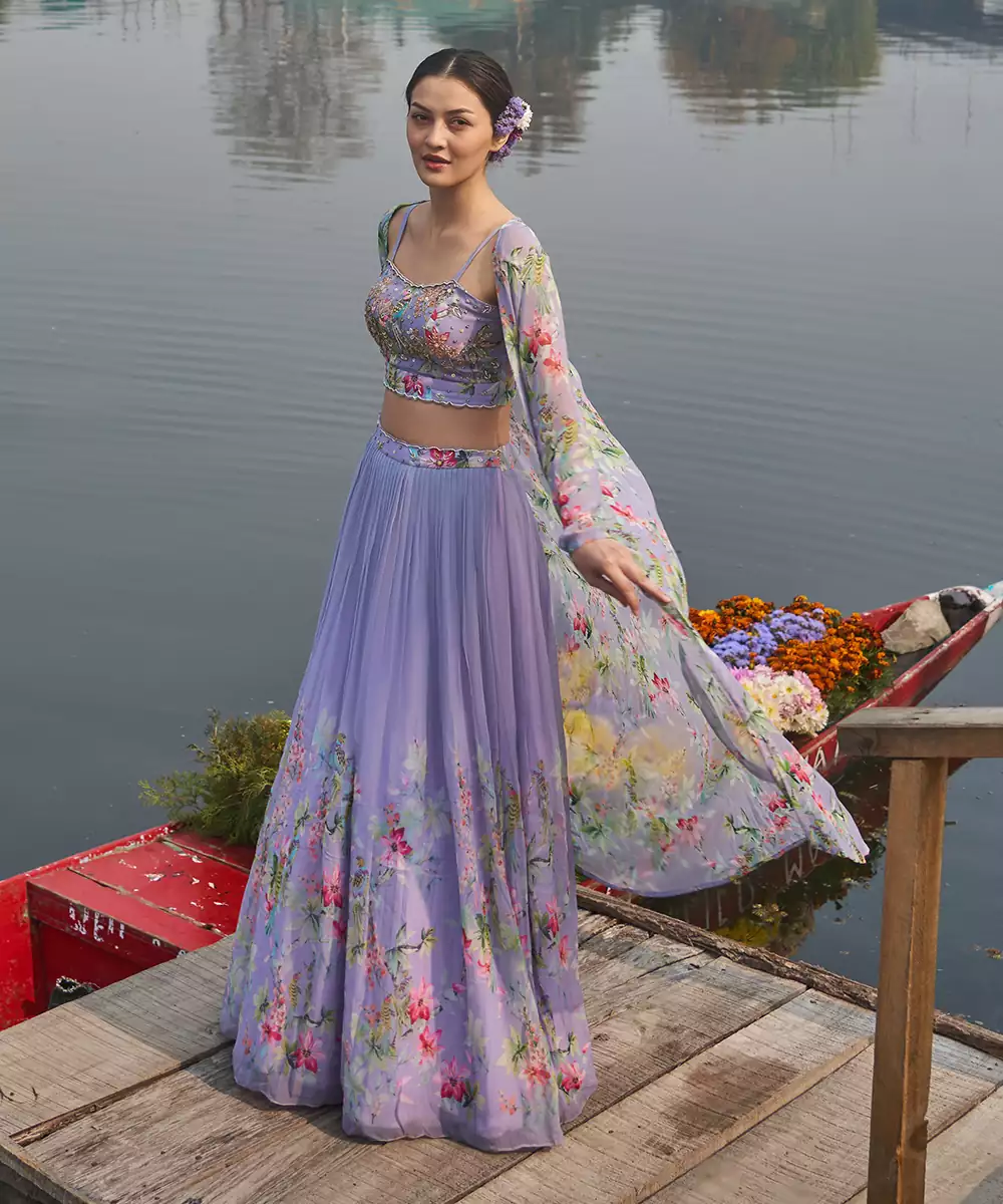 Elegant Lavender Floral Lehenga Set Paired With Long Sleeve Shrug With Chudi Sleeves And Lehenga.