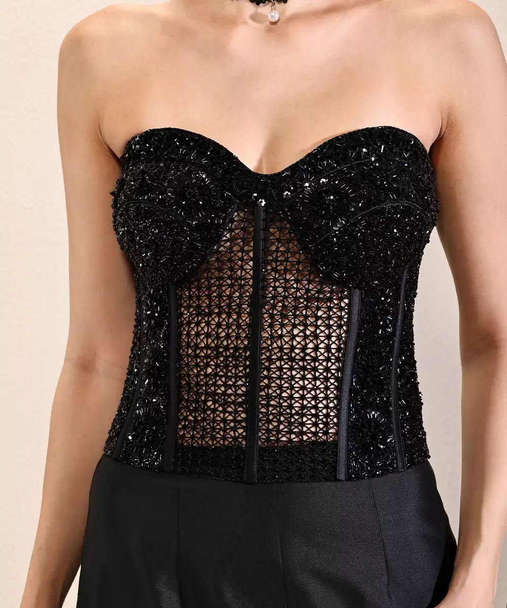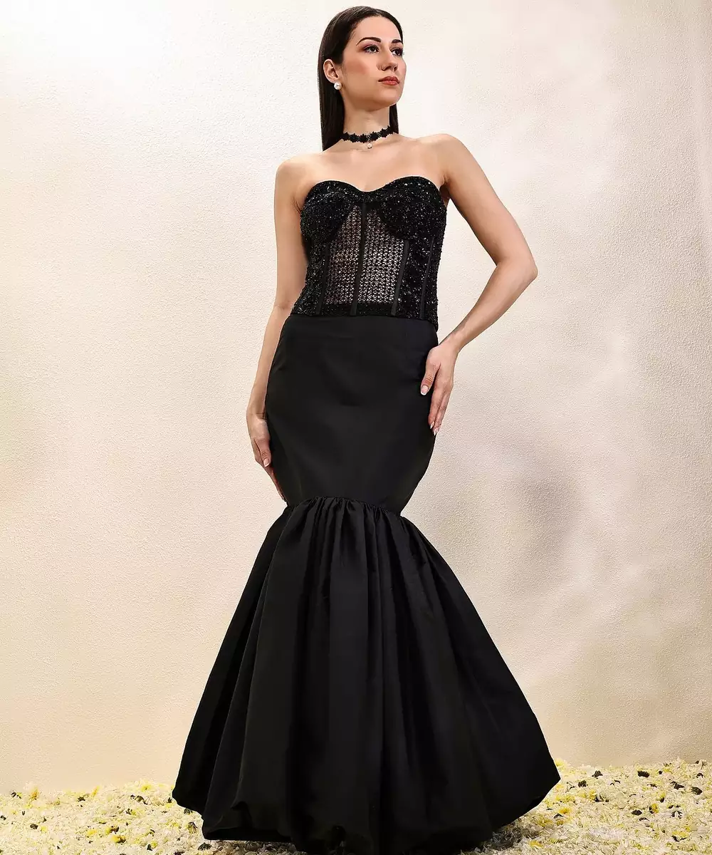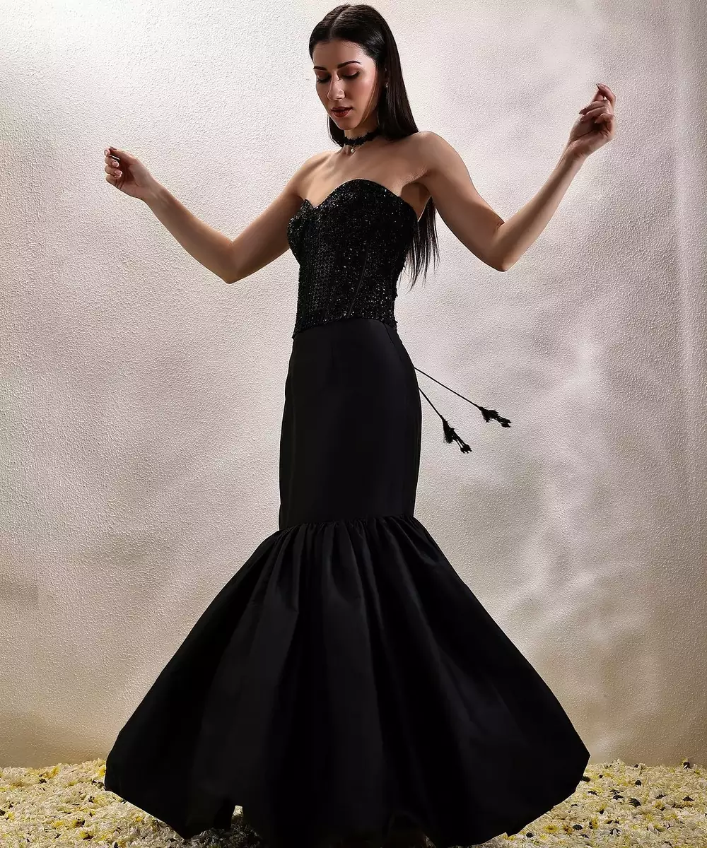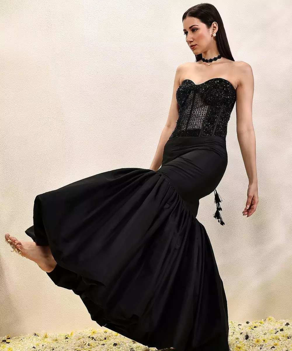Black Embroidered Corset Enhanced Wih Thread, Sequins, Bead And Stone Work. It Is Teamed With A Balloon Skirt