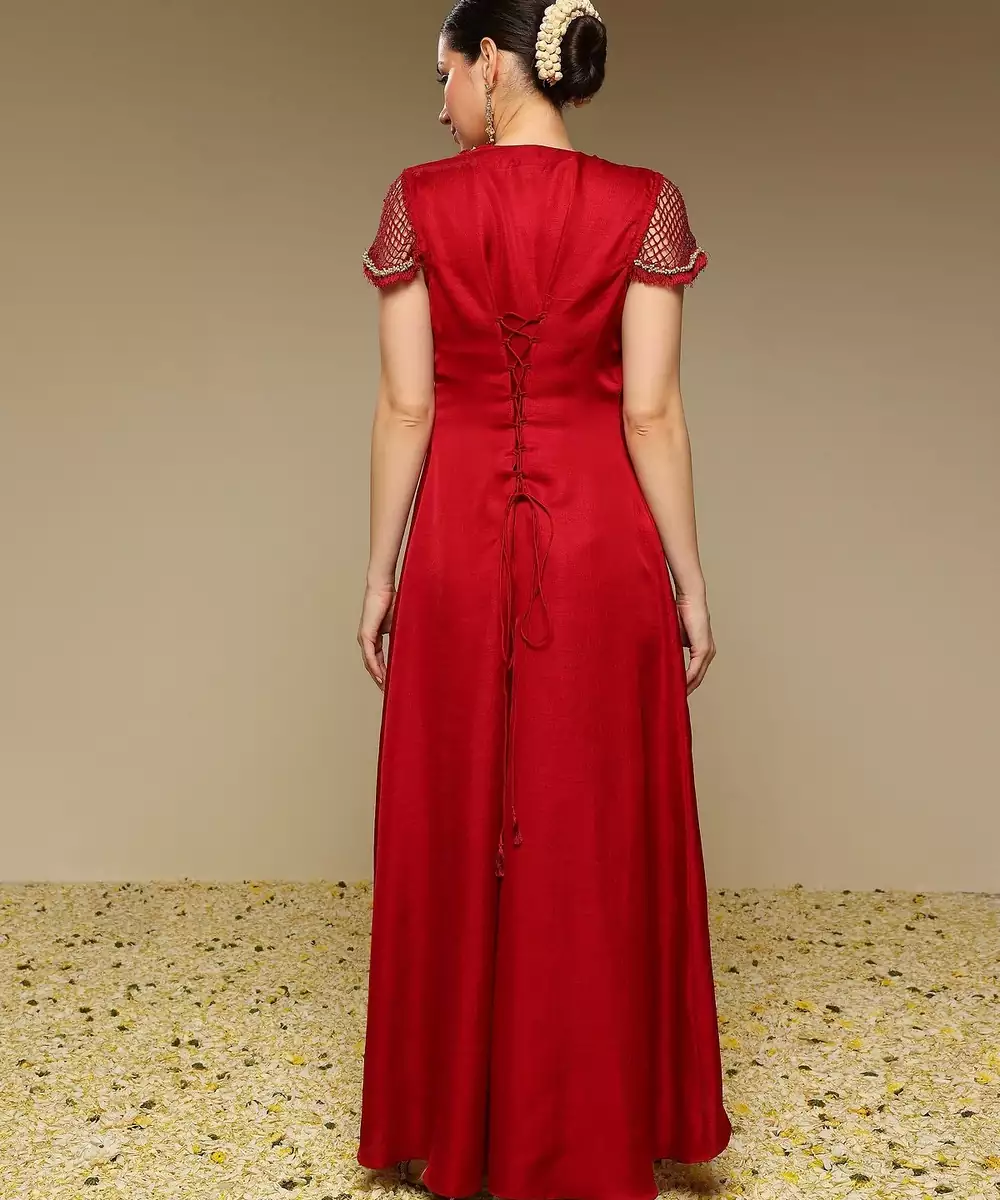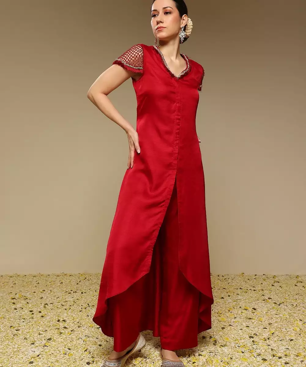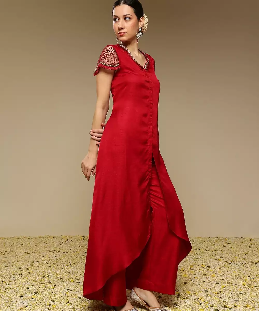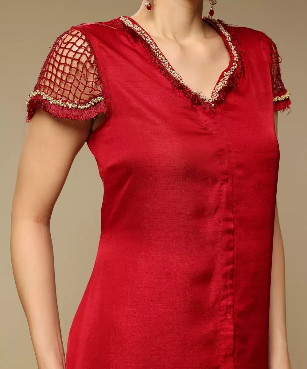 Maroon Flared Kurta With Bead And Pearl Work Detail On The Neckline And Sleeve. It Is Teamed With Matching Pants.