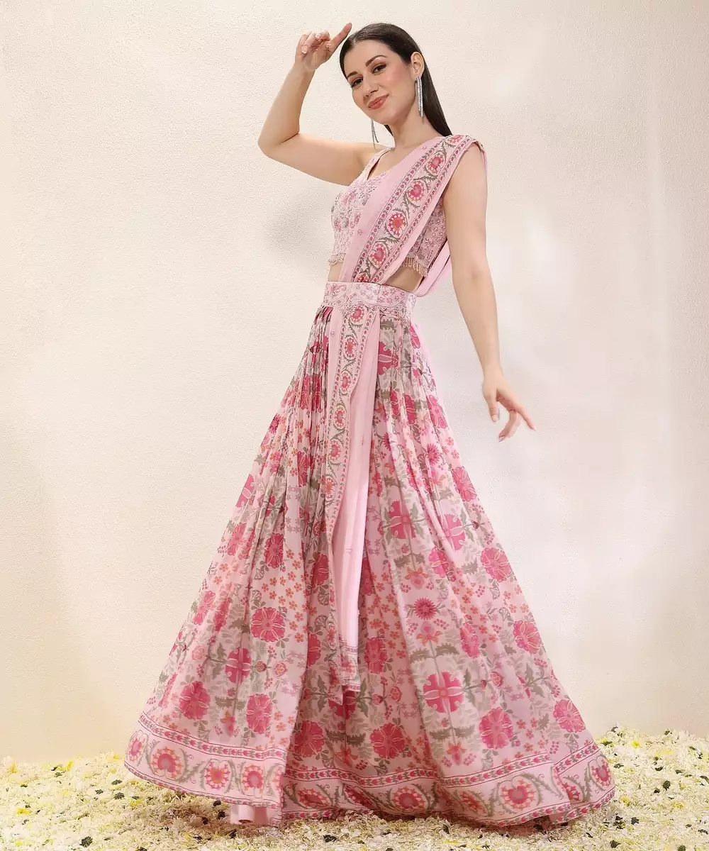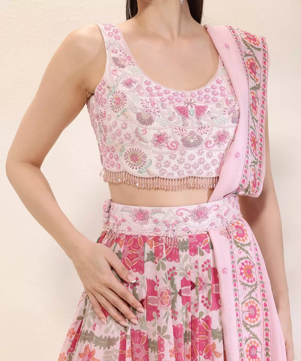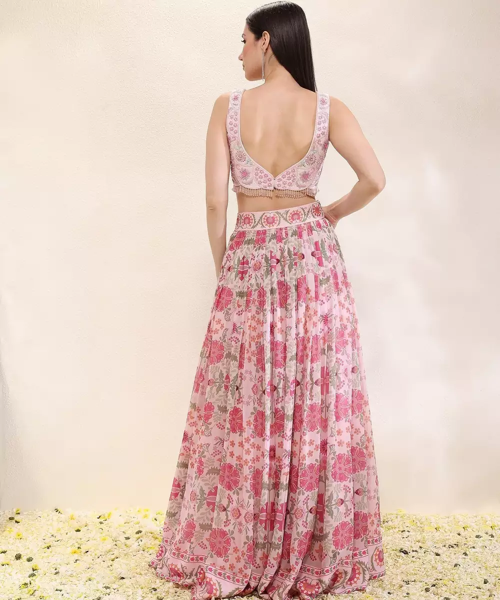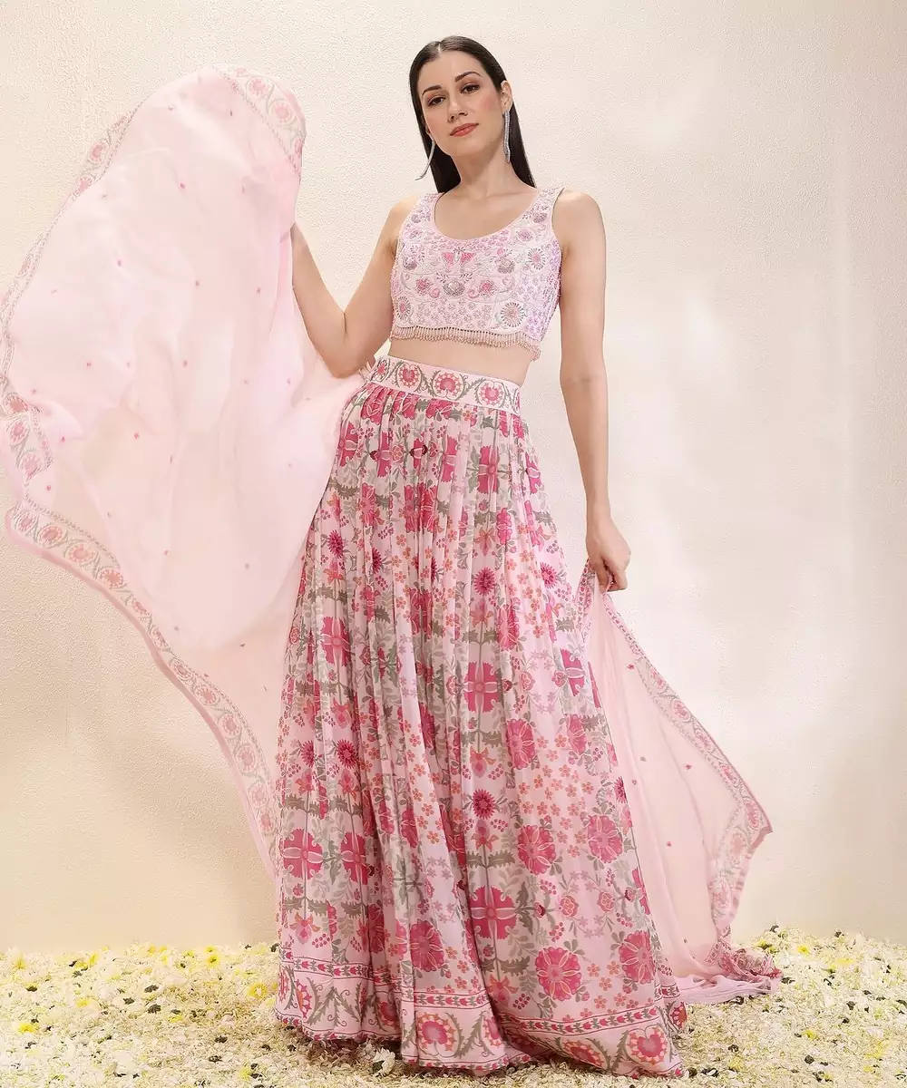 A Gorgeous Multicolor Floral Printed Georgette Lehenga That's Vibrant And Airy. The Lightweight Georgette Drapes Beautifully, Making This A Comfortable Yet Festive Choice For Any Occasion.