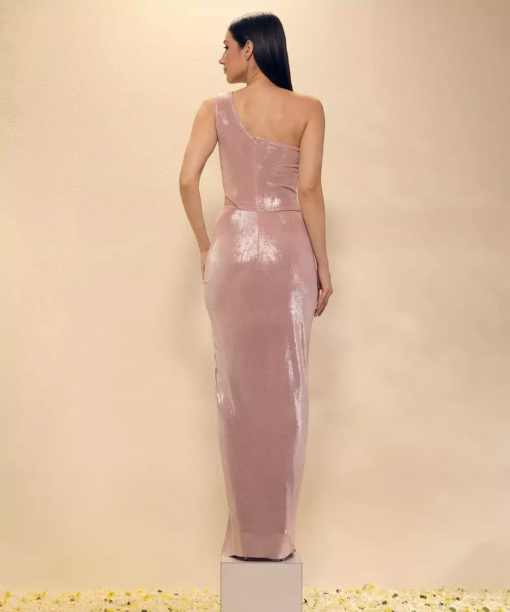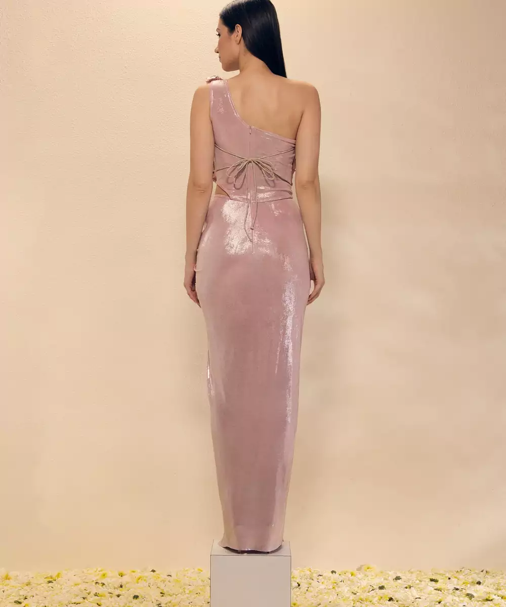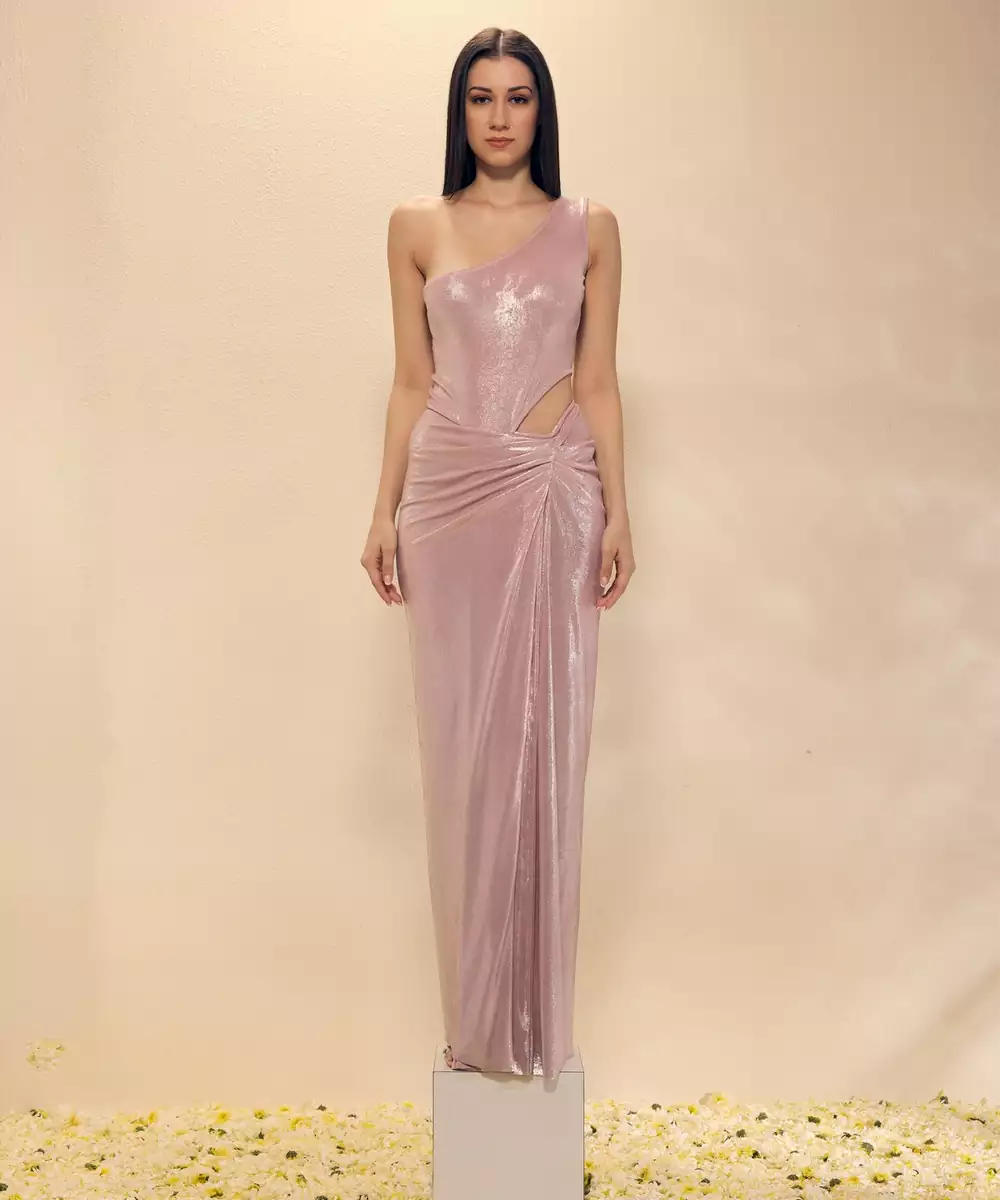 A Stunning Pink Lycra Gown Featuring Luxurious Draping For A Fluid, Form Fitting Silhouette. It's Dramatically Contrasted By A Unique Matching Resin Plate Across The Bodice, Adding An Avant Garde, Structural Edge To The Glamorous Look