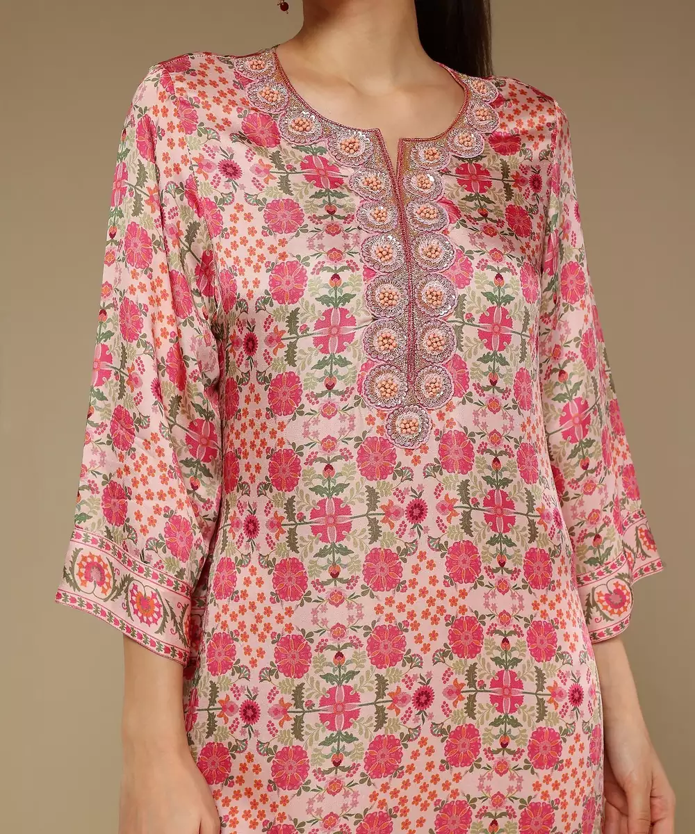 The Long, Straight Cut Kurta Features Vibrant, Detailed All Over Prints That Create A Lively Background. It Is Elevated By Delicate Hand Embroidery, Which Is Typically Showcased On The Yoke, Neckline, Or Sleeve Cuffs. The Side Slits Run High To Offer Comfort And A Modern, Flattering Drape. It's The Perfect Statement Piece For Festive Gatherings Or Elegant Daytime Wear.