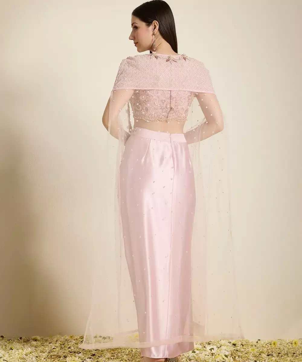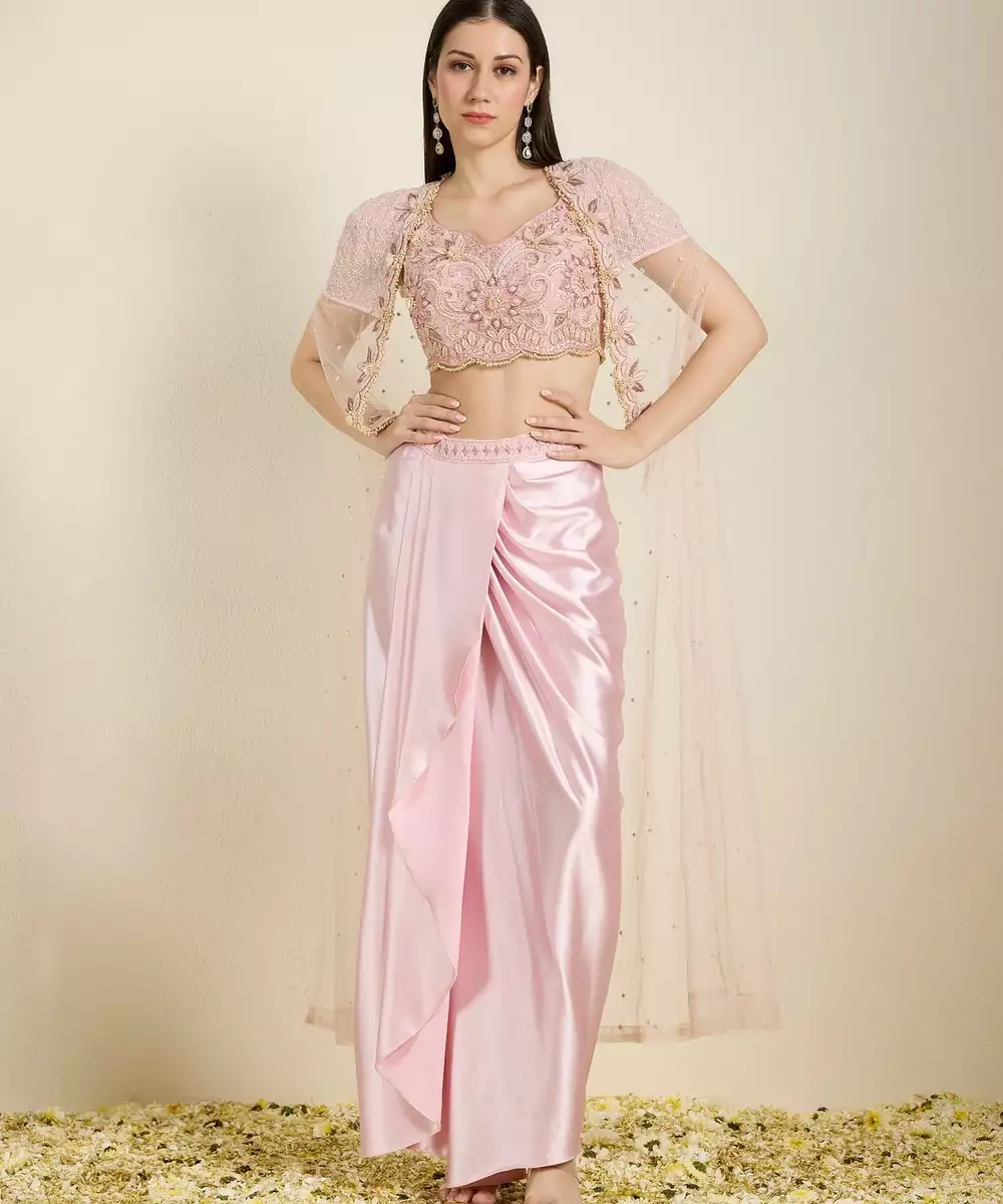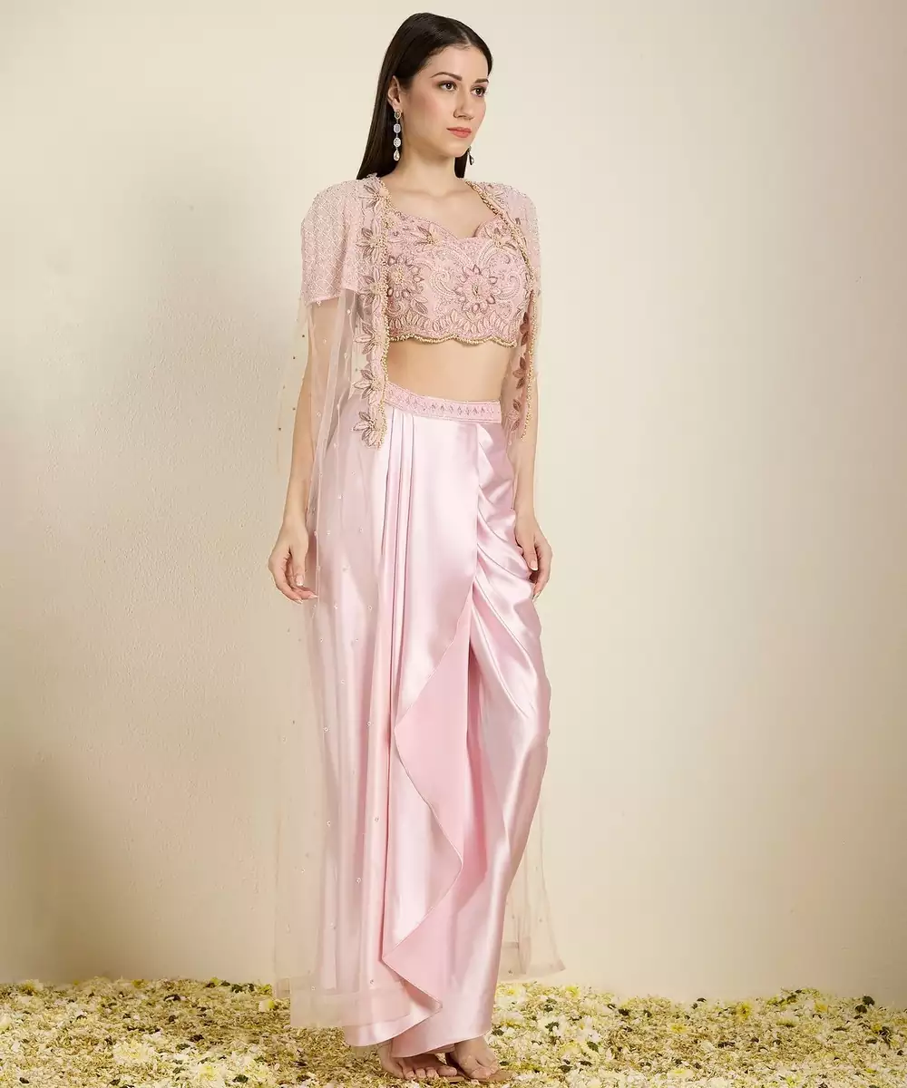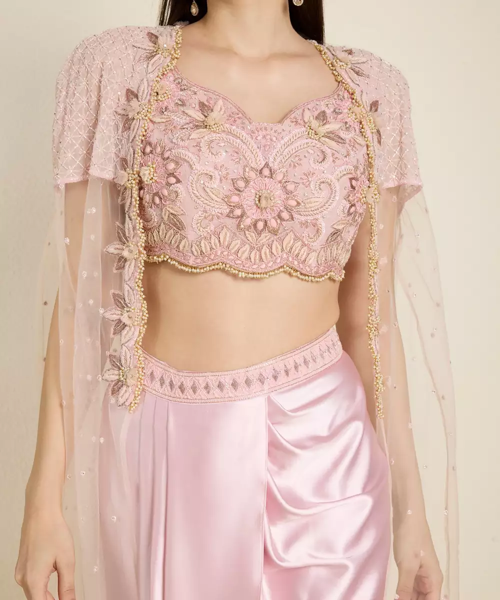 Dusty Rose Pink Pre Draped Skirt Teamed With An Embroidered Blouse And Cape With 3 D Embroidery And Zardozi Work.