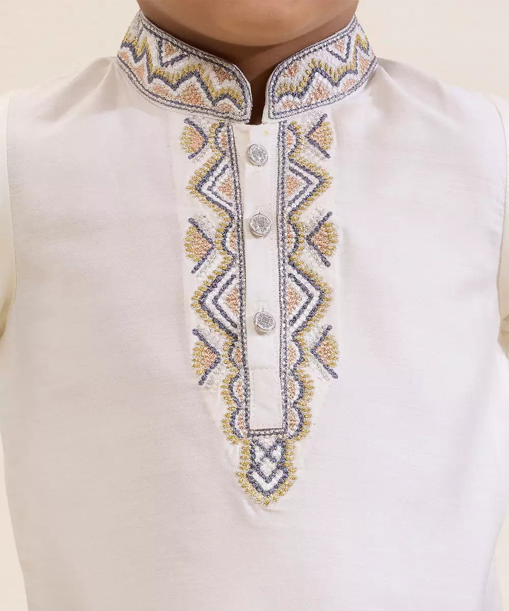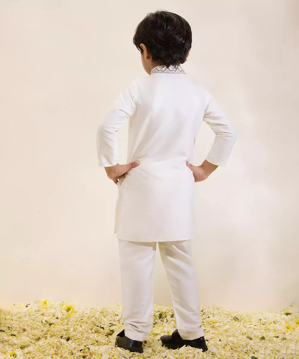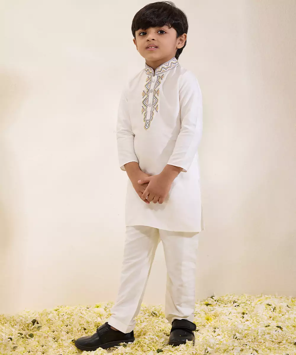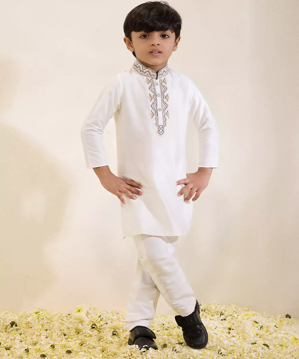 This White Embroidered Silk Kurta Set Exudes Timeless Elegance With Its Luxurious Silk Fabric And Intricate Embroidery. The Soft White Hue Adds A Touch Of Purity And Sophistication. Perfect For Festive Events, Weddings, And Special Occasions, This Ensemble Offers A Graceful Silhouette, Refined Detailing, And A Classic Ethnic Charm.