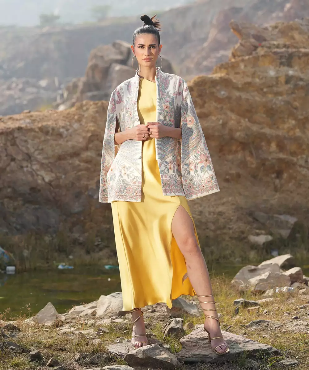 Featuring Paisley Swirl Cape White With Embroidery. Embroidered Cape Style Jacket In Cashmere Wood With Print With Aari And Hand Work Embellished With Sequins And Cutdana.