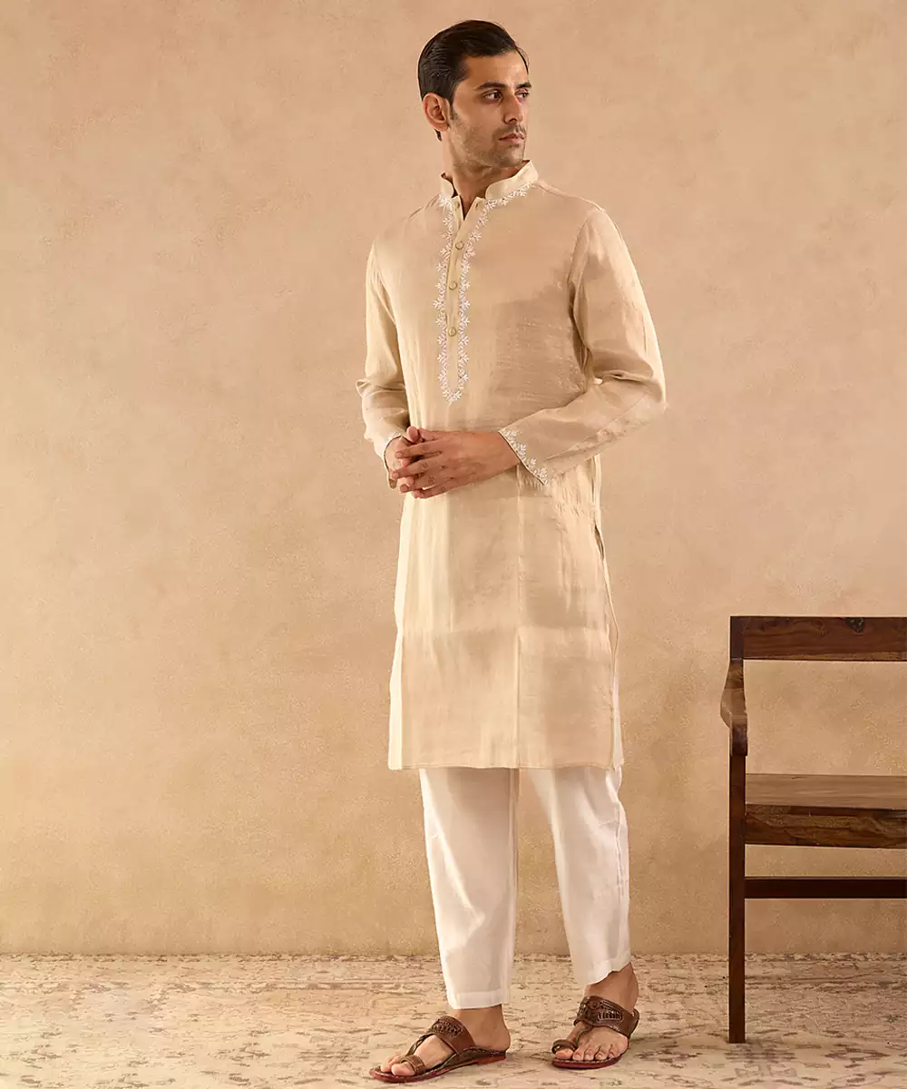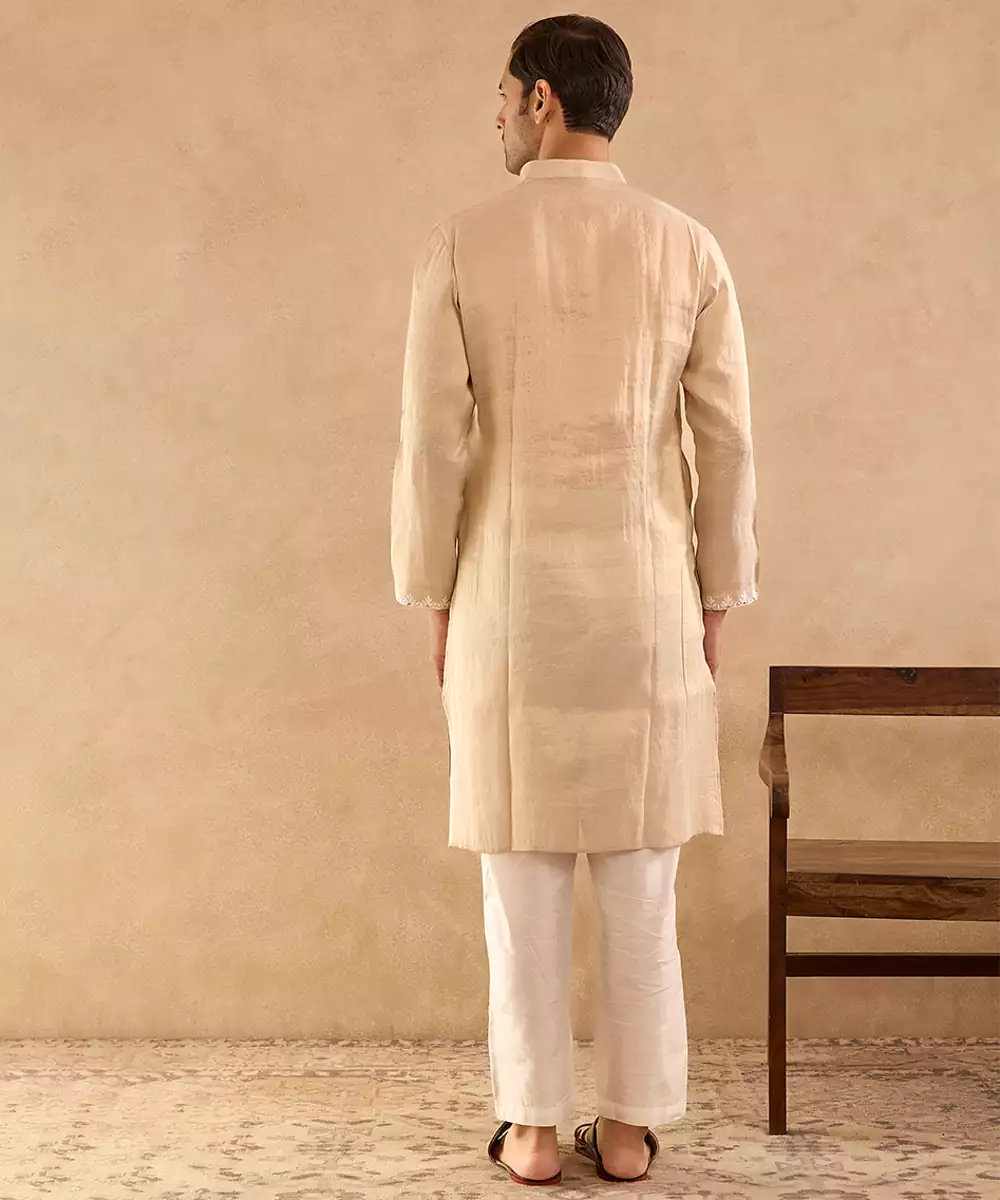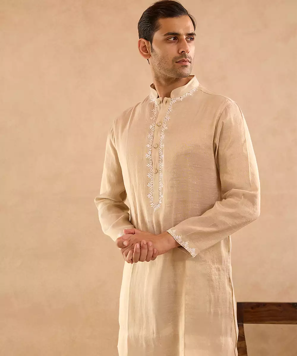 This Beige Embroidered Tissue Kurta Set Features A Finely Embroidered Kurta Paired With A Coordinated Bottom For A Complete Festive Ensemble. Crafted From Soft Tissue Fabric, It Provides Graceful Movement And Comfort. Ideal For Weddings, Festive Functions, And Cultural Celebrations With Elegant Ethnic Appeal.