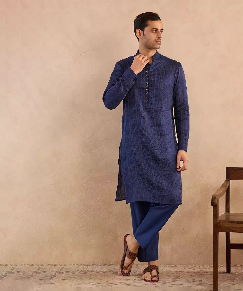 This Blue Embroidered Silk Kurta Set Combines Luxurious Silk Fabric With Intricate Embroidery For A Refined Ethnic Look. The Coordinated Kurta And Bottom Make It Perfect For Weddings, Festive Occasions, And Formal Events, Offering Comfort, Elegance, And Timeless Traditional Charm.