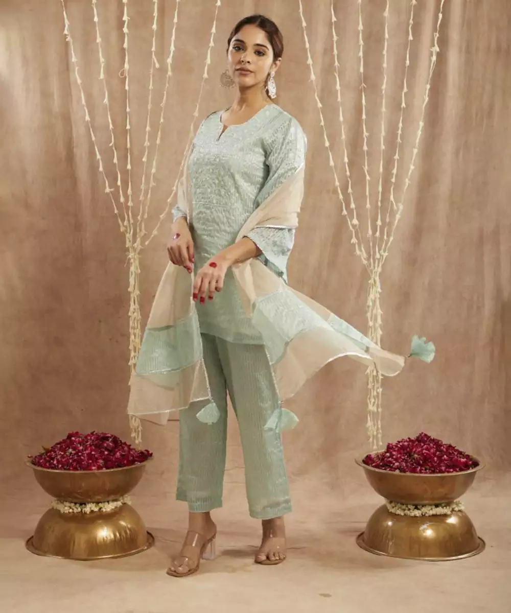 Straight Short Kurta Incorporating Dainty Dori Work On Crushed Tissue Fabric.