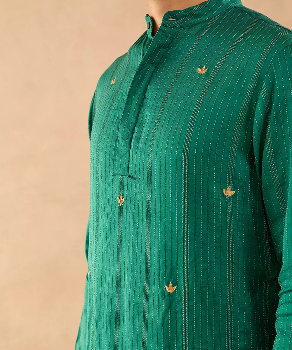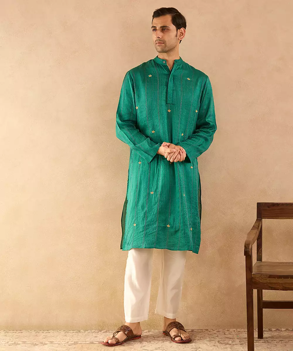 The Green Embroidered Silk Kurta Offers Luxurious Shine And Traditional Beauty. Crafted From Rich Silk Fabric And Adorned With Detailed Embroidery, It Enhances Festive Outfits Effortlessly. Ideal For Weddings, Receptions, And Cultural Celebrations, This Kurta Provides A Sophisticated Look With A Comfortable And Elegant Fit.