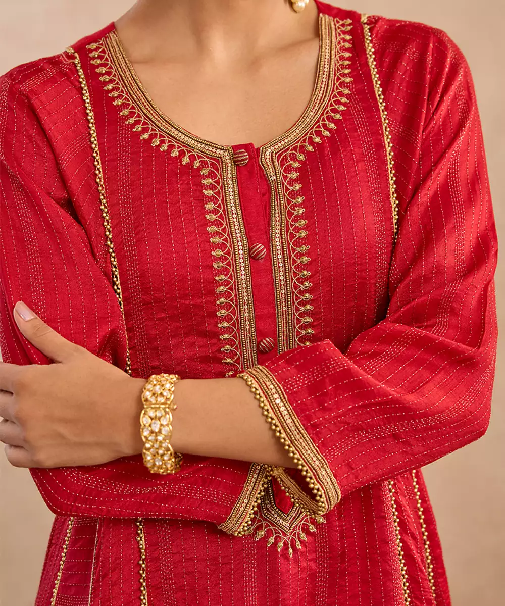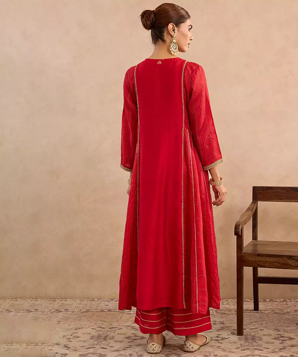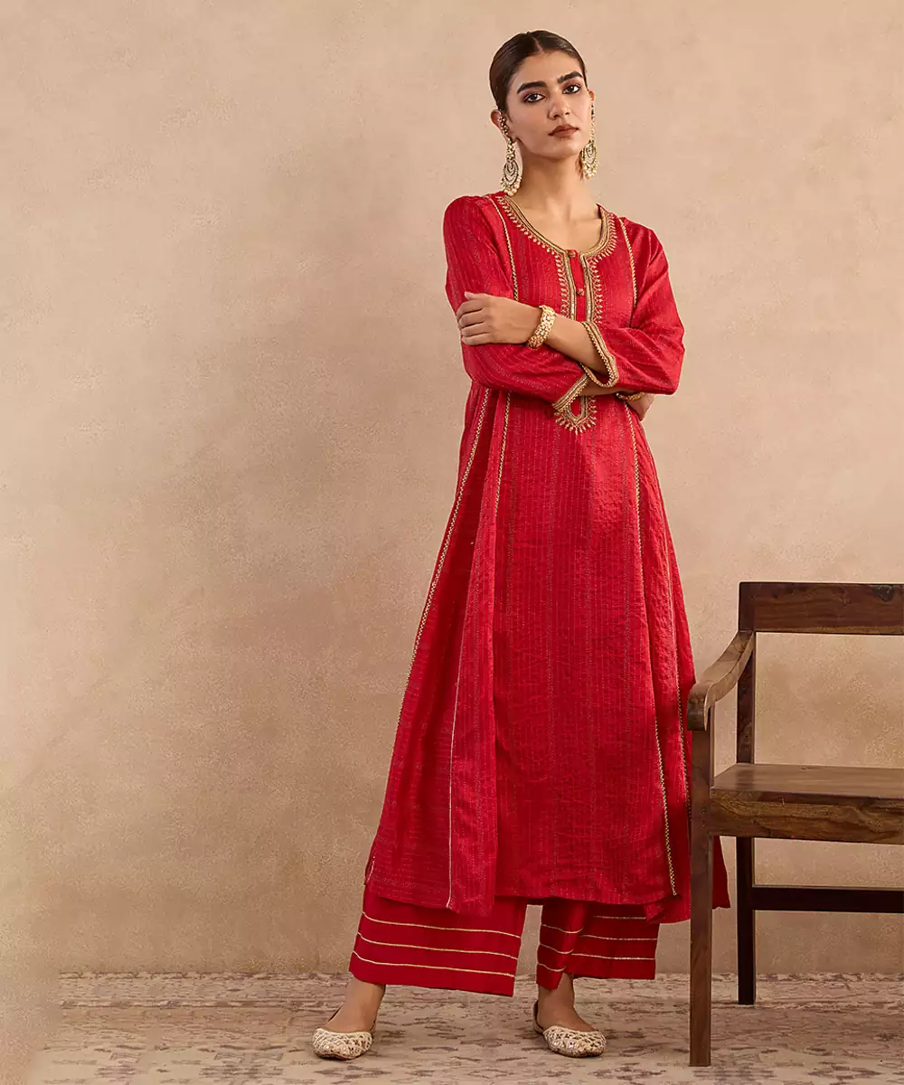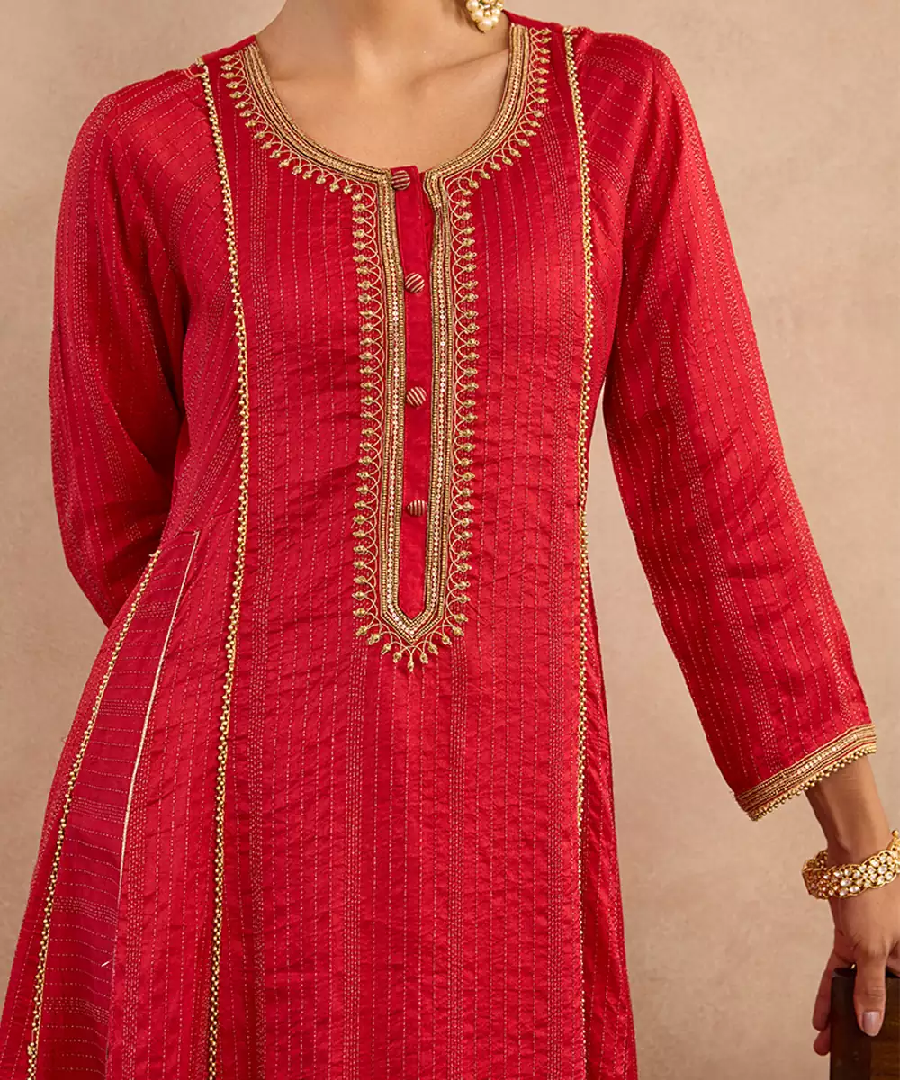 The Red Embroidered Silk Anarkali Set Exudes Royal Charm With Its Rich Silk Fabric And Intricate Embroidery. Its Flared Silhouette Enhances Festive Grandeur, Making It Perfect For Weddings And Special Occasions. Paired With A Matching Churidar And Dupatta, It Delivers Timeless Elegance And Cultural Beauty.