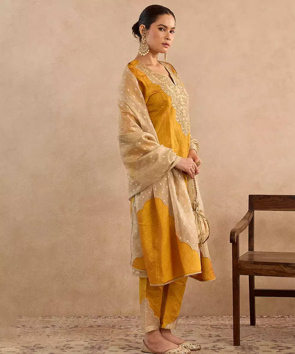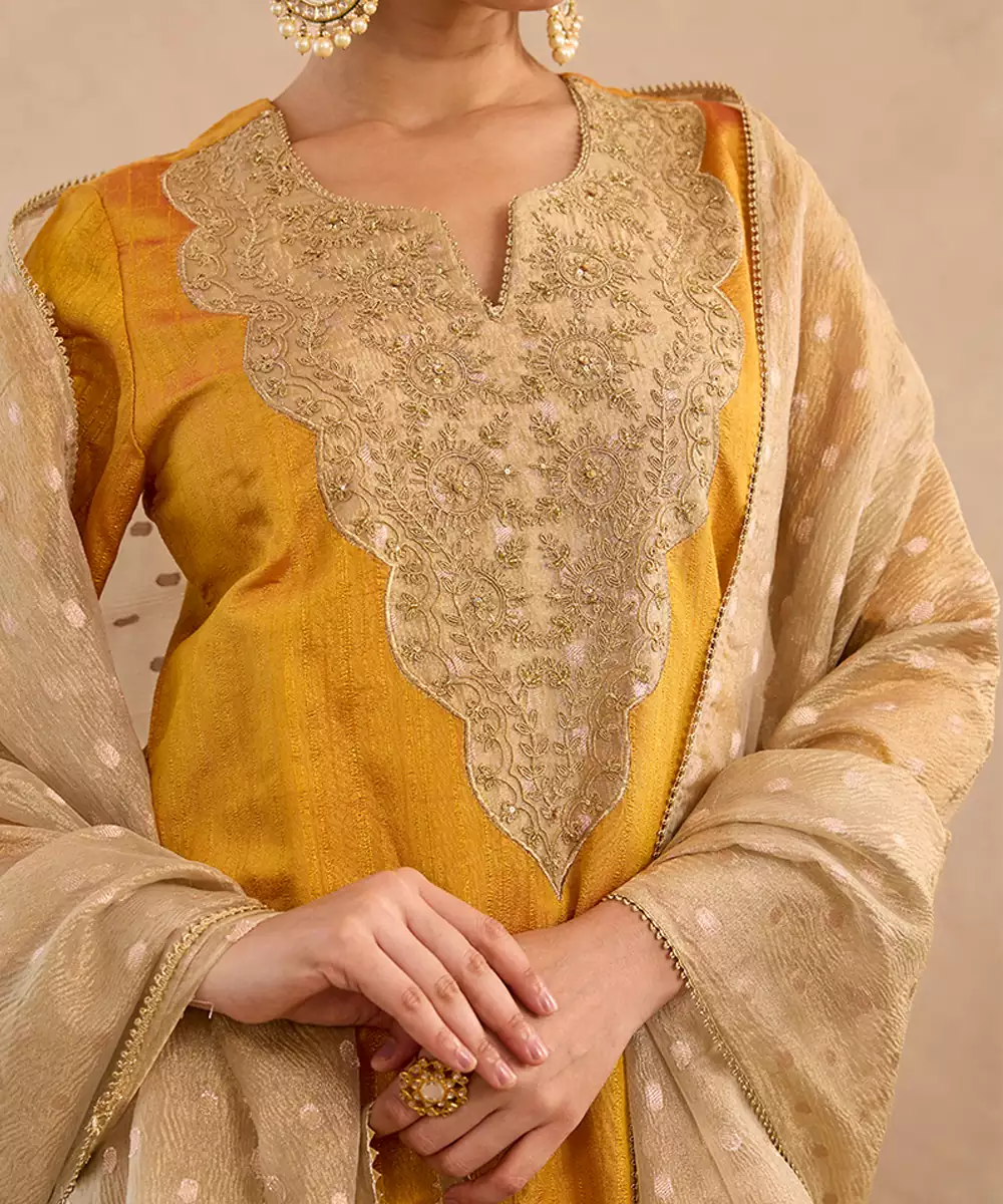 The Yellow Embroidered Raw Silk Kurta Set Brings Brightness And Elegance To Festive Wardrobes. Crafted From Textured Raw Silk Fabric And Detailed With Intricate Embroidery, It Pairs With A Matching Bottom And Dupatta. Ideal For Weddings, Festivals, And Daytime Celebrations, This Set Offers Traditional Charm With Comfort.