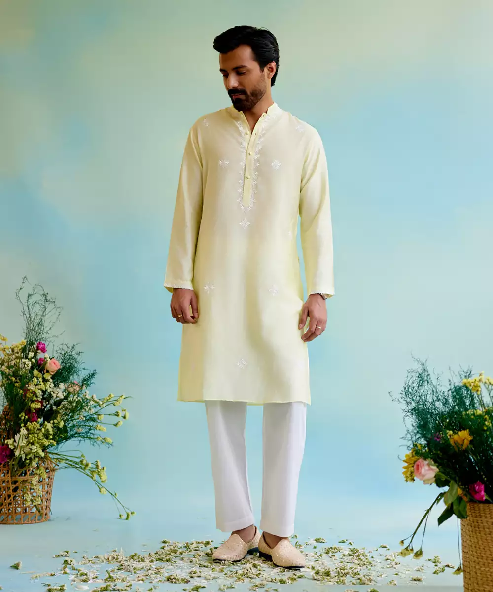 Men's Kurta In Yellow Sunshine Chanderi Fabric With Full Length Sleeves.