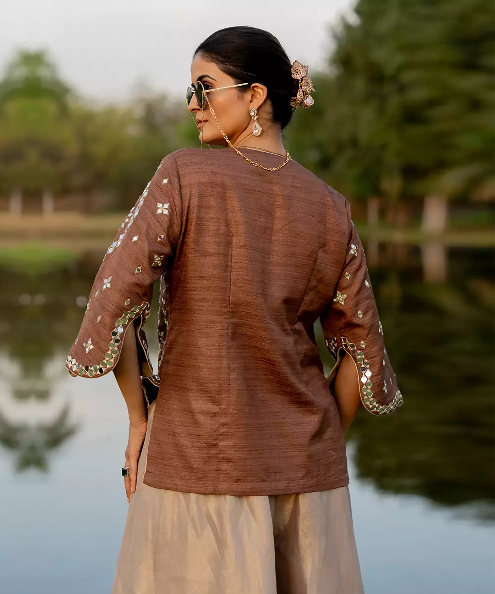 Bronze Short Kurta Featuring Mirror Embroidery All Over. Paired With A Solid Sharara.