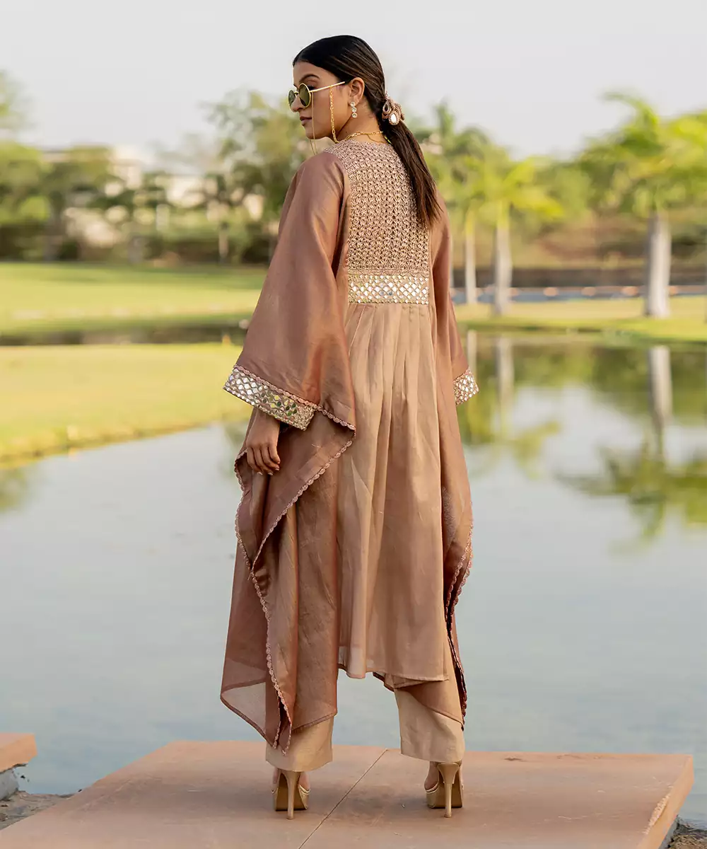 Rose Gold Kaftan Featuring Mirror Embroidery In The Front, Waist And Sleeve Hem. Paired With A Solid Pant.