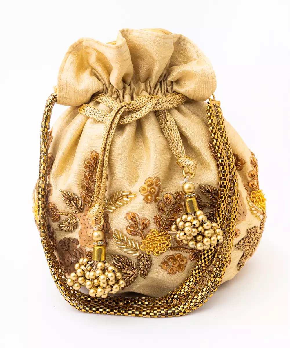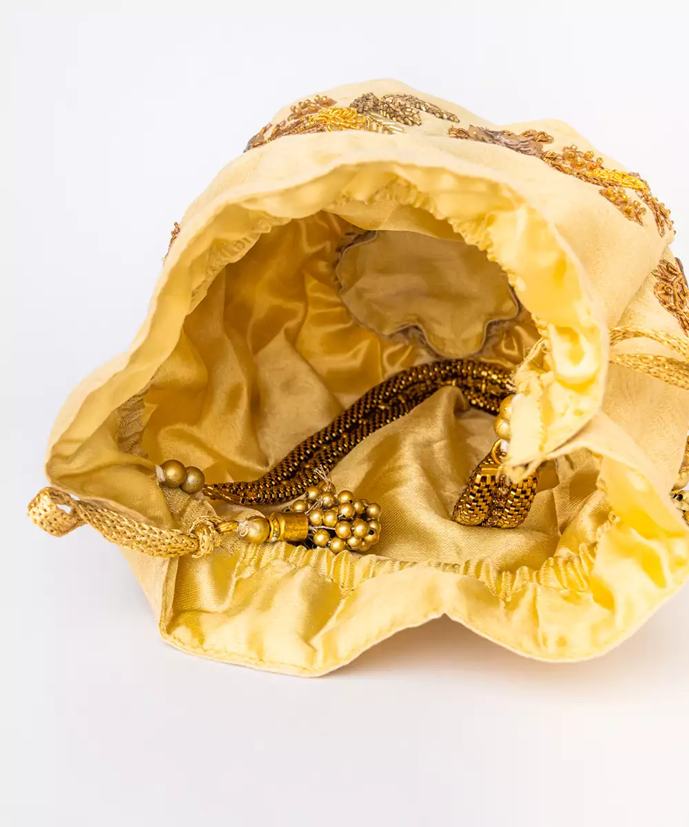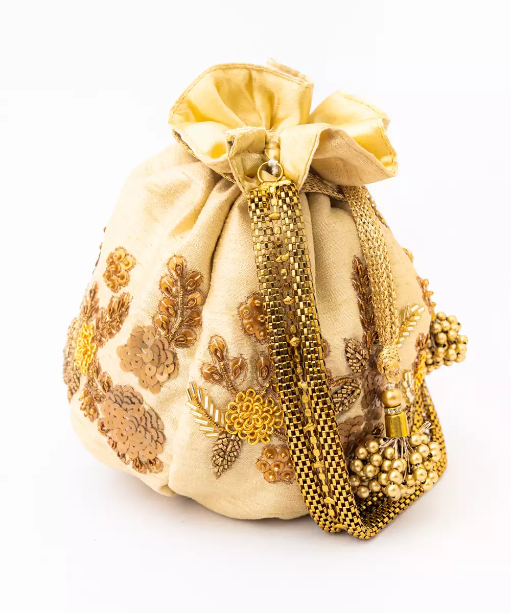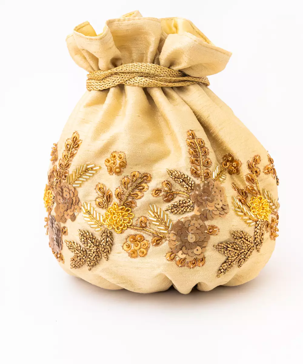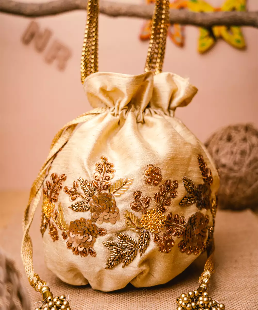 Graceful Potli Bag In Cream With Intricate One Side Hand Embroidery. Other Side Crafted In Matching Toned Fabric For Subtle Elegance. Features A Traditional Drawstring Closure With Premium Inner Lining. Spacious Enough To Fit Phones Of Nearly All Sizes And Festive Essentials. Style Note: Pair With Mirrorwork Lehengas Or Silk Sarees For A Timeless, Artisan Chic Charm.
