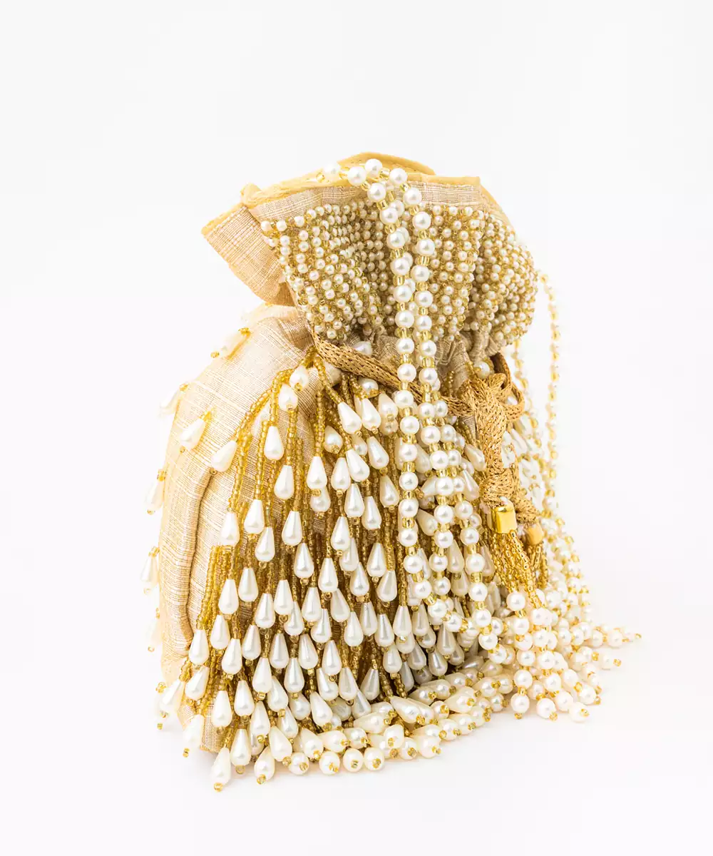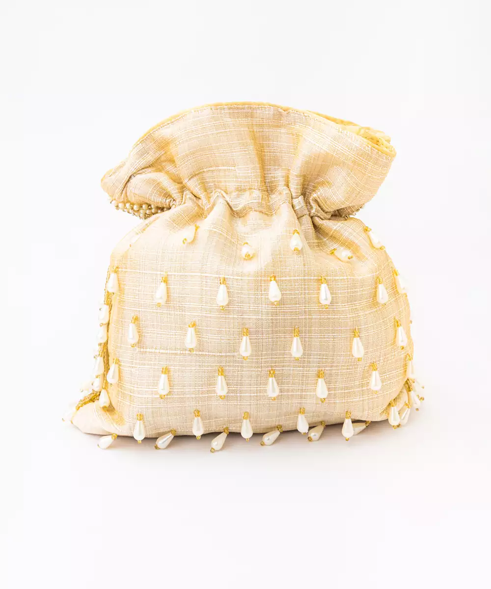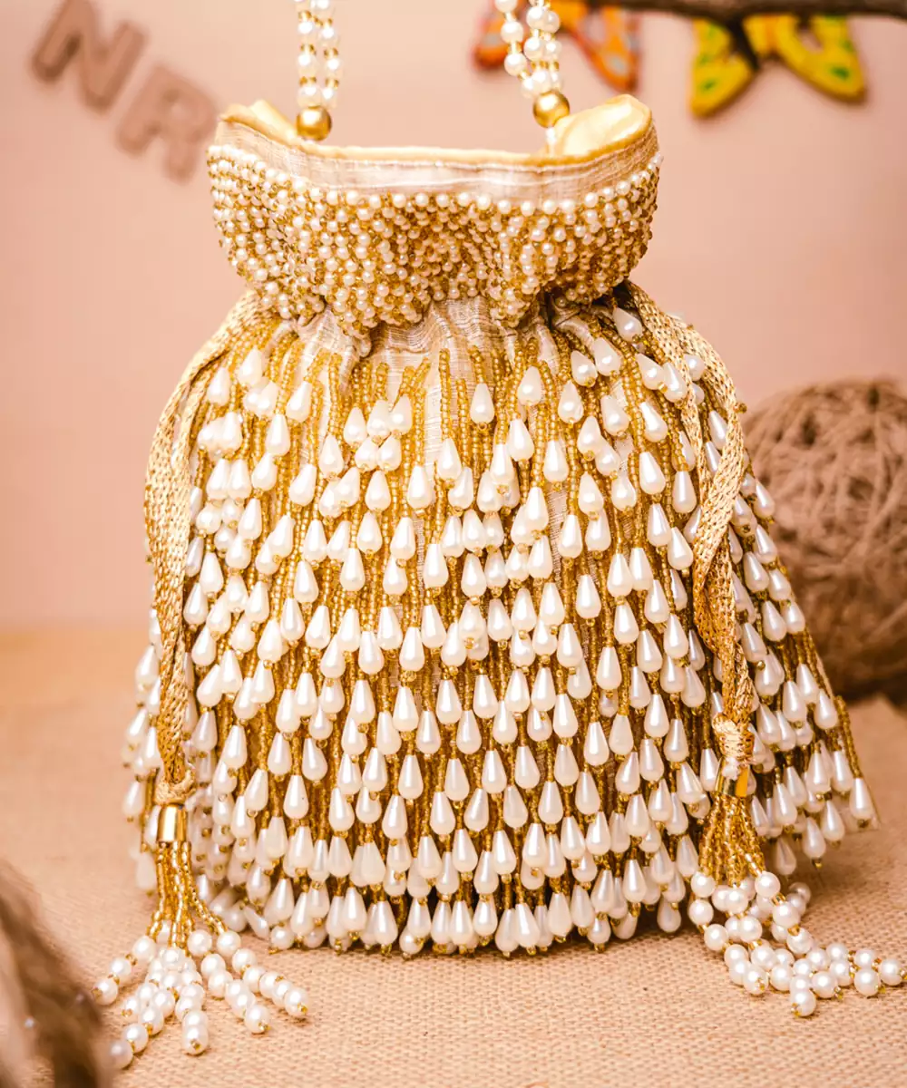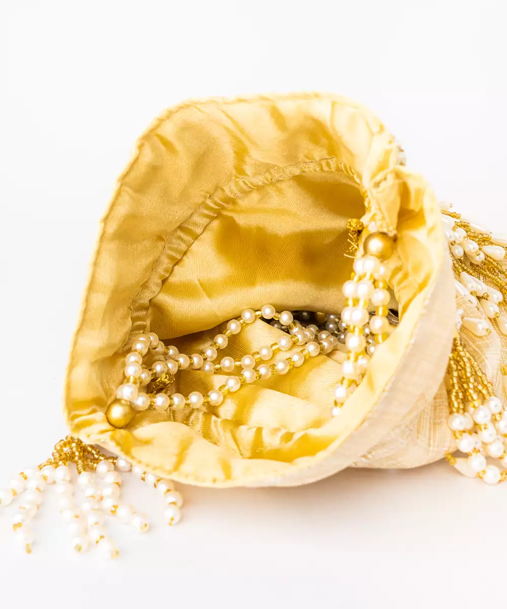 Embellished In Subtle Cream And White Hues With Intricate Detailing For A Refined Ethnic Look. Classic Potli Silhouette Paired With Drawstring Closure For Secure And Graceful Storage. One Main Compartment Ideal For Carrying Wedding Or Festive Essentials. Comes With A Wrist Loop For Ornamental Handheld Styling And Easy Portability. A Timeless Piece Perfect For Cultural Events, Traditional...