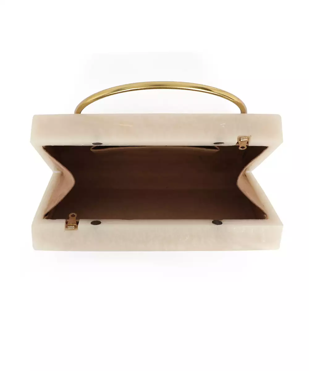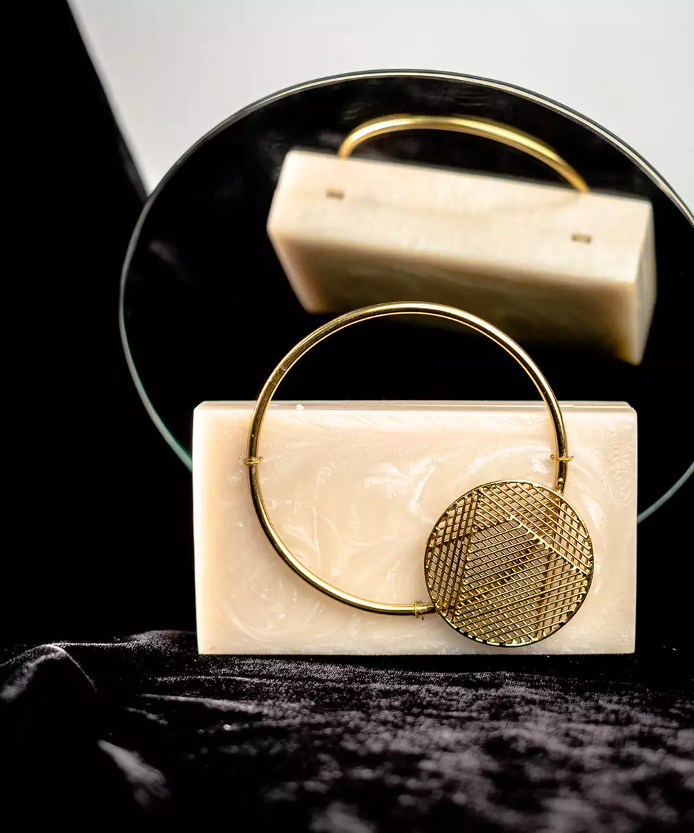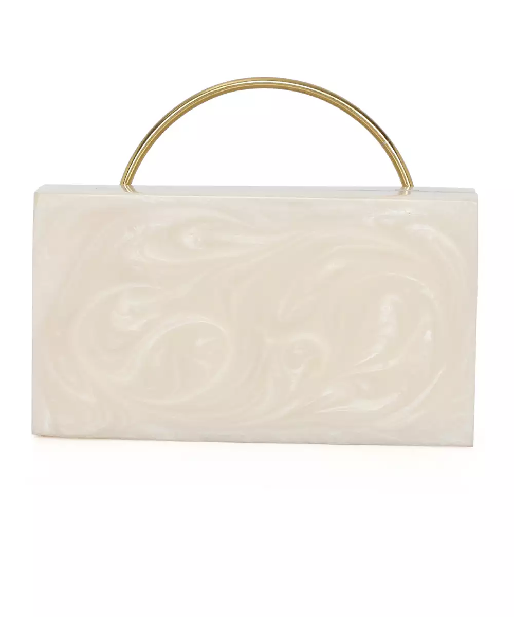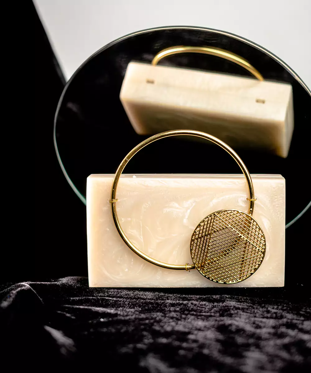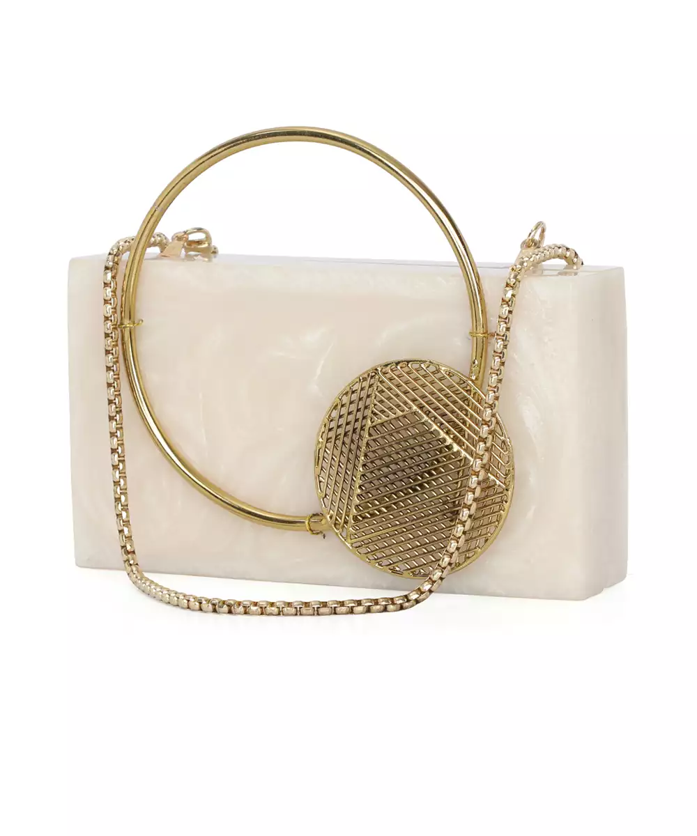 Elegant Beige Clutch Featuring Rich Gold Detailing And Intricate Embellishments. Structured Box Silhouette Offers Timeless Festive Charm. Comes With A Shoulder Strap For Easy, Hands Free Styling. Style Note: Pair With Neutral Toned Lehengas Or Embroidered Suits For A Refined And Graceful Accent. Single Main Compartment Secured By A Sturdy Click Closure.