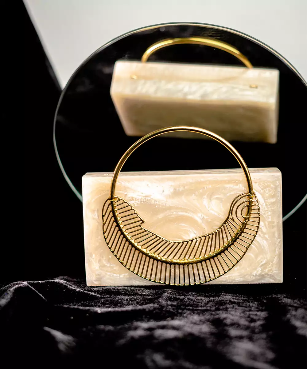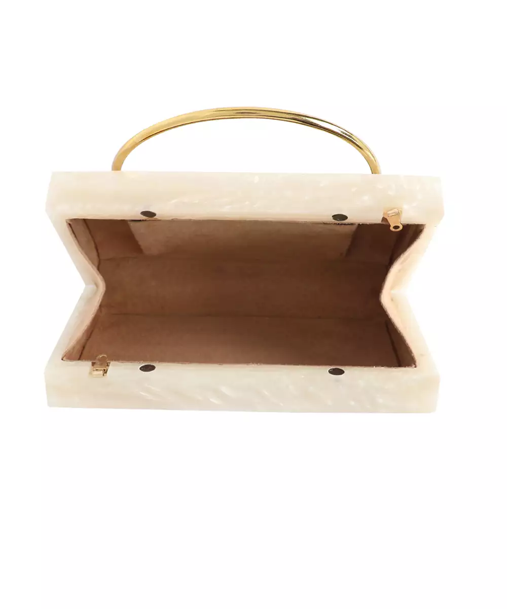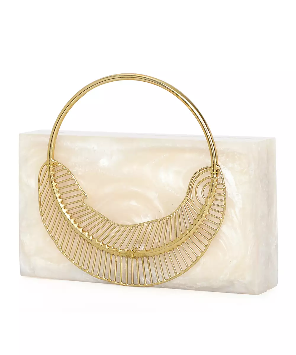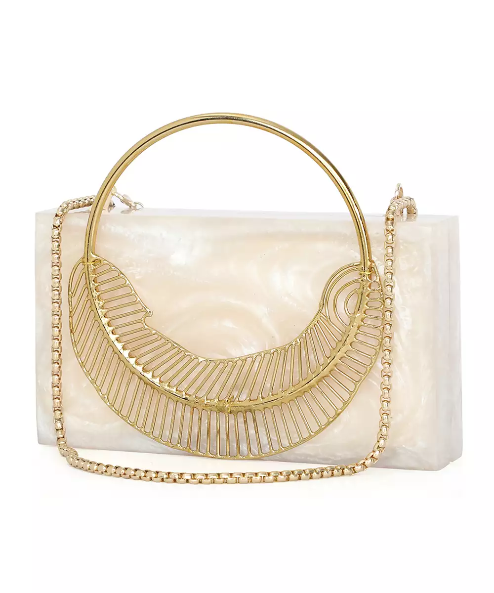 Elegant Beige Clutch Adorned With Gold Toned Feather Style Embellishments For A Distinctive Festive Accent. Structured Box Silhouette Adds Sophistication And Charm To Occasion Looks. Comes With A Shoulder Strap For Hands Free Comfort And Easy Styling. Style Note: Pair With Beige Embroidered Suits Or Gold Detailed Lehengas For A Graceful, Coordinated Ensemble. Includes One Spacious Main...