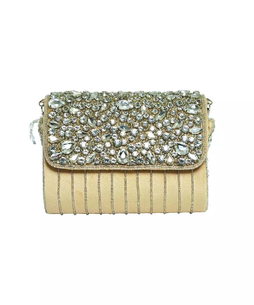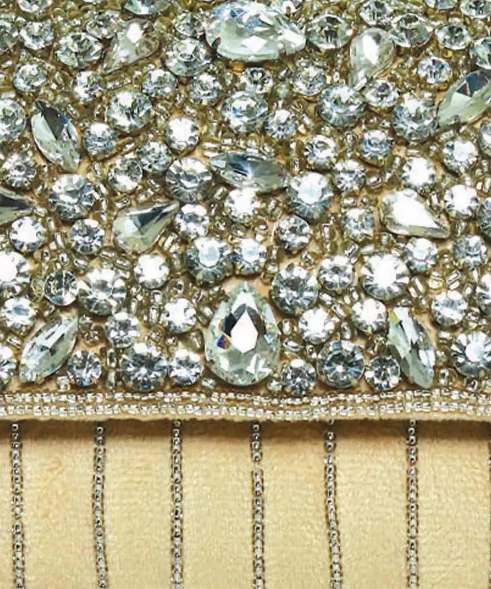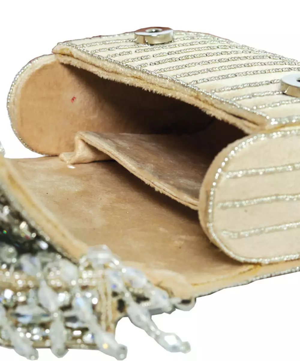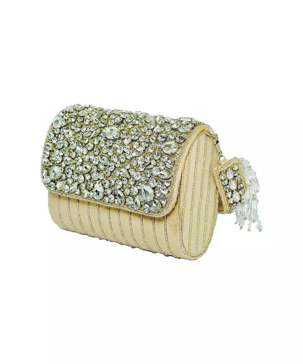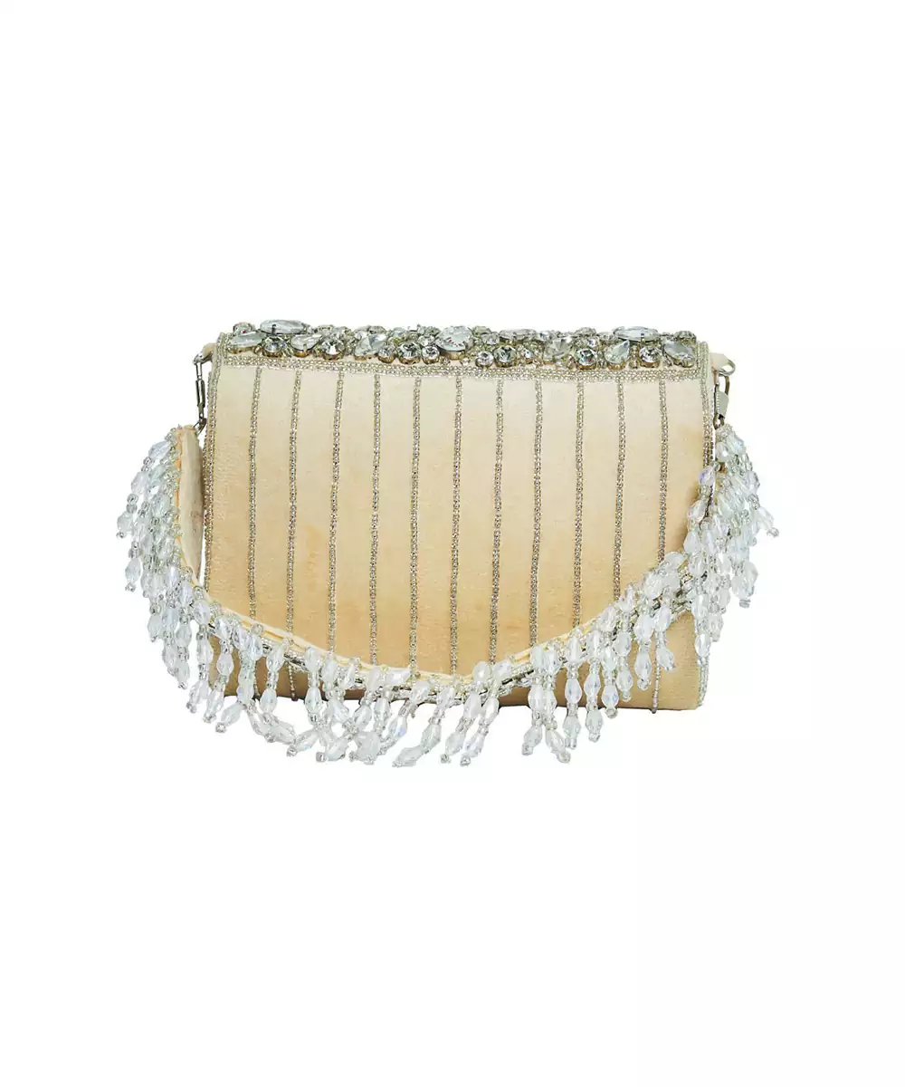 Crafted In A Soft Cream Hue With Glimmering Diamond Accents For Festive Charm. Features Intricate Embroidery And Playful Tassels For An Eye Catching Look. Comes With A Convenient Wrist Loop For Hands Free Styling. Includes One Main Compartment With Secure Button Closure. Style Note: Perfect For Weddings And Soirées—Pair With A Sequined Saree And Heels.