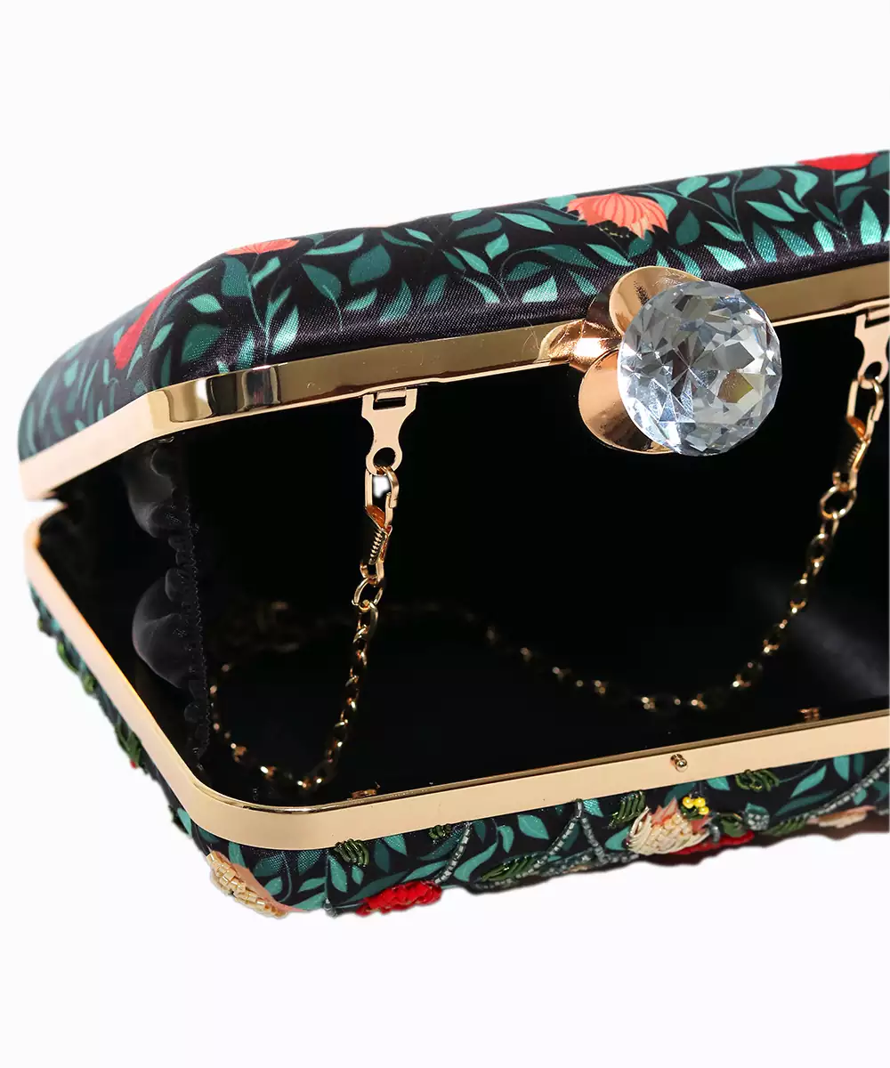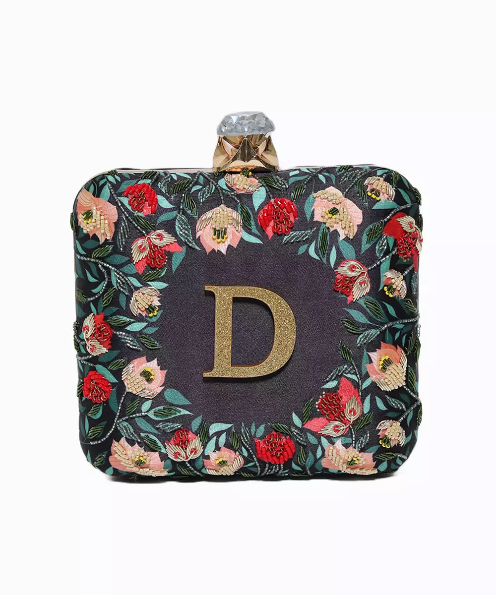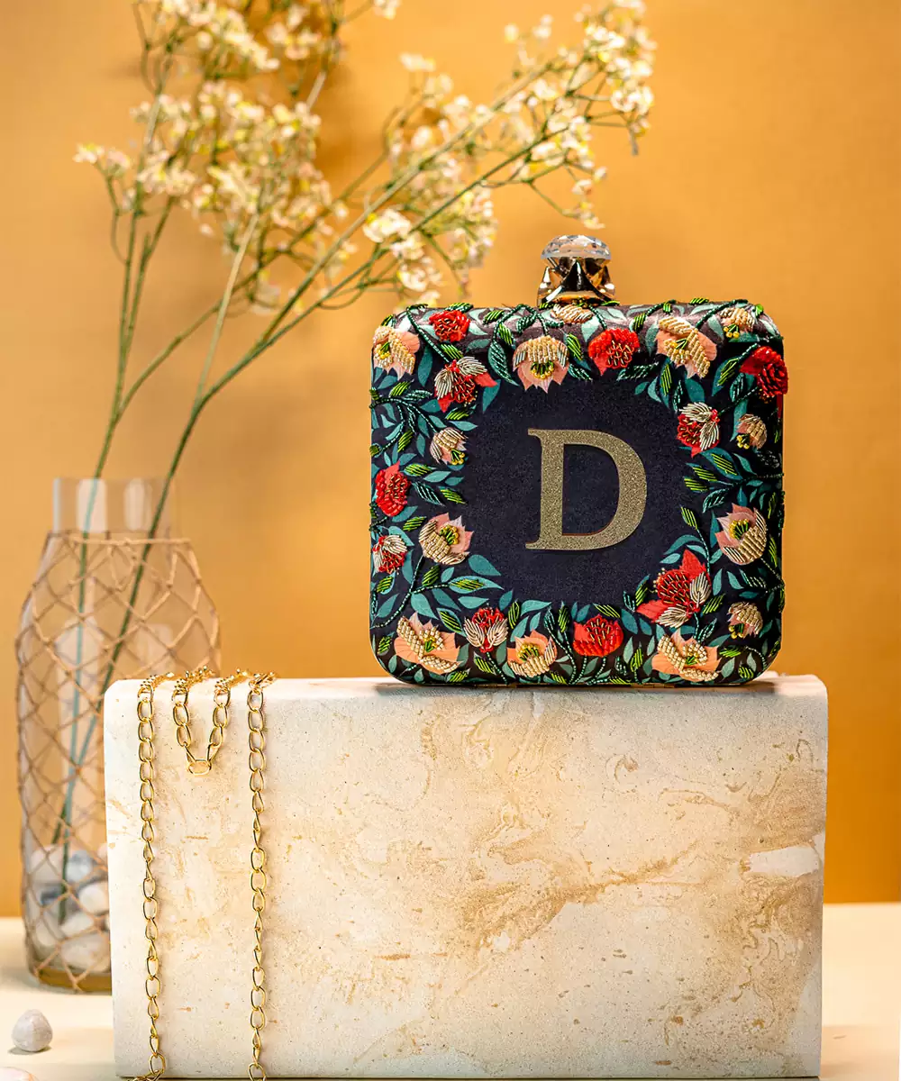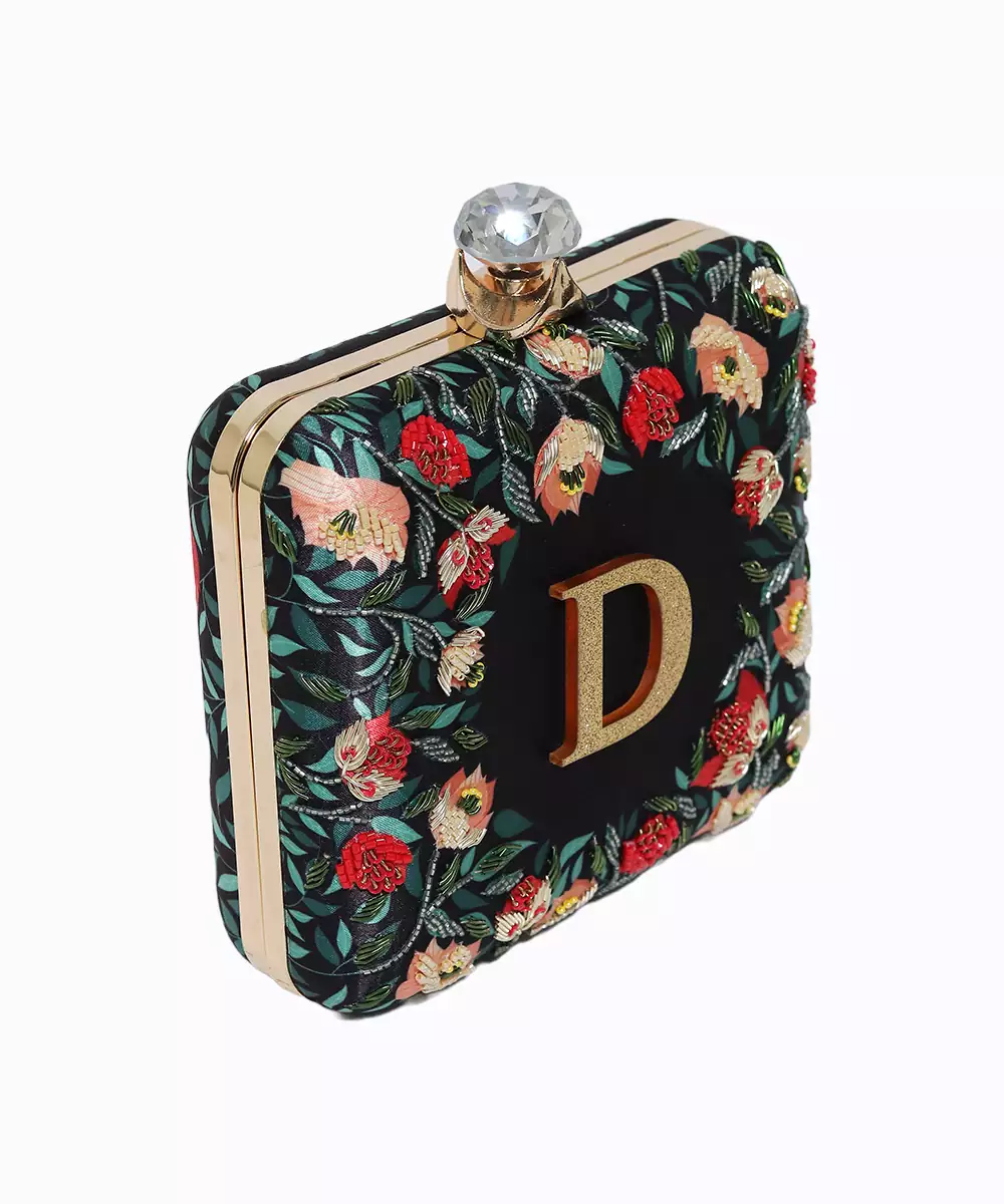 Showcases Vibrant Black, Green, And Red Floral Printed Back With Elegant Embroidered Detailing On The Front Panel. Features A Standout Alphabet 'd' Motif For Personalized Expression. Structured Box Silhouette With Click Closure Secures Essentials Stylishly. Comes With A Shoulder Strap For Comfortable Crossbody Or Handheld Carry. A Festive Pick For Events, Gifting, Or Personalized Fashion...