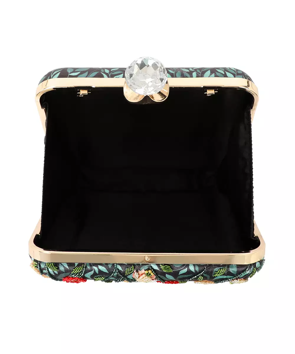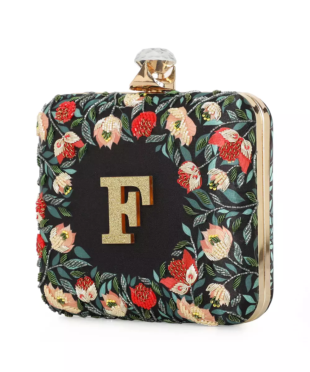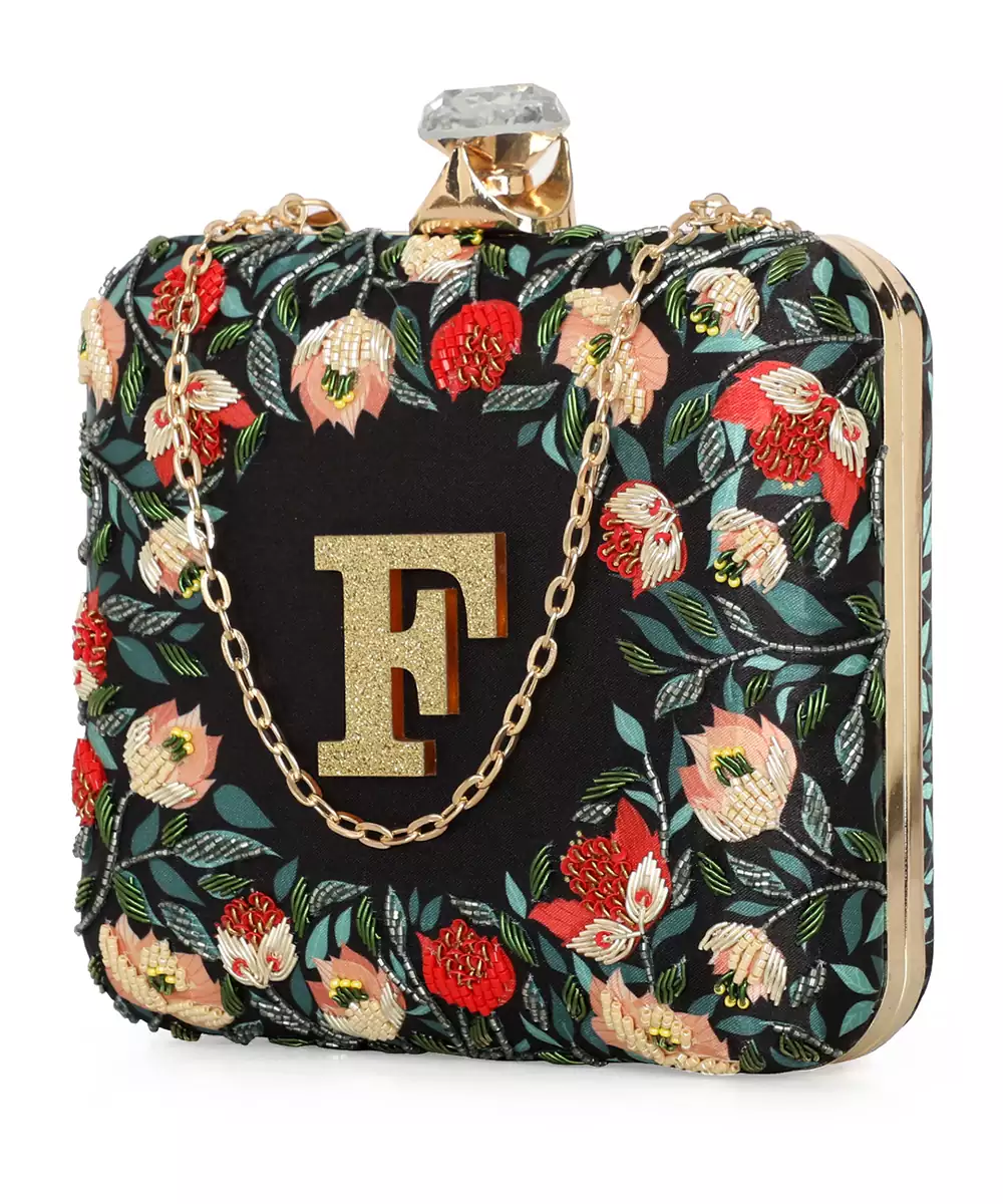 Showcases Vibrant Black, Green, And Red Floral Printed Back With Elegant Embroidered Detailing On The Front Panel. Features A Standout Alphabet 'f' Motif For Personalized Expression. Structured Box Silhouette With Click Closure Secures Essentials Stylishly. Comes With A Shoulder Strap For Comfortable Crossbody Or Handheld Carry. A Festive Pick For Events, Gifting, Or Personalized Fashion...