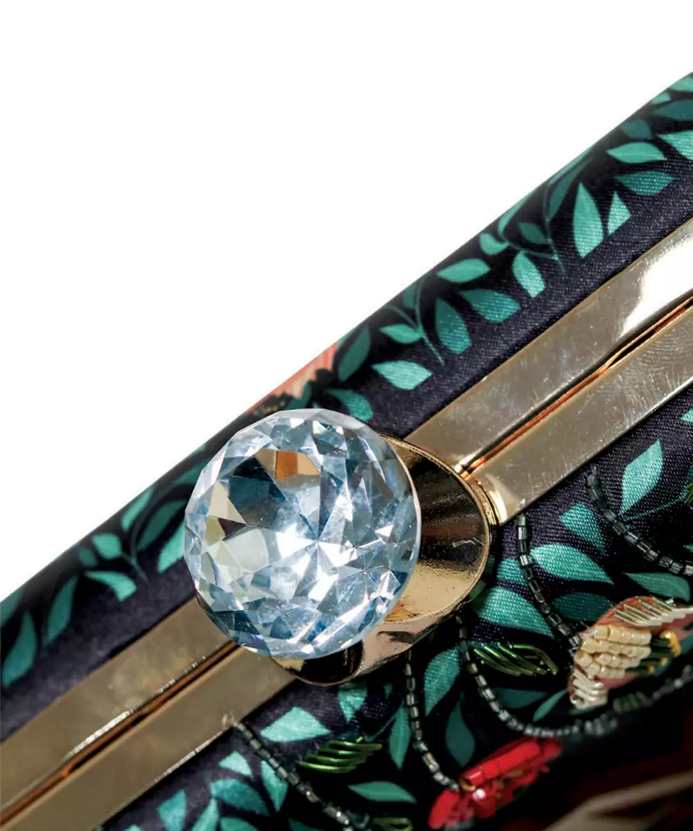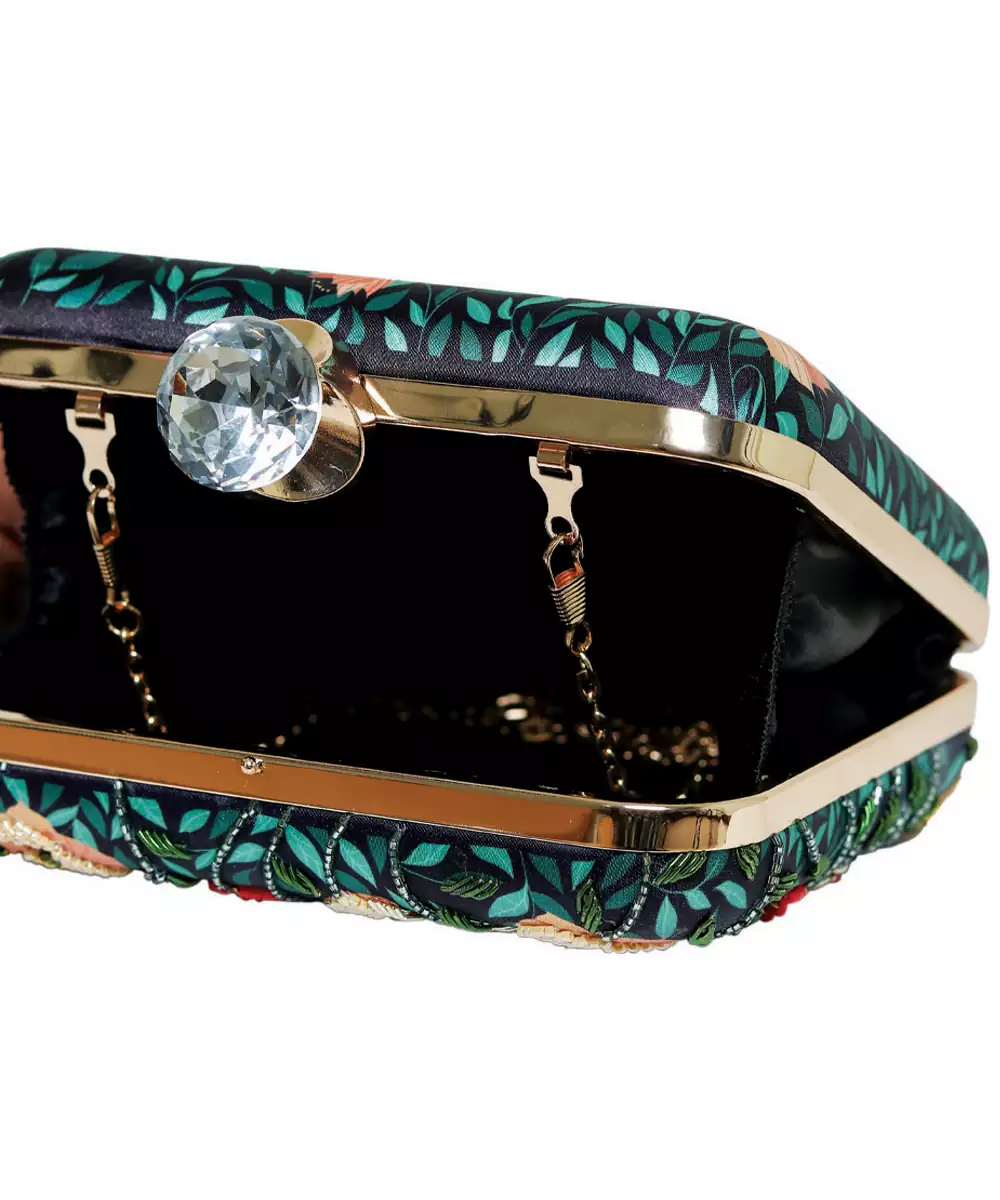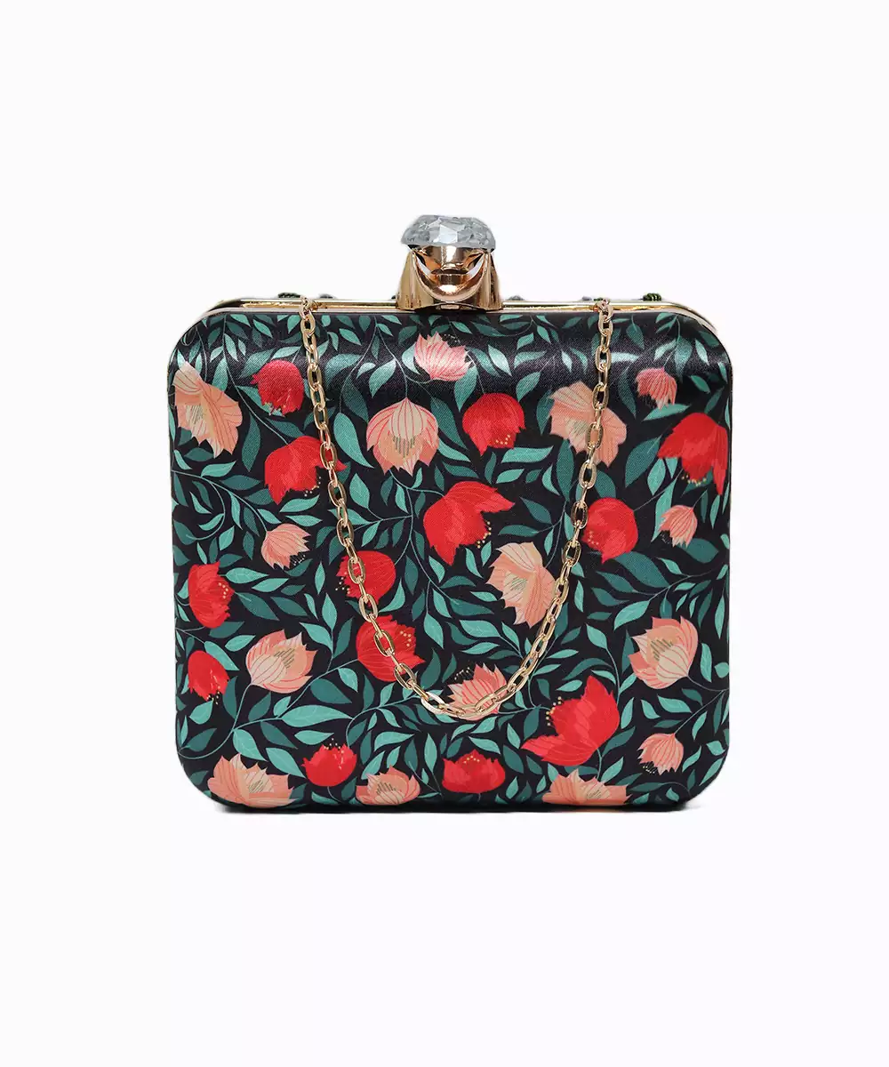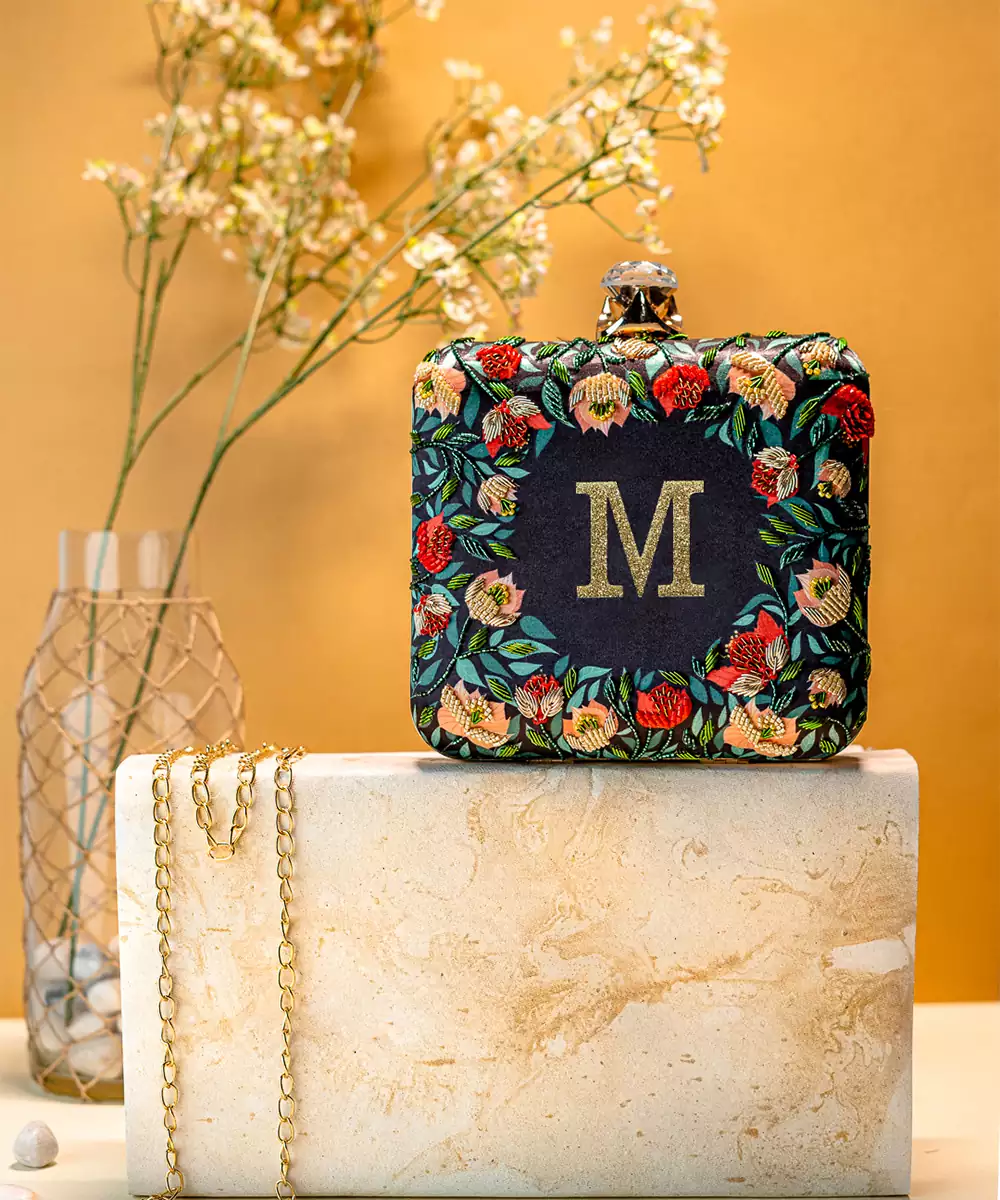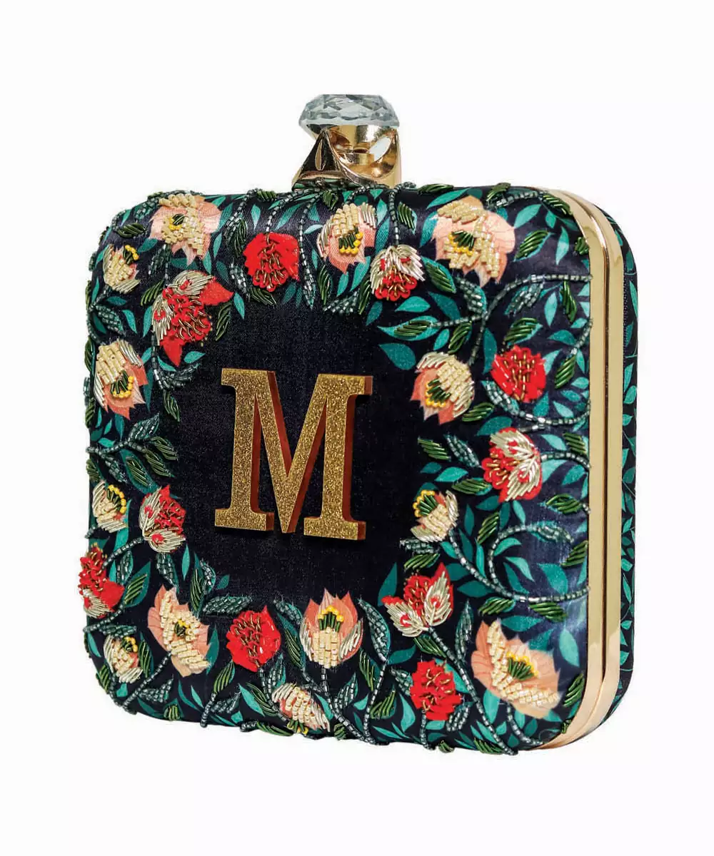 Showcases Vibrant Black, Green, And Red Floral Printed Back With Elegant Embroidered Detailing On The Front Panel. Features A Standout Alphabet 'm' Motif For Personalized Expression. Structured Box Silhouette With Click Closure Secures Essentials Stylishly. Comes With A Shoulder Strap For Comfortable Crossbody Or Handheld Carry. A Festive Pick For Events, Gifting, Or Personalized Fashion...