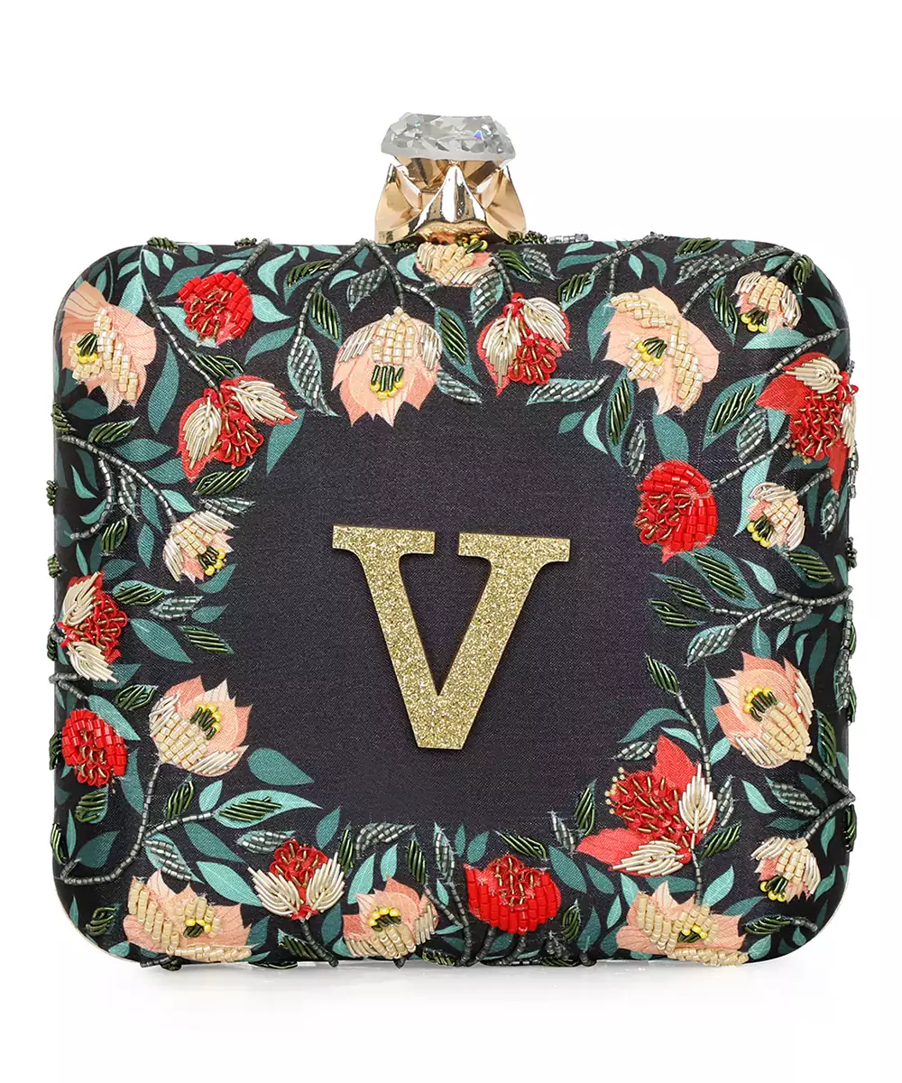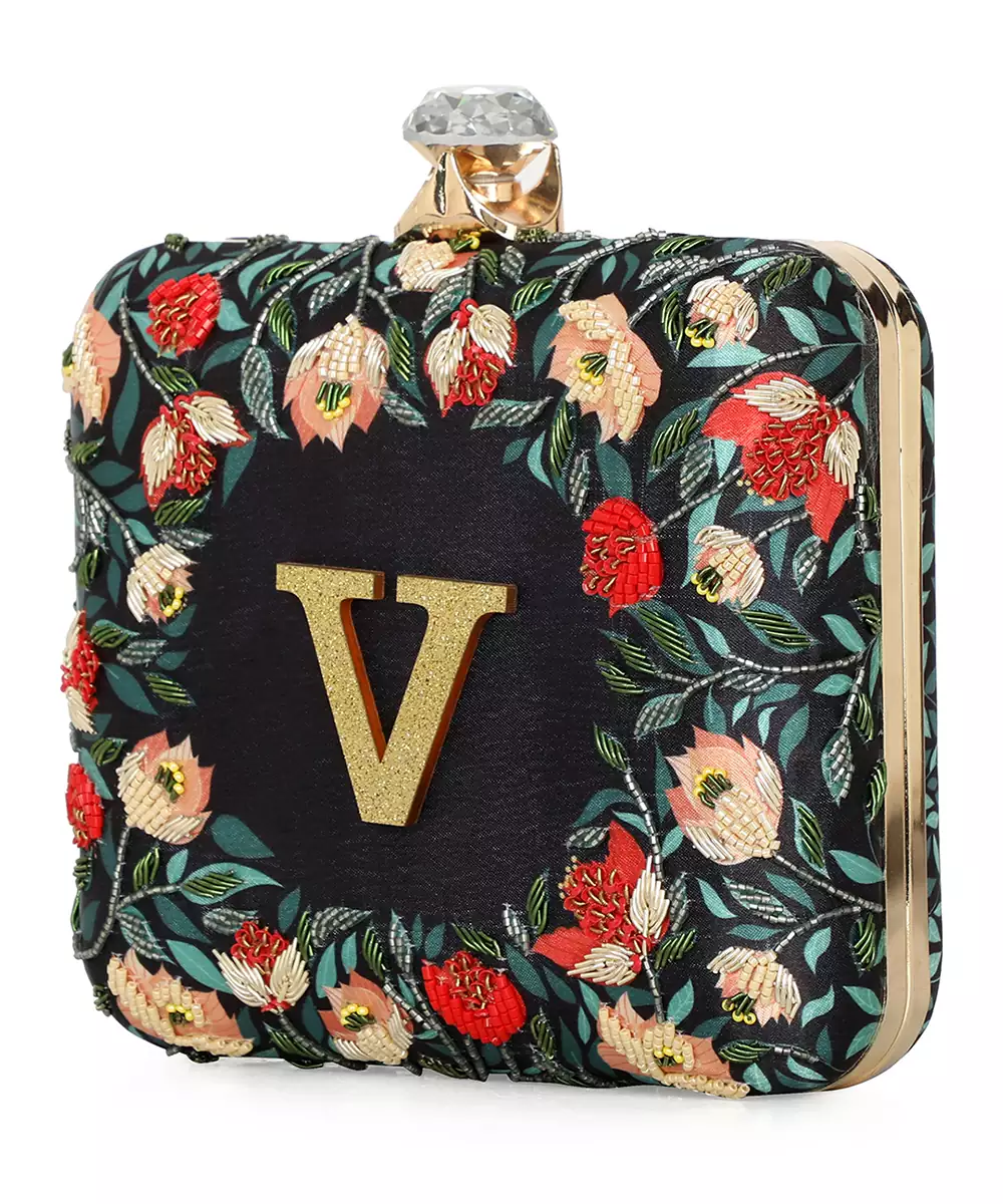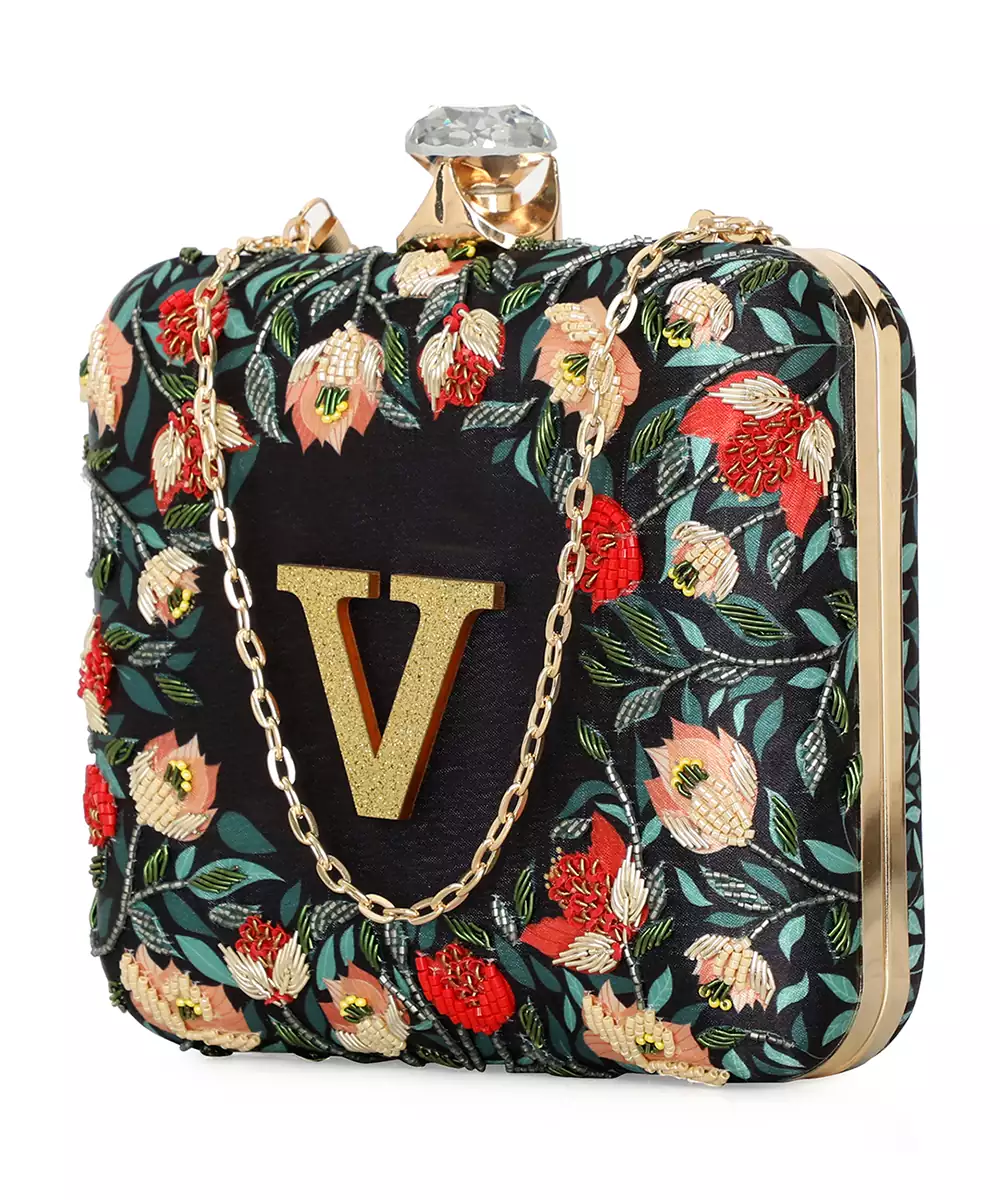 Showcases Vibrant Black, Green, And Red Floral Printed Back With Elegant Embroidered Detailing On The Front Panel. Features A Standout Alphabet 'v' Motif For Personalized Expression. Structured Box Silhouette With Click Closure Secures Essentials Stylishly. Comes With A Shoulder Strap For Comfortable Crossbody Or Handheld Carry. A Festive Pick For Events, Gifting, Or Personalized Fashion...
