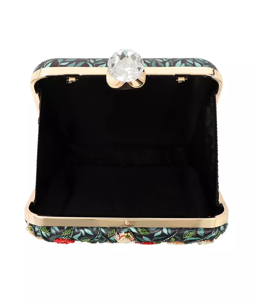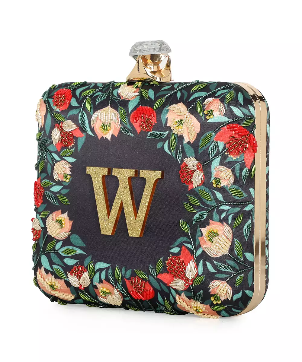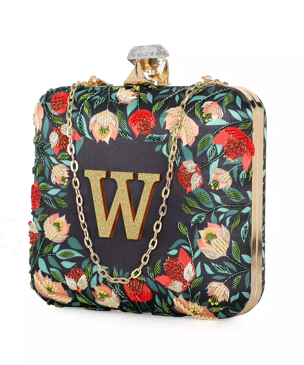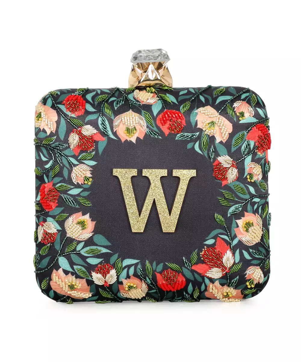 Showcases Vibrant Black, Green, And Red Floral Printed Back With Elegant Embroidered Detailing On The Front Panel. Features A Standout Alphabet 'w' Motif For Personalized Expression. Structured Box Silhouette With Click Closure Secures Essentials Stylishly. Comes With A Shoulder Strap For Comfortable Crossbody Or Handheld Carry. A Festive Pick For Events, Gifting, Or Personalized Fashion...